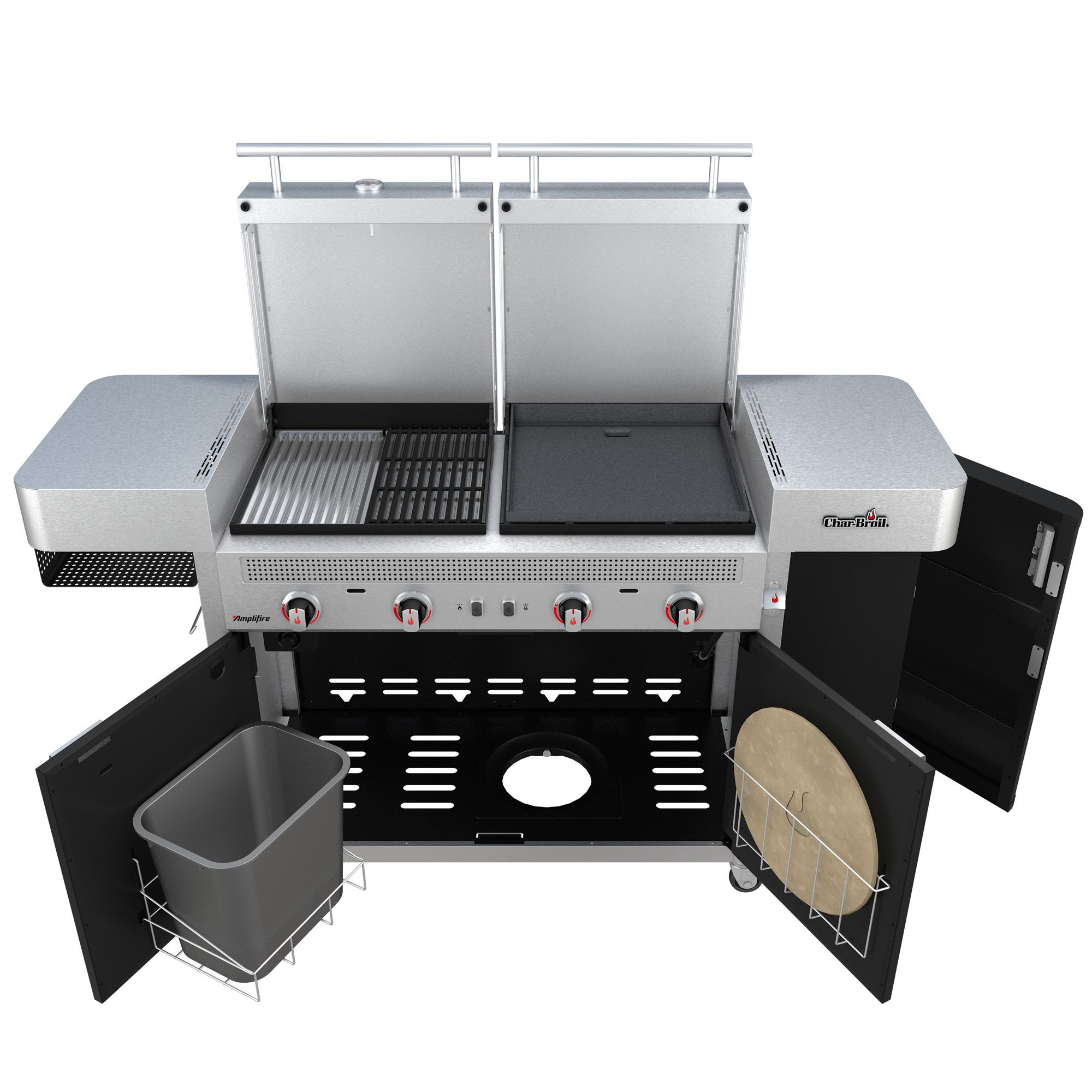 Crush your next cookout with the Char-Broil Vista, the outdoor kitchen with everything you need to entertain with style. Grill a juicy steak while you stir-fry veggies on the griddle or change it up and bake a gourmet pizza. Use the spacious side cabinet to stock your favorite seasonings in the spice rack and store your tools in the plastic bins. When the party’s over, clean-up is quick and easy with paper towels at-the-ready, a trash can on deck and two large, removable bins to carry the dishes inside.