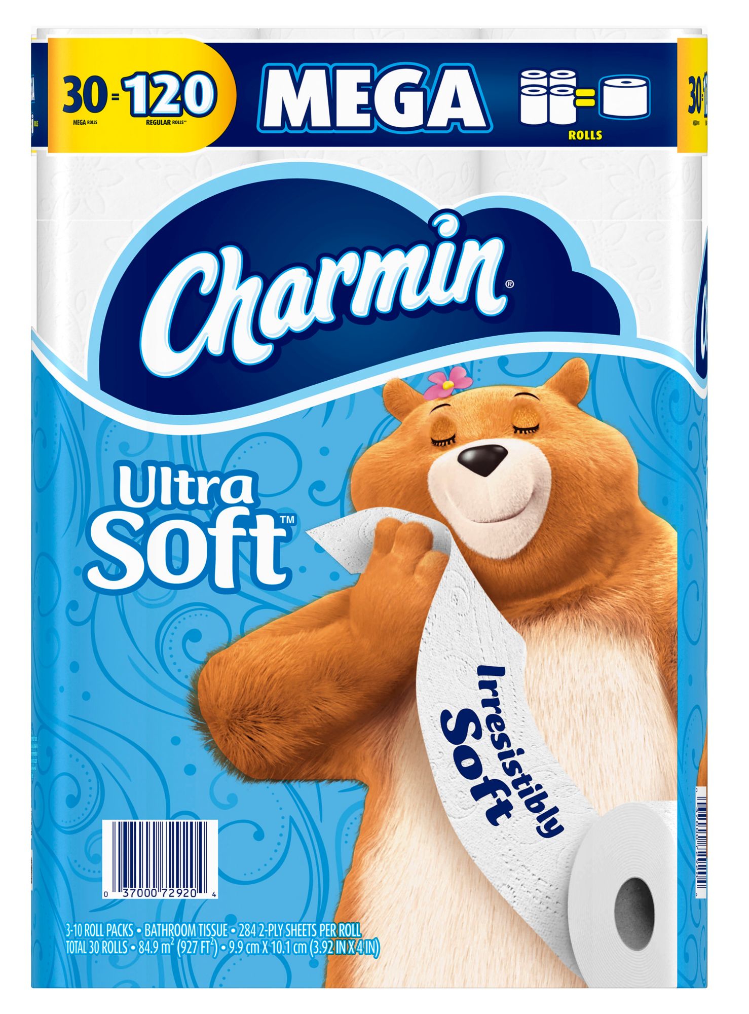 1 Charmin Mega Roll = 4 Regular Rolls* The softer way to get clean and use less** Clog-safe and septic-safe Roto-Rooter approved Includes 30 rolls of toilet paper