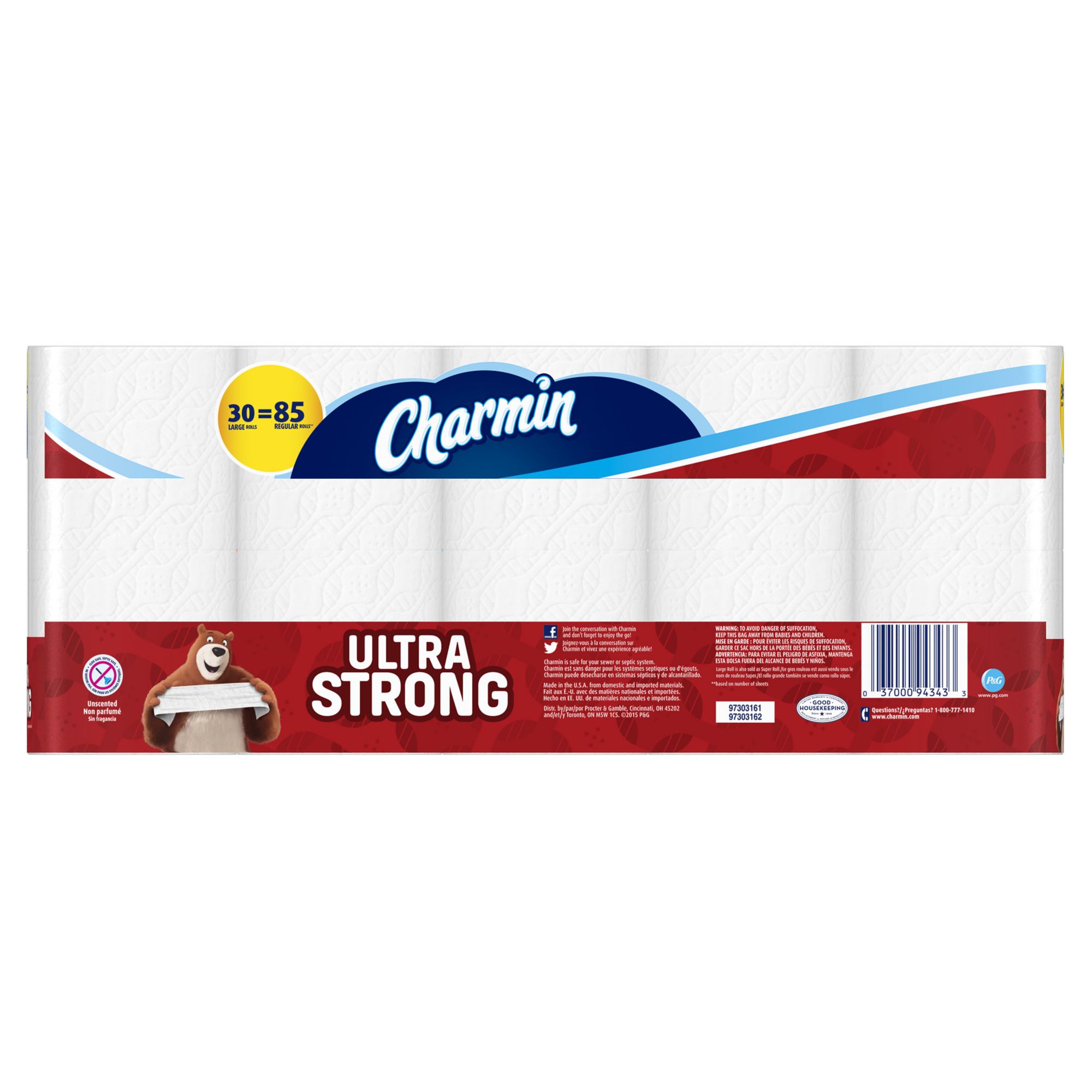 Charmin Ultra Strong 2-ply toilet paper is 4 times stronger* when wet, which means you can be confident your family is getting clean while still using less. Plus, the washcloth-like texture helps clean better than the leading flat-textured bargain brand. Enjoy the go with septic-safe Charmin Ultra Strong toilet paper.