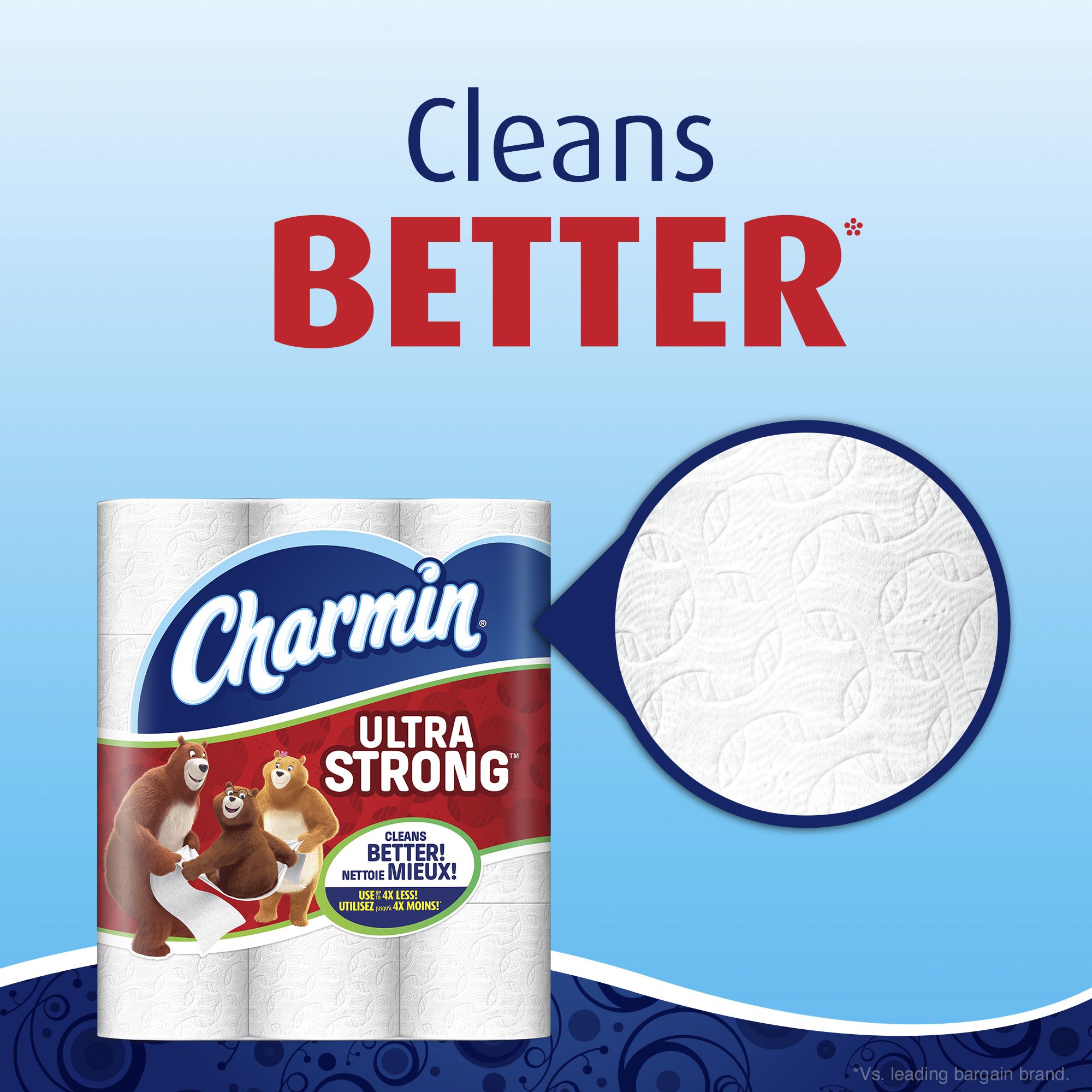 4 times stronger when wet* Cleans better so you can use up to 4 times less* Clog-safe and septic-safe for guaranteed flushability Washcloth-like texture helps clean better than the leading flat-textured bargain brand 2-ply toilet paper Mega Rolls last longer than even the leading 1,000-sheet brand** Includes 30 large rolls