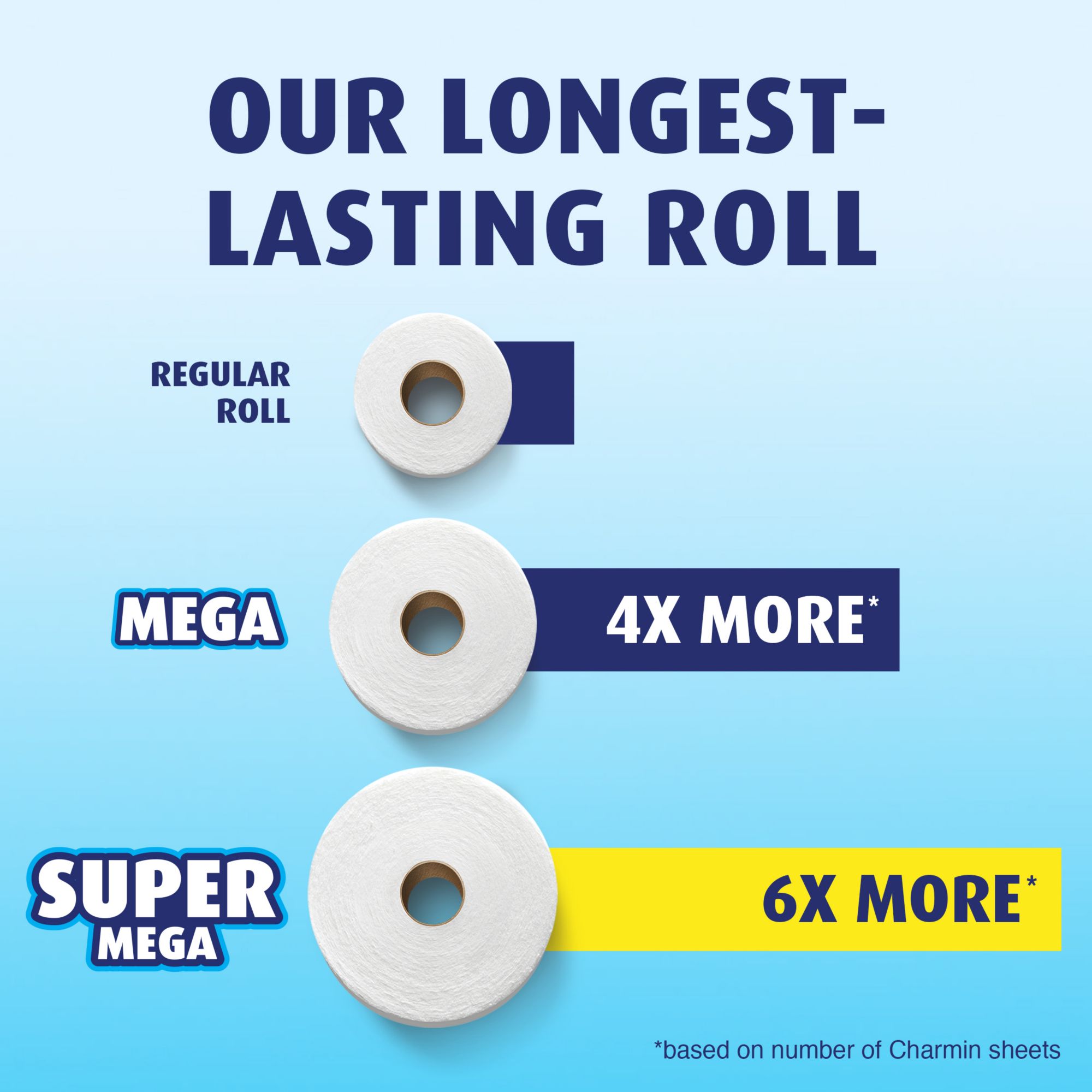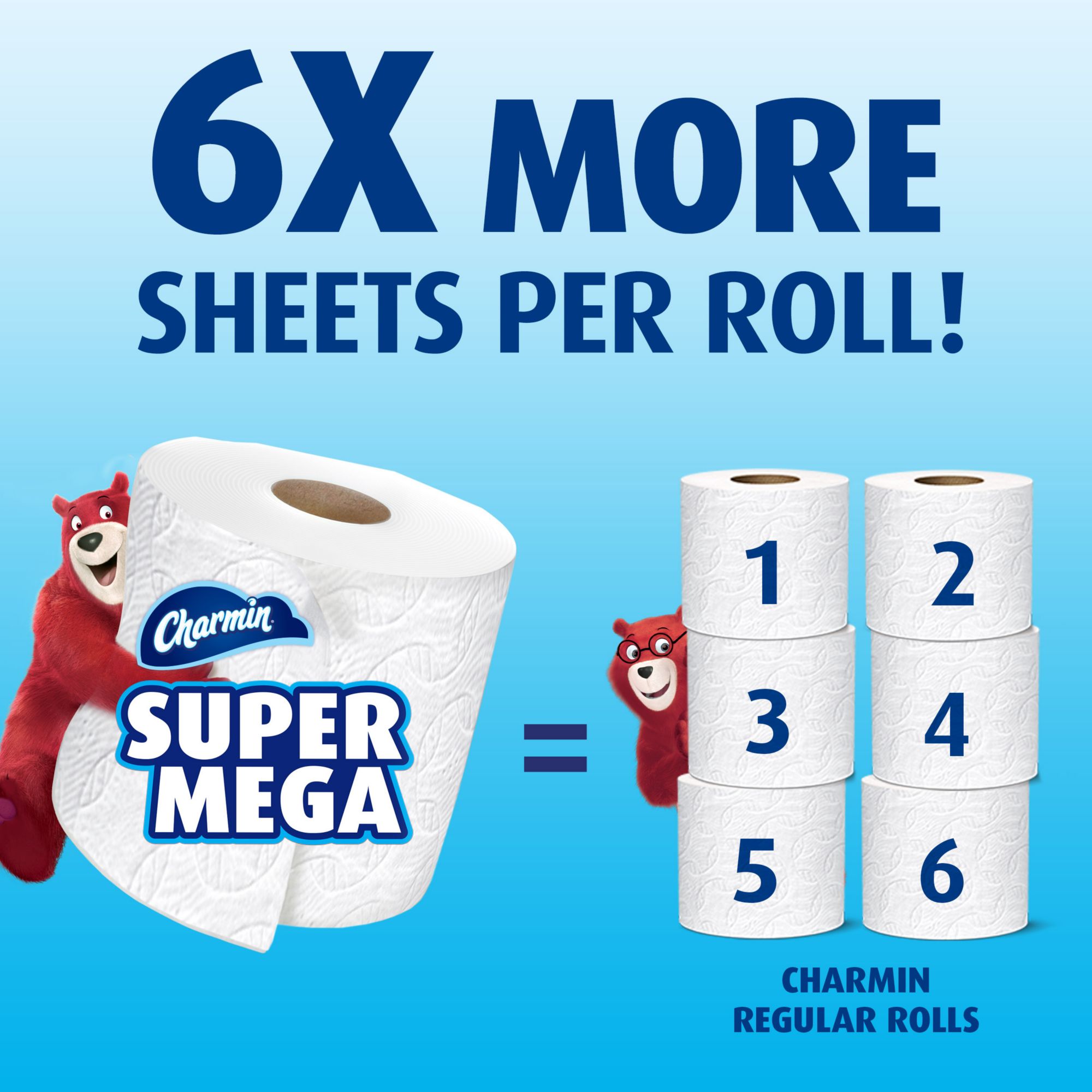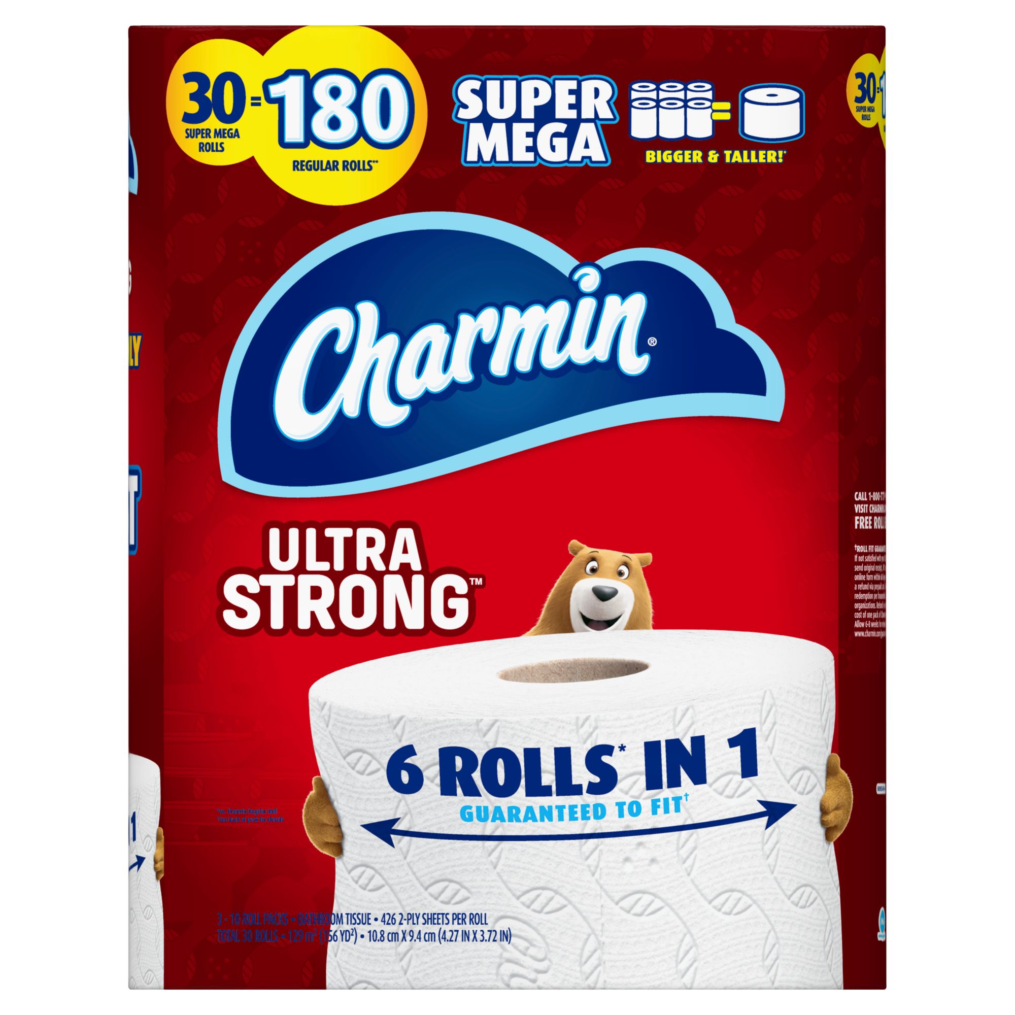 Pack contains 30 Rolls (426 sheets per roll) of Charmin Ultra Strong Toilet Paper One Charmin Super Mega Roll = Six Regular Rolls based on number of sheets in Charmin Regular Roll bath tissue Design inspired by washcloth-like cleaning Strong 2-ply toilet paper to help clean better 4X stronger when wet vs. the leading bargain brand Clog-safe, septic-safe and Roto-Rooter approved At Charmin, we are committed to making our toilet paper work hard to make a sustainable difference 100% of Charmin's paper comes from responsibly managed forests
