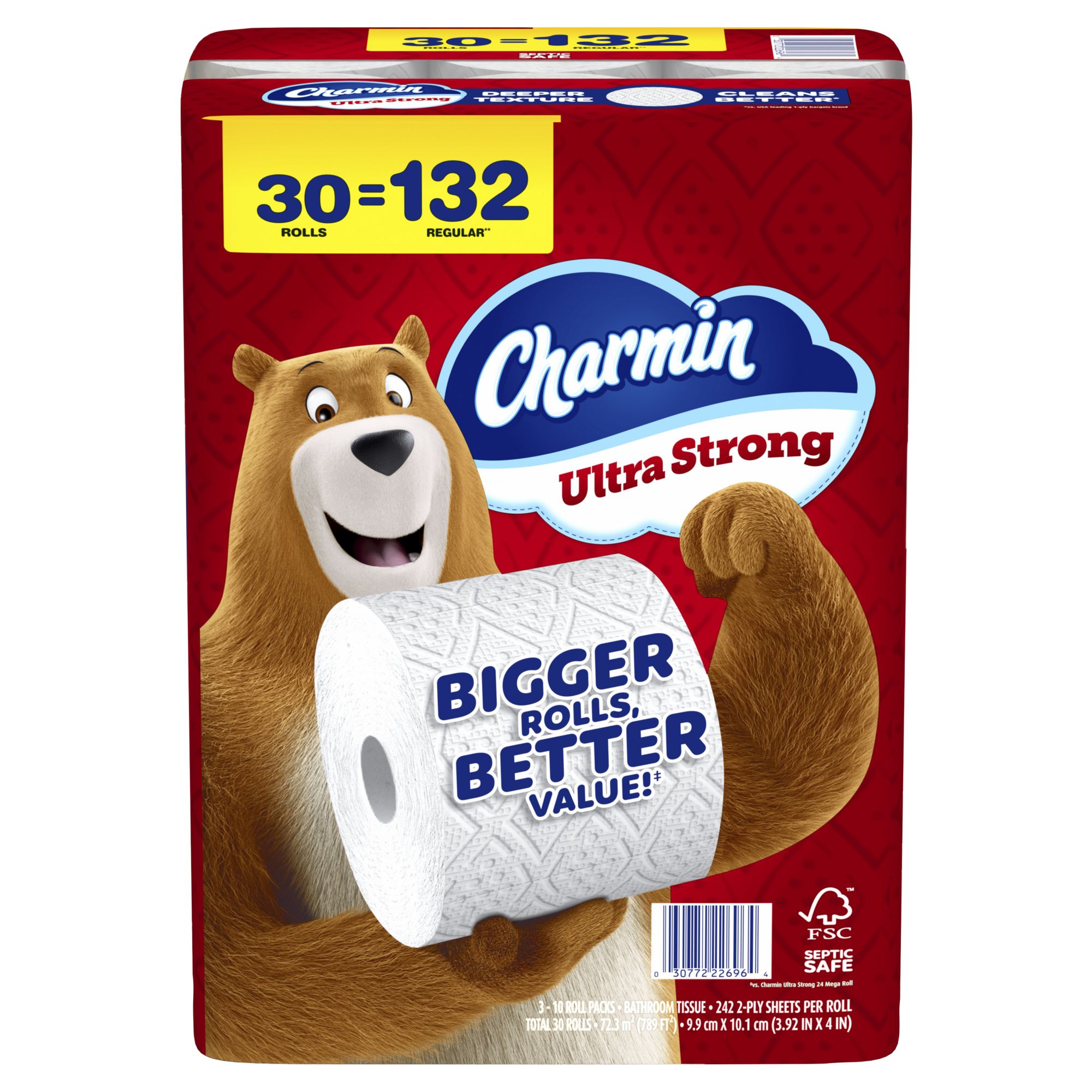 Made with a diamond weave texture and woven like a washcloth Pack contains 30 Rolls (242 Sheets Per Roll) of Charmin Ultra Strong Toilet Paper