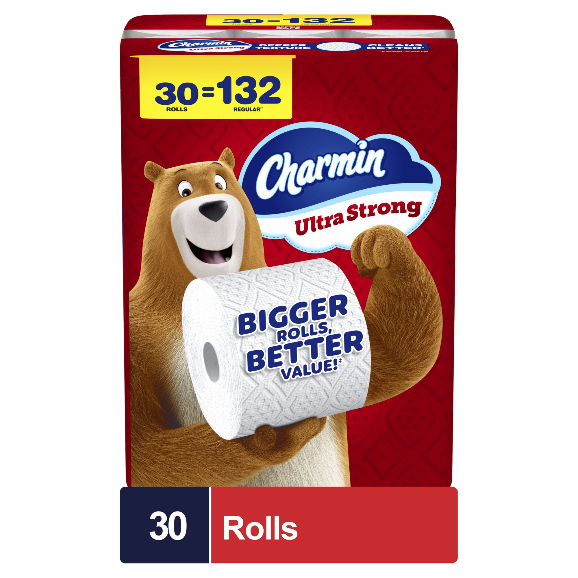 Get sparkly clean with Charmin Ultra Strong. It's 4X stronger when wet vs. leading USA 1-ply bargain brand and has a diamond weave texture. It's woven like a washcloth and holds up when you wipe. It even cleans better so you can use less vs. leading USA 1-ply bargain brand. Our Charmin Ultra Strong toilet paper is also 2-ply and designed to be clog-safe and septic-safe so you can flush confidentially and keep clean. Never want to run out of Charmin? Buy in bulk size, larger count packs! We all go, why not Enjoy The Go with America's favorite toilet paper, based on Total Charmin Brand Sales (Nielsen 2024 Dollar Sales).