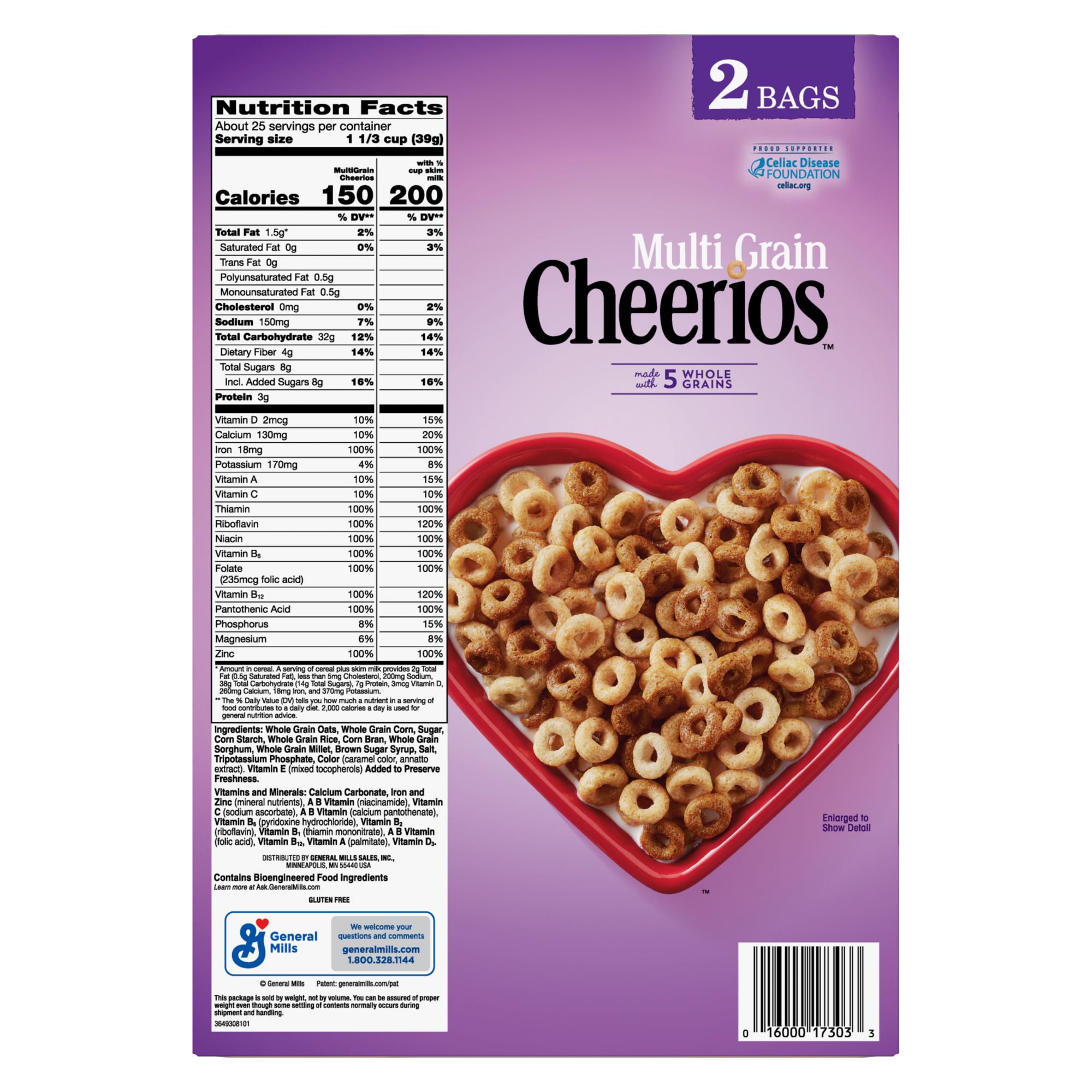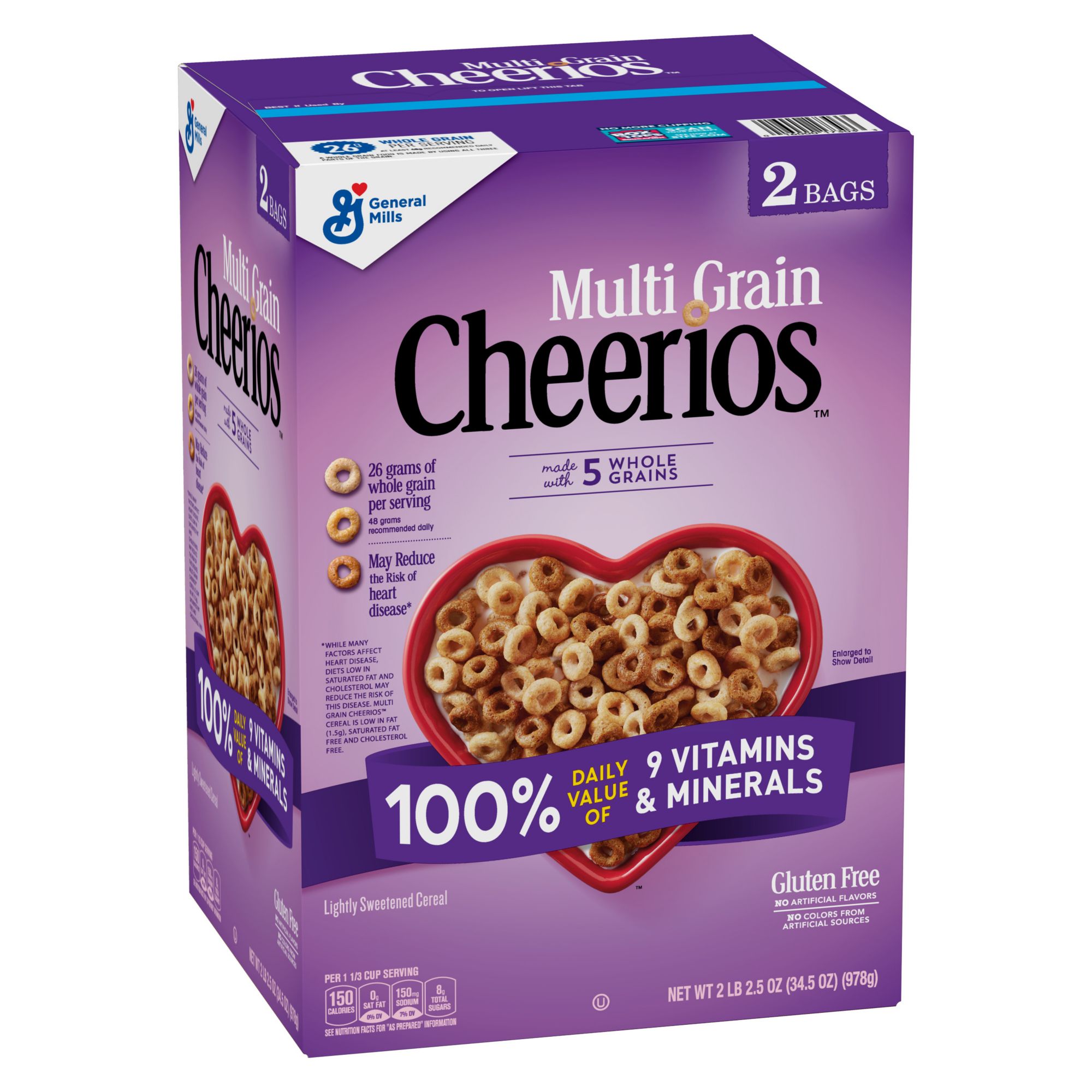 O So Nutritious. Five reasons to love breakfast. Multi Grain Cheerios lightly sweetened breakfast cereal balances nutrition and taste with five whole grains and essential nutrition to help get you through the day. The five whole grains are grown, milled, toasted and lightly sweetened to give you more goodness in every spoonful. Enhanced with 100% daily value of nine vitamins and minerals, this gluten-free cereal makes a delicious breakfast food or on-the-go kids' snack. Make these nutritious little O's part of your daily heart healthy routine. While many factors affect heart disease, diets low in saturated fat and cholesterol may reduce the risk of this disease. Multi Grain Cheerios Cereal is low in fat, saturated fat free and cholesterol free. Multi Grain Cheerios have no high fructose corn syrup, no artificial flavors, no colors from artificial sources and is gluten free. With 26g of whole grain per serving, Multi Grain Cheerios is a delicious breakfast cereal for the entire family to enjoy.