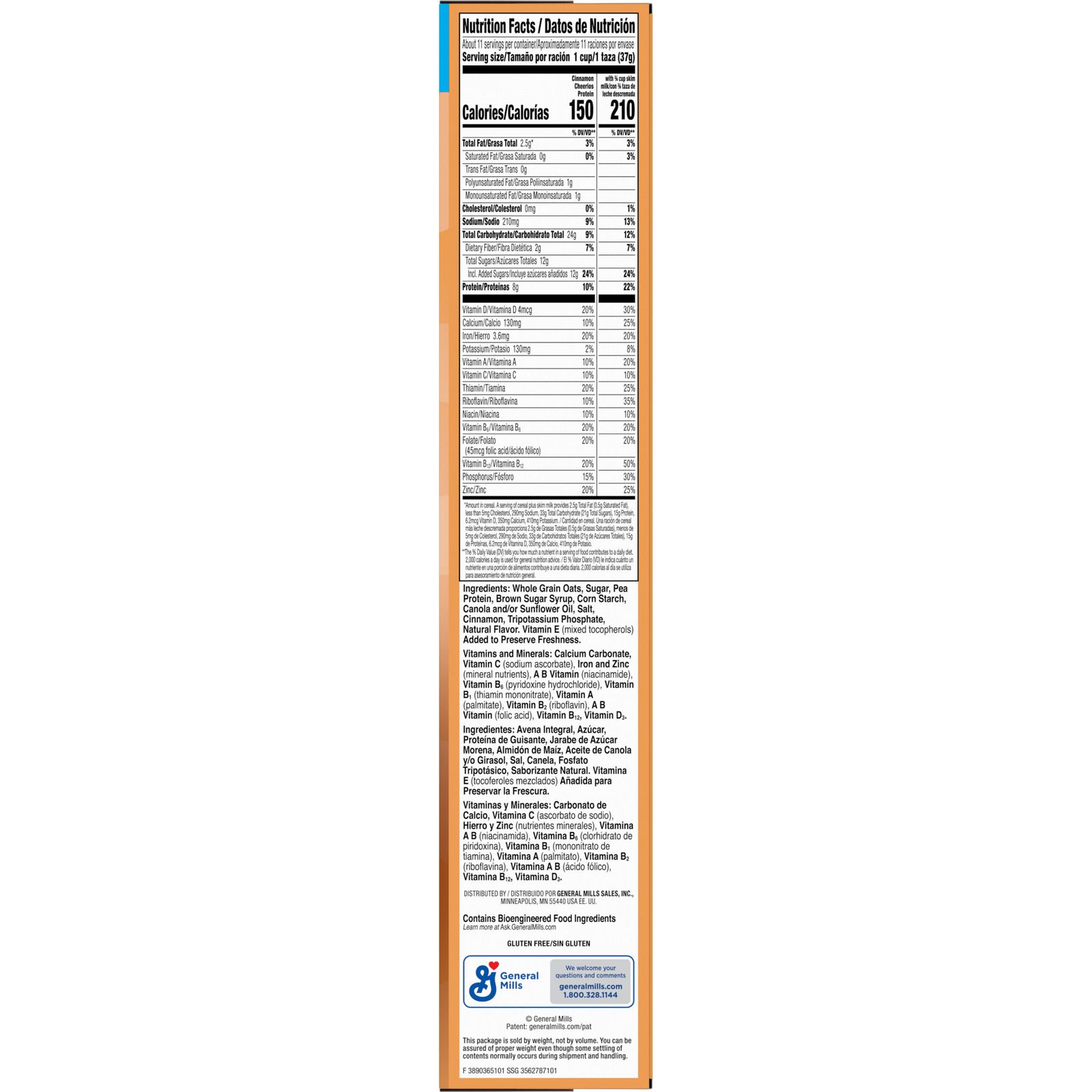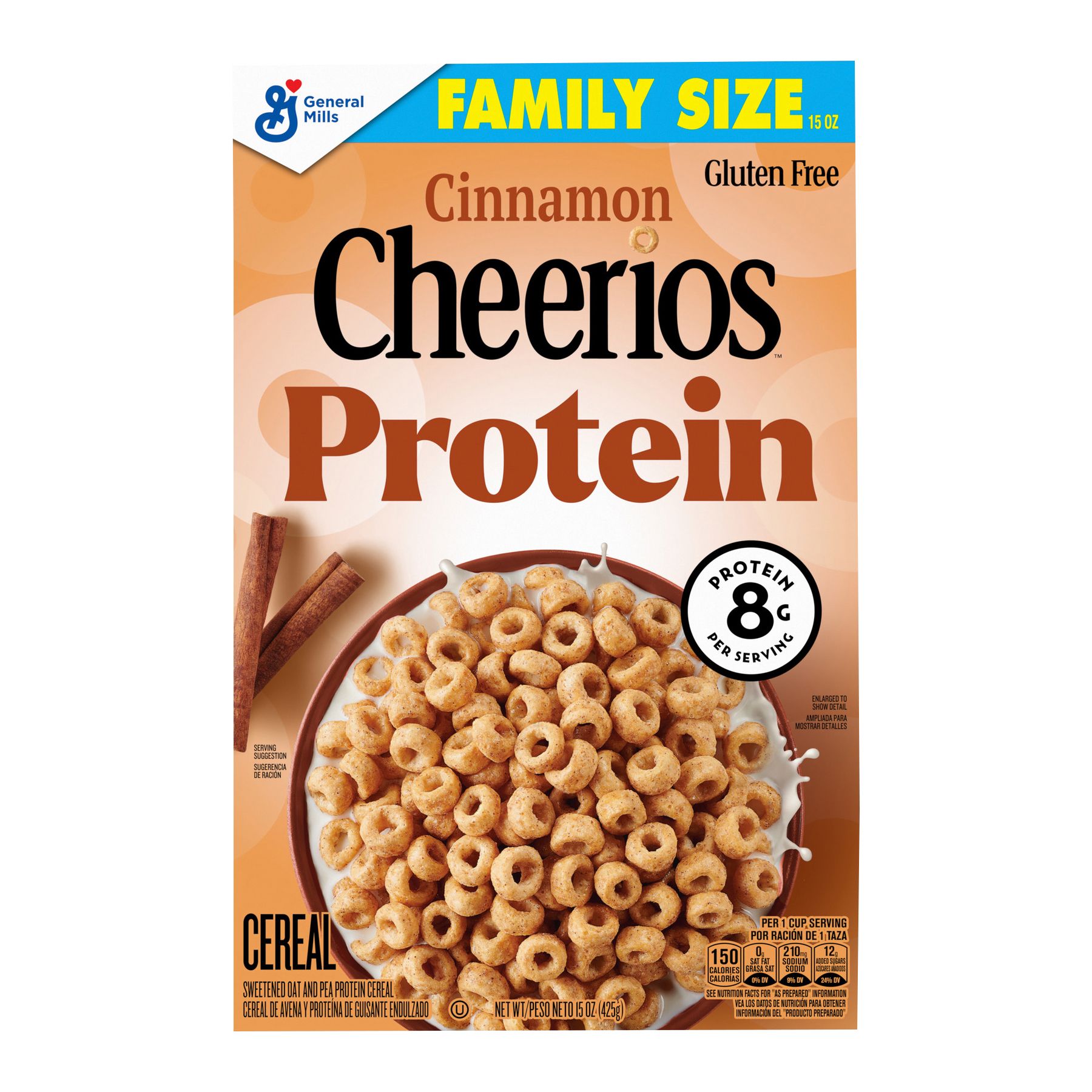 Cinnamon Cheerios Protein treats you and your family to an O-so-delicious taste with 8g of protein per serving. This sweetened oat and pea protein cereal delivers satisfying cinnamon flavor in every bowl. Each serving of this gluten free cereal contains 12g whole grain (at least 48g recommended daily), with no artificial colors or flavors. Keep a Family Size box of this protein cereal made with whole grain in your pantry for part of a quick breakfast. Try some with or without cold milk as a snack in the morning or after school. Sprinkle some over Greek yogurt as a crispy addition to breakfast on the go. However you enjoy Cheerios Protein, General Mills cereals spread goodness from tots to grown-ups.