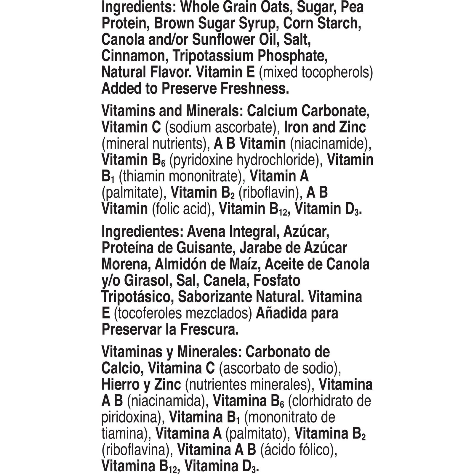 Ingredients: Whole Grain Oats, Sugar, Pea Protein, Brown Sugar Syrup, Corn Starch, Canola and/or Sunflower Oil, Salt, Cinnamon, Tripotassium Phosphate, Natural Flavor, Vitamin E (Mixed Tocopherols) Added to Preserve Freshness, Vitamins and Minerals: Calcium Carbonate, Vitamin C (Sodium Ascorbate), Iron and Zinc (Mineral Nutrients), a B Vitamin (Niacinamide), Vitamin B6 (Pyridoxine Hydrochloride), Vitamin B1 (Thiamin Mononitrate), Vitamin A (Palmitate), Vitamin B2 (Riboflavin), a B Vitamin (Folic Acid), Vitamin B12, Vitamin D3.