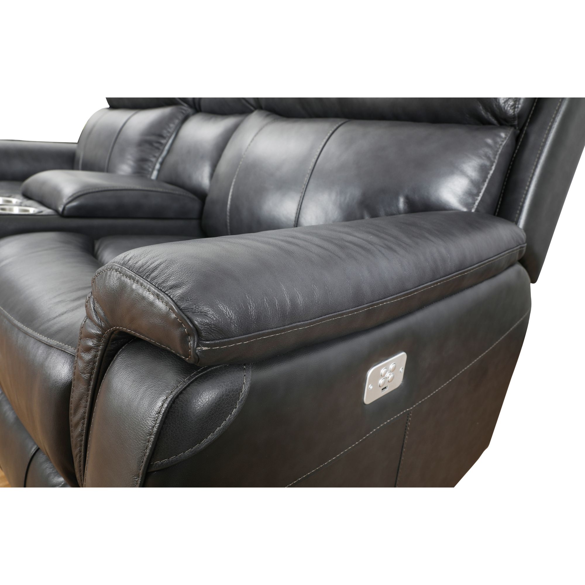 Meet the Cheers Easton Three Piece Leather Power Reclining Sofa with Power Headrest Set. This set has three pieces, a power headrest sofa, a power headrest console loveseat and a power headrest recliner. This set is upholstered in top grain leather on all front facing areas, with leather patches on all stress points for seam protection. Using only top selection leather hides allows for larger cuts of this beautiful leather to be used without seams running all over the set. The Power recline and power headrest is standard with a capacity of 360lbs. Our mechanisms are made using 20% more steel for a smoother, more stable ride while operating. USB charging ports are available in each Power activator on the outside arm of each piece of the set. 100% 2.0 HR density foam seat cushions allow for superior comfort and bagged holofil fiber backs will keep the beautiful shape of this set for years to come.