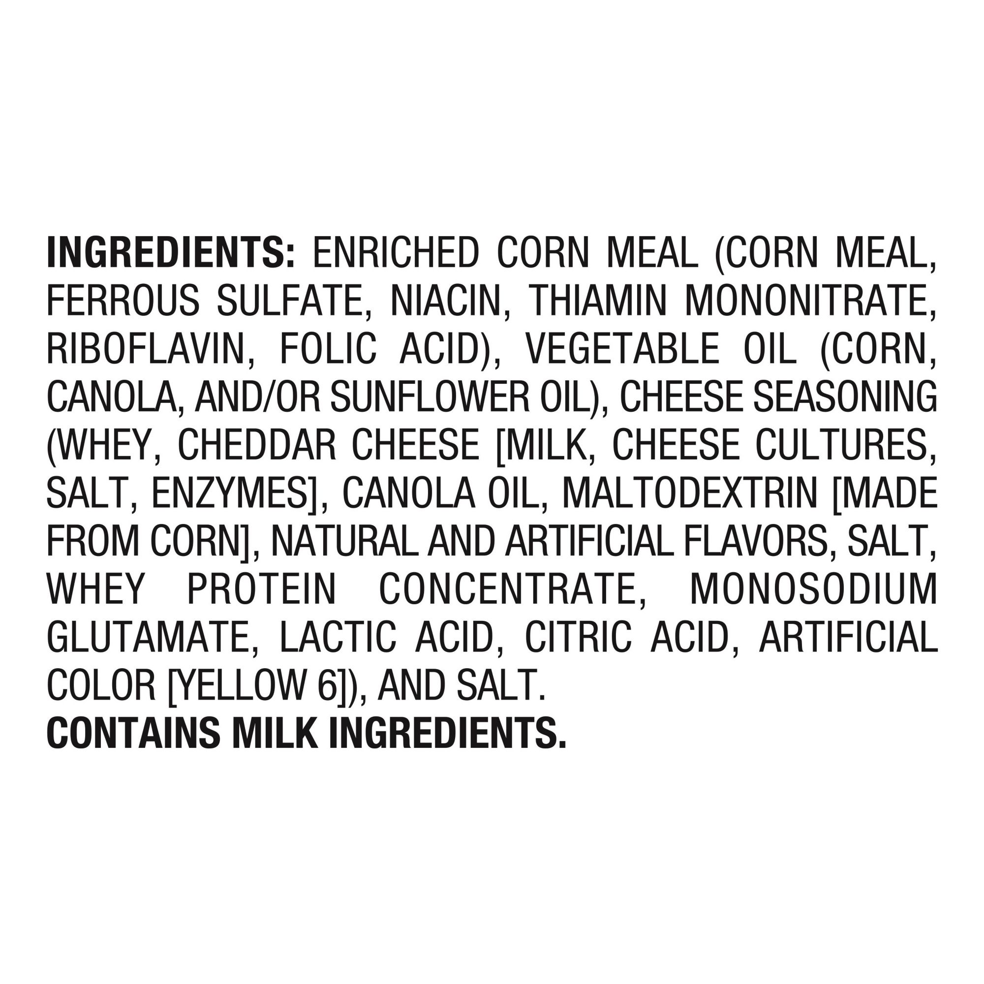 Ingredients Enriched Corn Meal (Corn Meal, Ferrous Sulfate, Niacin, Thiamin Mononitrate, Riboflavin, Folic Acid), Vegetable Oil (Corn, Canola, And/Or Sunflower Oil), Cheese Seasoning (Whey, Cheddar Cheese [Milk, Cheese Cultures, Salt, Enzymes], Canola Oil, Maltodextrin [Made From Corn], Natural And Artificial Flavors, Salt, Whey Protein Concentrate, Monosodium Glutamate, Lactic Acid, Citric Acid, Artificial Color [Yellow 6]), And Salt. Contains Milk Ingredients.