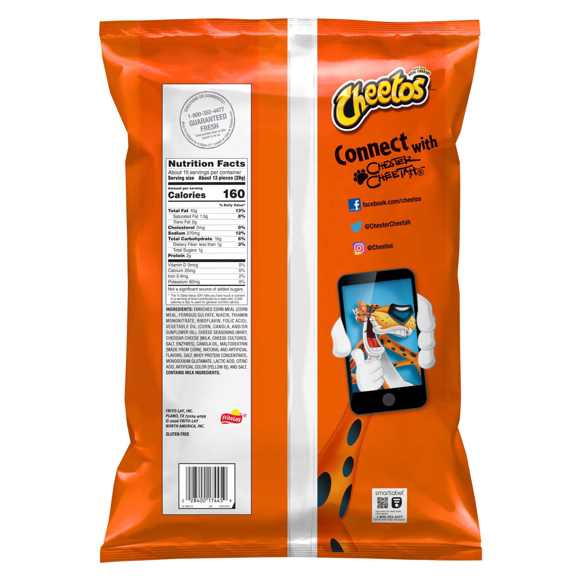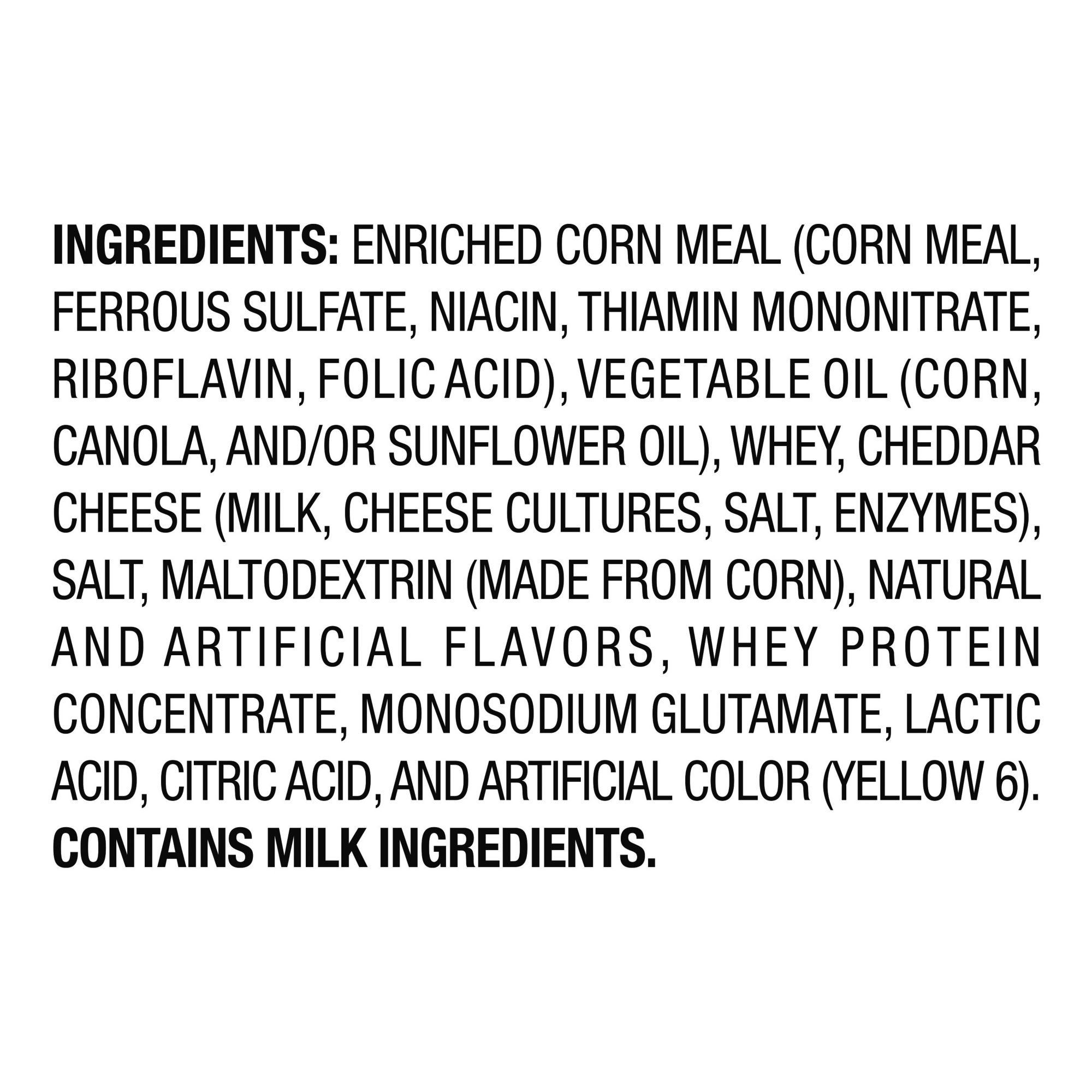 Ingredients Enriched Corn Meal (Corn Meal, Ferrous Sulfate, Niacin, Thiamin Mononitrate, Riboflavin, Folic Acid), Vegetable Oil (Corn, Canola, And/Or Sunflower Oil), Cheese Seasoning (Whey, Cheddar Cheese [Milk, Cheese Cultures, Salt, Enzymes], Canola Oil, Maltodextrin [Made From Corn], Natural And Artificial Flavors, Salt, Whey Protein Concentrate, Monosodium Glutamate, Lactic Acid, Citric Acid, Artificial Color [Yellow 6]), And Salt. Contains Milk Ingredients.