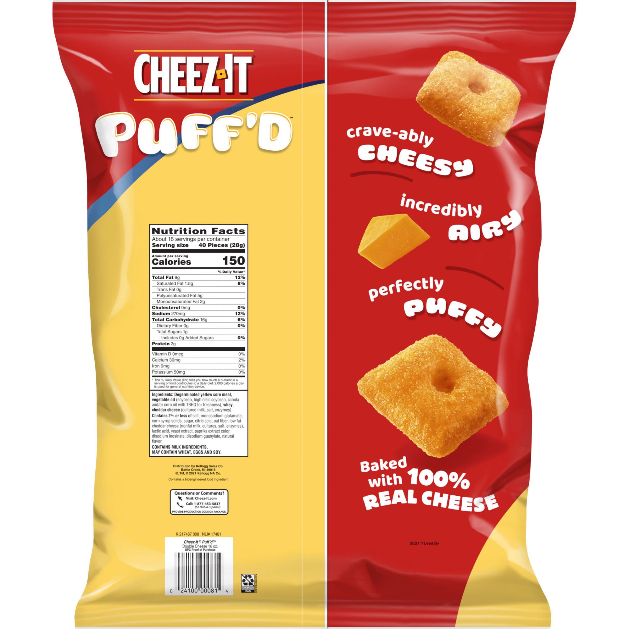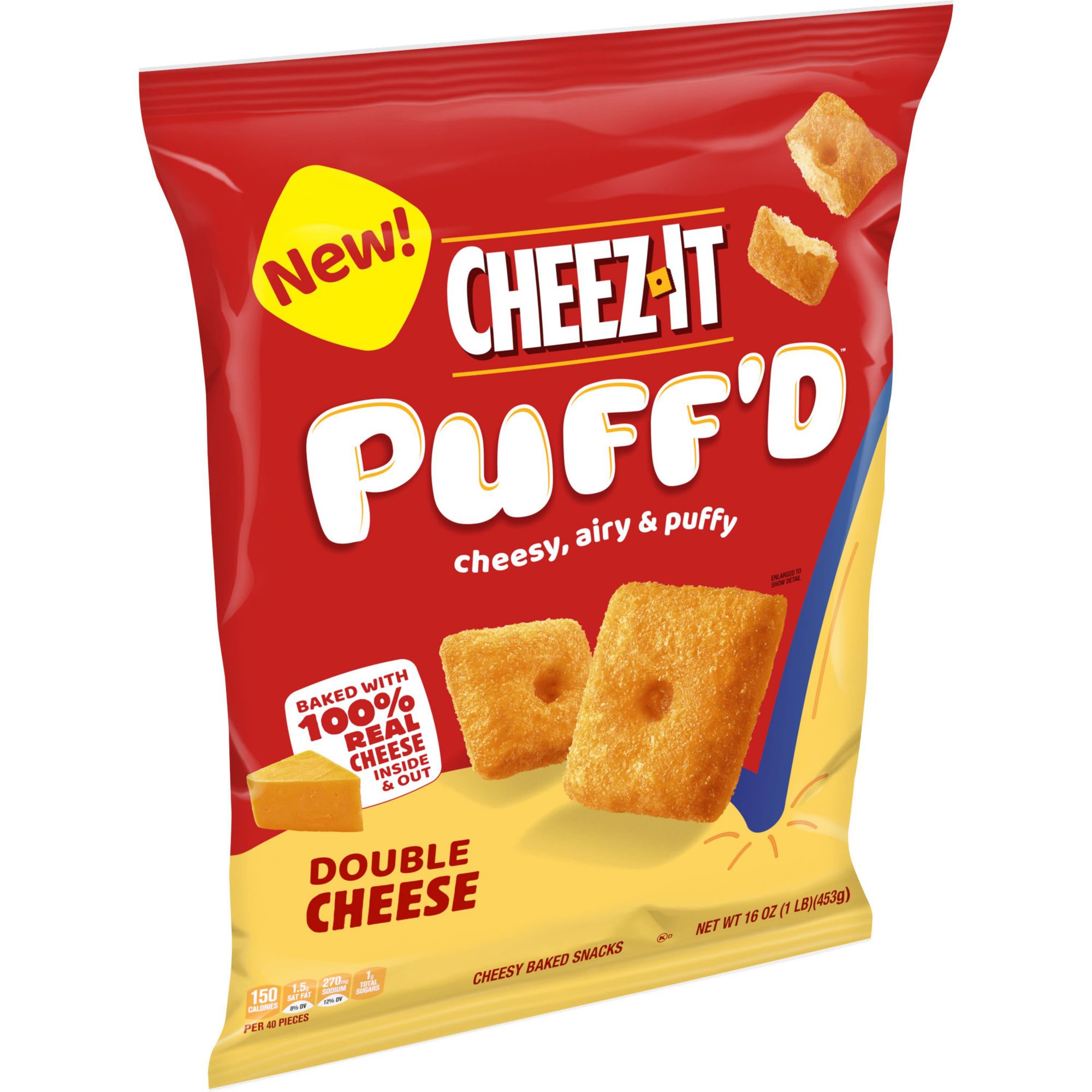 Defy your cheez expectations with a puffy and airy craveable snack from Cheez-It Melt in your mouth double cheese flavor for a taste the whole family will crave Baked with 100% real cheese, inside and out; Contains milk ingredients; May contain wheat, eggs, and soy Stock your home pantry for snacks after school or anytime; Makes a tasty bite on the go Includes one, 16 oz. multi-serve bag of ready-to-eat Cheez-It Puff'd double cheese cheesy baked snacks; packaged for freshness and great taste