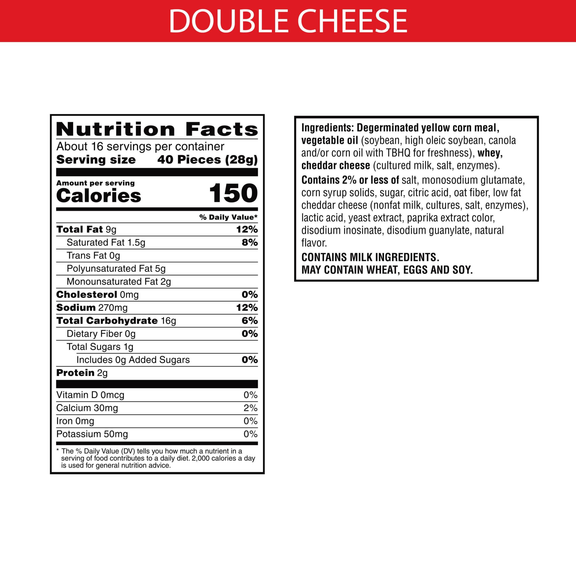 Degerminated Yellow Corn Meal, Vegetable Oil (Soybean, High Oleic Soybean, Canola and/or Corn Oil With TBHQ for Freshness), Whey, Cheddar Cheese (Cultured Milk, Salt, Enzymes).contains 2% or Less of Salt, Monosodium Glutamate, Corn Syrup Solids, Sugar, Citric Acid, Oat Fiber, Low Fat Cheddar Cheese (Nonfat Milk, Cultures, Salt, Enzymes), Lactic Acid, Yeast Extract, Paprika Extract Color, Disodium Inosinate, Disodium Guanylate, Natural Flavor.