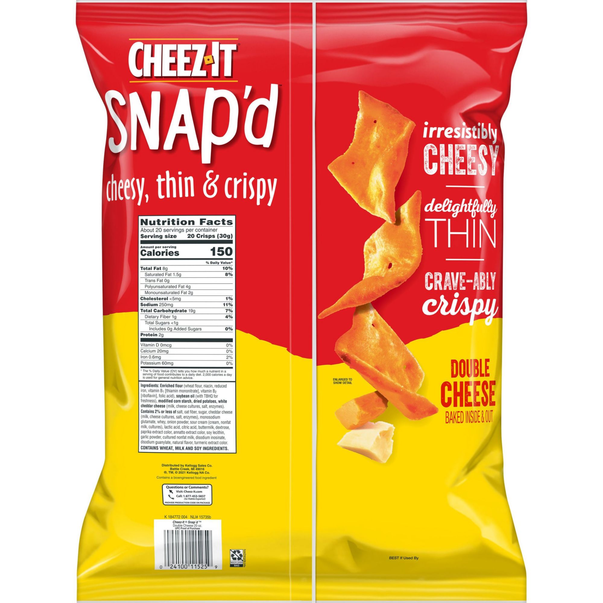 Thin and crispy cheesy baked snacks with big cheese taste inside and out Turn up the cheese volume with the satisfying crunch of Cheez-It Snap'd Made with 100% real cheese; Kosher Dairy, Contains wheat, milk and soy ingredients An anytime snack that makes a tasty bite at home or on the go; Enjoy while relaxing and watching TV, or add as a crunchy side to your sandwich Includes 1, 20-ounce bag of ready-to-eat cheesy baked snacks Packaged for freshness and great taste