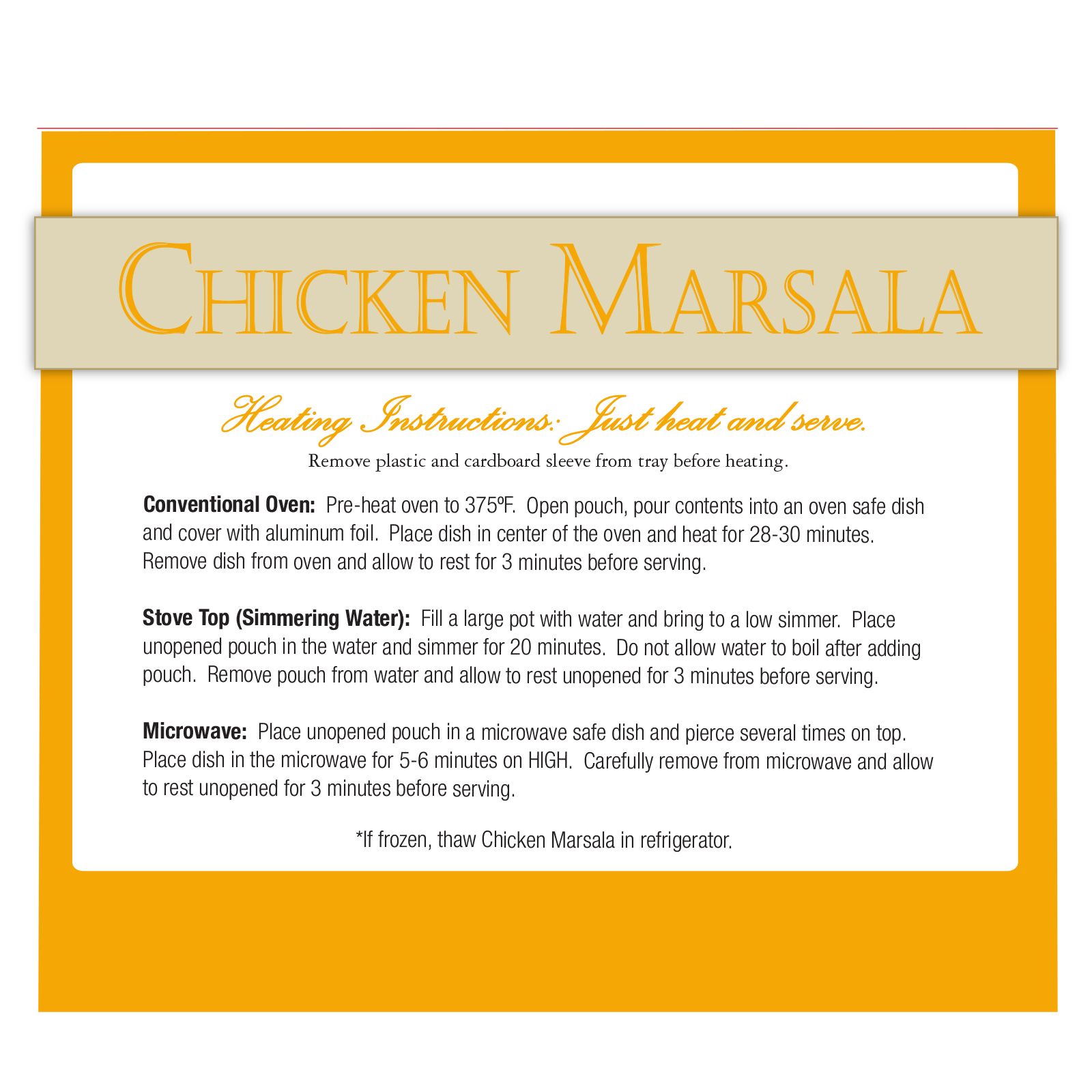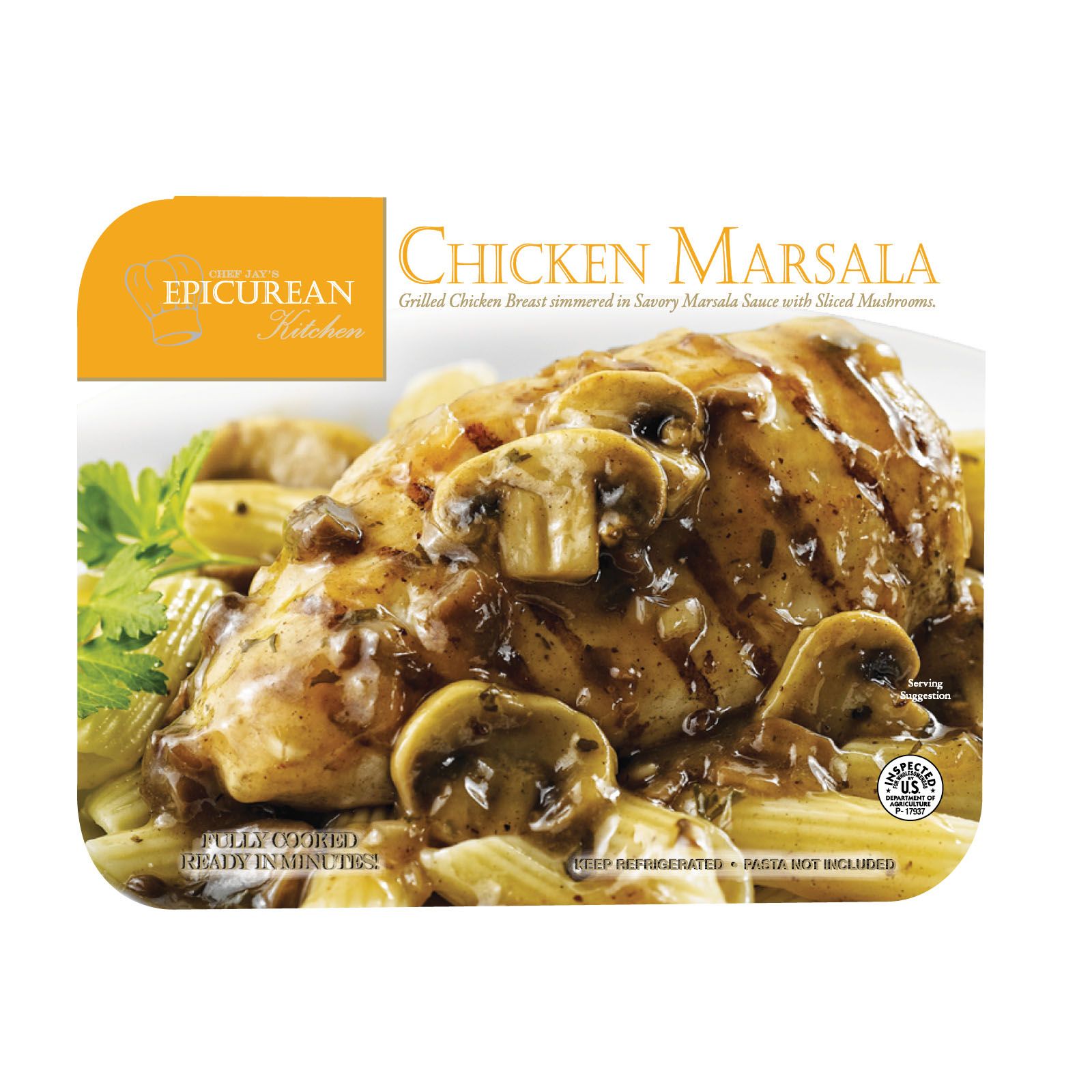 Fully cooked, ready in minutes Made with premium ingredients Serve over rice, pasta or mashed potatoes Family favorite comfort food Includes one pouch contains approximately 1.50 - 2.75 lbs. of grilled chicken and mushrooms in marsala sauce