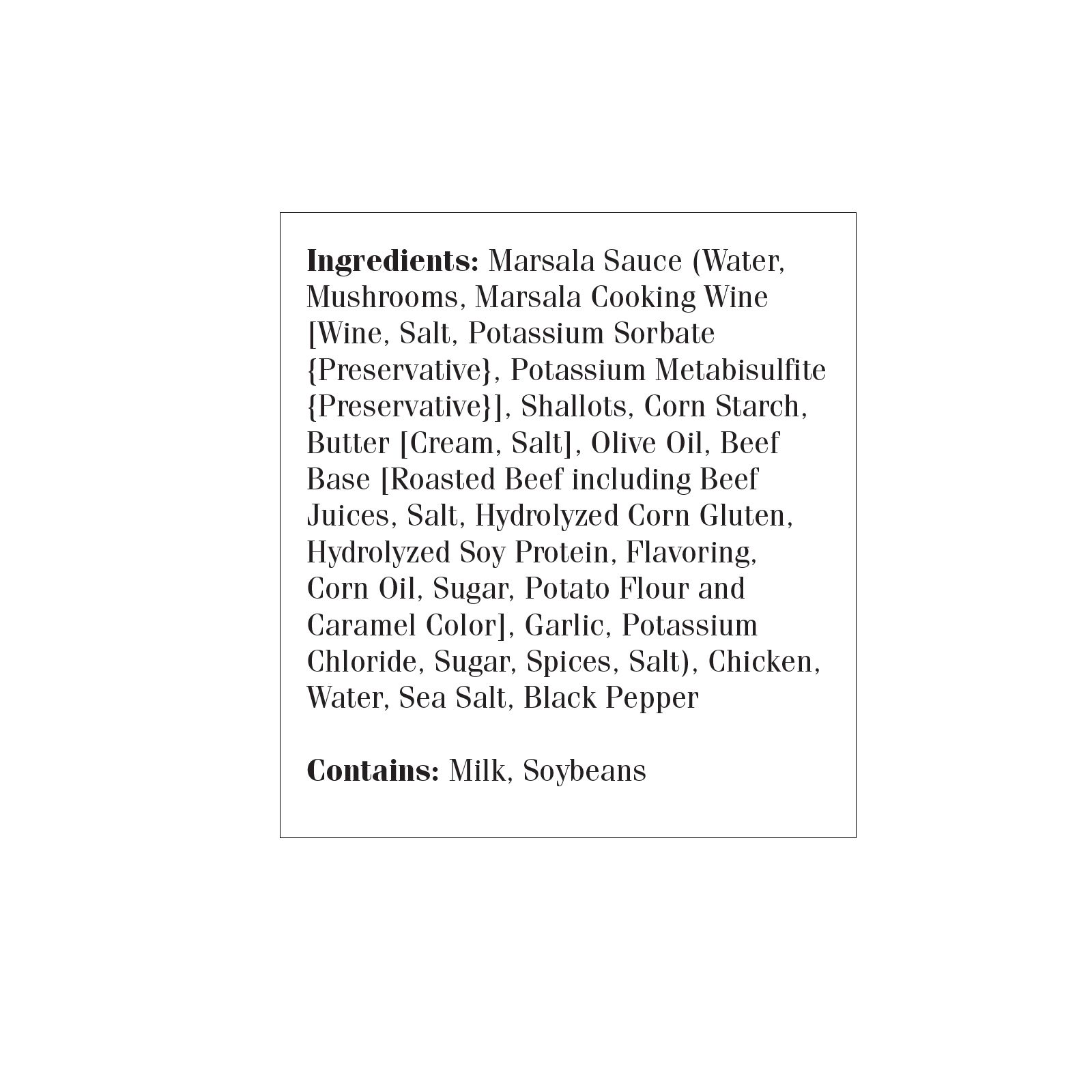 Ingredients: Marsala Sauce (Water, Mushrooms, Marsala Cooking Wine {Wine, Salt, Potassium Sorbate [Preservative], Potassium Metabisulfite [Preservative], Shallots, Corn Starch, Butter {Cream, Salt}, Olive Oil, Beef Base {Roasted Beef including Beef Juices, Salt, Hydrolyzed Corn Gluten, Hydrolyzed Soy Protein, Flavoring, Corn Oil, Sugar, Potato Flour and Caramel Color}, Garlic, Potassium Chloride, Sugar, Spices, Salt), Chicken, Water, Sea Salt, Black Pepper