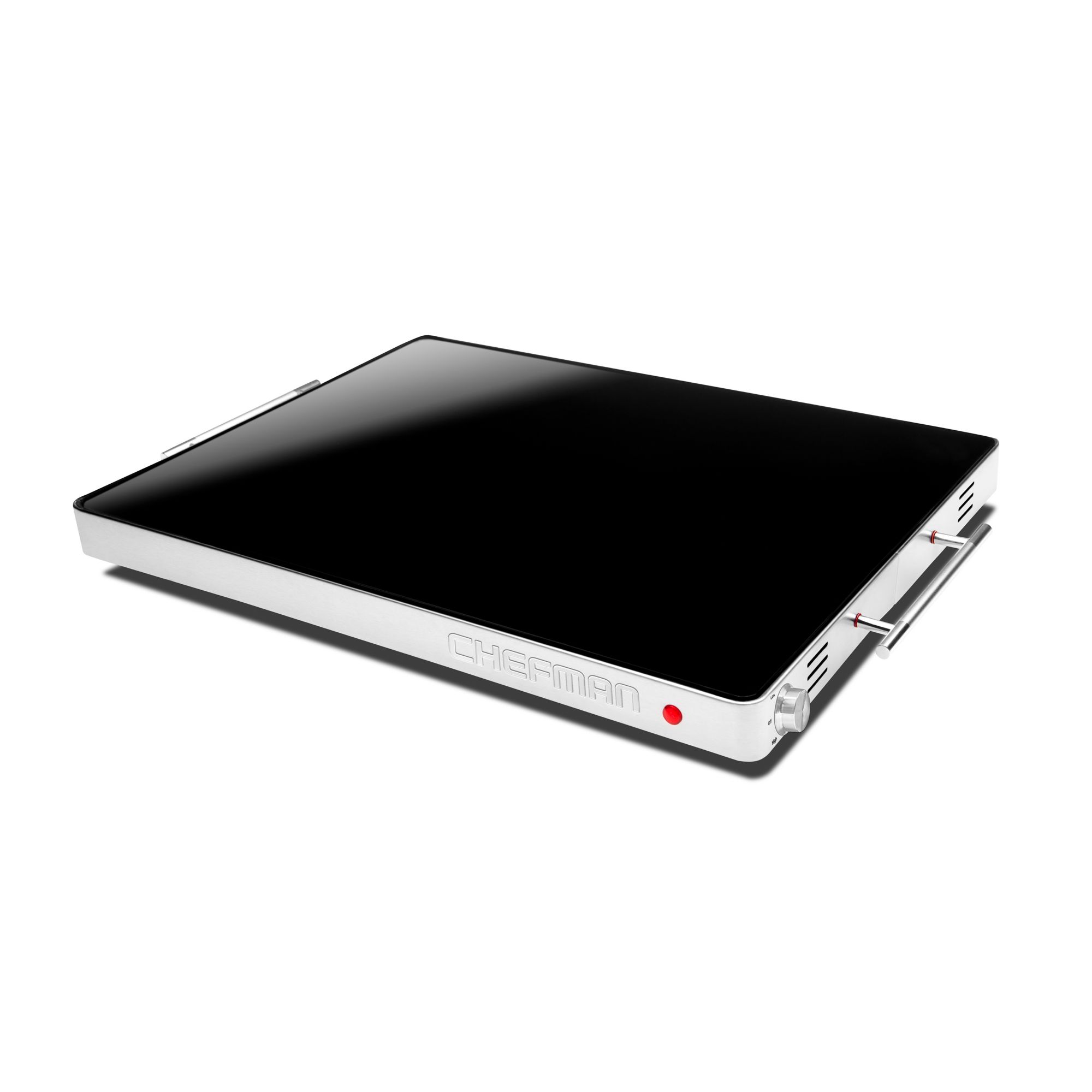 Can be used with all heat-safe cookware and bakeware, aluminum or glass baking pans, casserole dishes, pots, pans, and more. Cool touch aluminum handles for convenient transport and added safety. The sleek, space-saving design with a black tempered glass top and stainless steel accents look great on any table or buffet. The revolutionary glass plate design makes cleaning a breeze. The products are cETL approved with advanced safety technology for long-lasting durability and a one-year warranty provided by Chefman, so you can purchase worry-free.