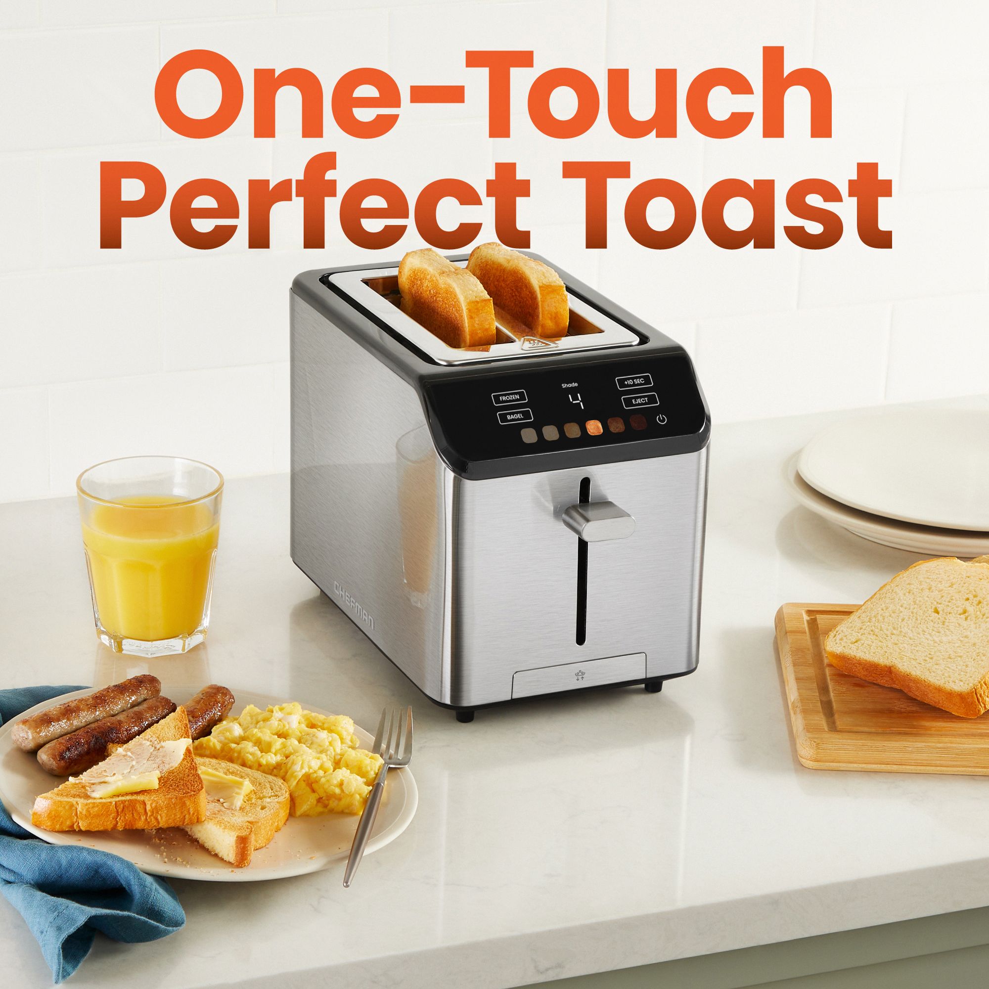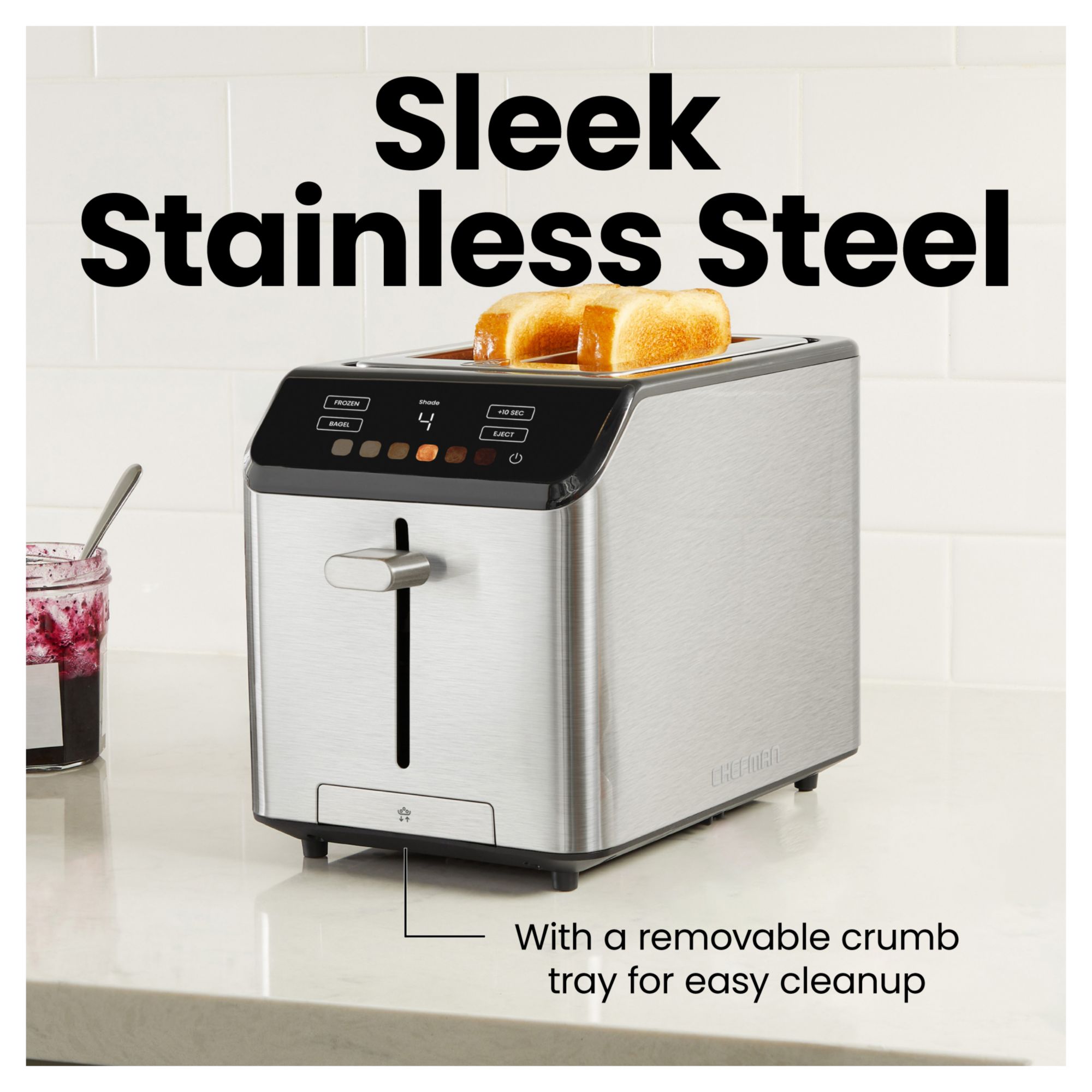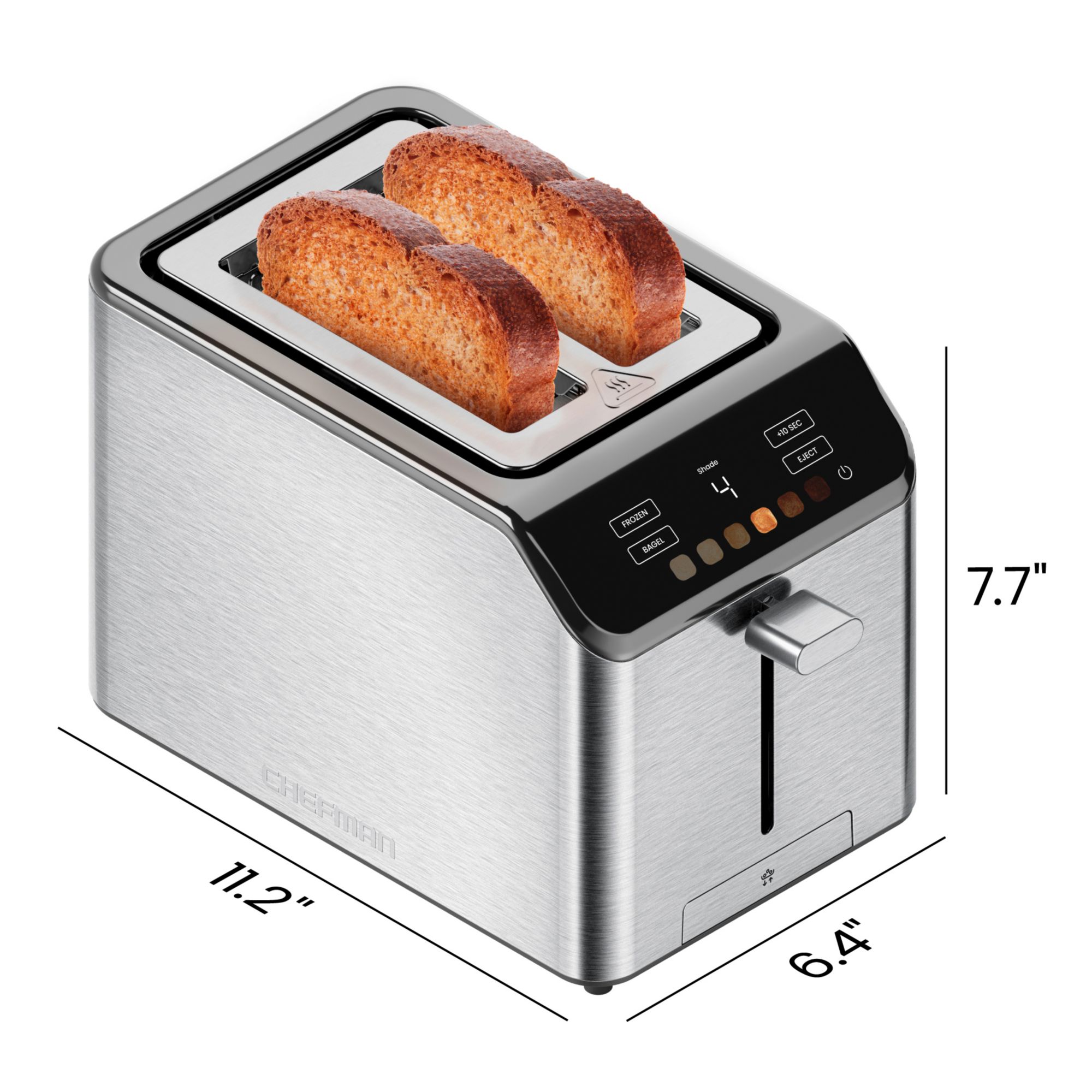 YOUR PERFECT TOAST: Choose one of 6 touchscreen shade settings for the perfect amount of crunch every time; ideal for lightly toasted sandwiches or some crispy toast with jam as a snack FITS THICK BREAD: Extra-wide slots provide ample space to toast thick slices of bread and bagels with plenty of room; You can even warm up toaster pastries with the 1.5-inch-thick slots. 3 COOKING MODES: Use three available functions for toasting up breads, bagels, and frozen items, getting rid of the guesswork and stopping your breakfast from overcooking +10 SEC BUTTON: Quickly add toasting time and finish off your toast with a little extra crunch by pressing the “+10 SEC” button on this touch screen toaster. BETTER BAGELS: Bagel mode toasts the cut side of your bagel and warms the outer crust; this setting is great for English muffins, too! SAFE AND CONVENIENT: To prevent burning, this toaster 2 slice has a high-lift lever which raises your bread upwards for easier removal with an anti-jam auto-shutoff to turn off the unit if any food gets stuck in the slots EASY-CLEANING: This small toaster is great for one-stop toasting without taking up valuable counterspace; The removable crumb tray simply slides out to wipe clean and the stainless-steel finish is durable and timeless RESOURCES: cETL approved with advanced safety technology for long-lasting durability plus a 1-year Chefman warranty. 850 Watts/120 Volts – RJ31-SS-T-2S Includes 1 Chefman Smart Touch 2-Slice Toaster