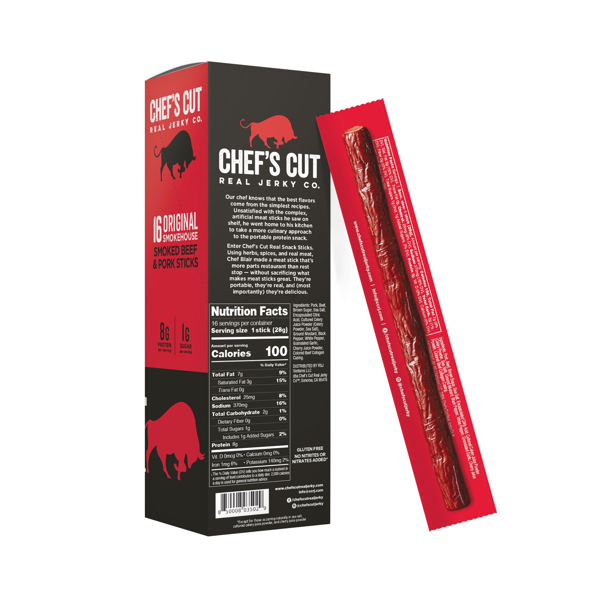Chef's Cut Original Smokehouse Real Snack Sticks are protein-packed, made with fine cuts of steak and pork, and marinated with a blend of garlic, pepper, brown sugar and a hint of mustard. It's a moveable feast that is ready to go wherever you go. Every real snack Stick is chef-crafted, protein-packed and made with all real ingredients. It's a convenient snack that goes wherever you go.