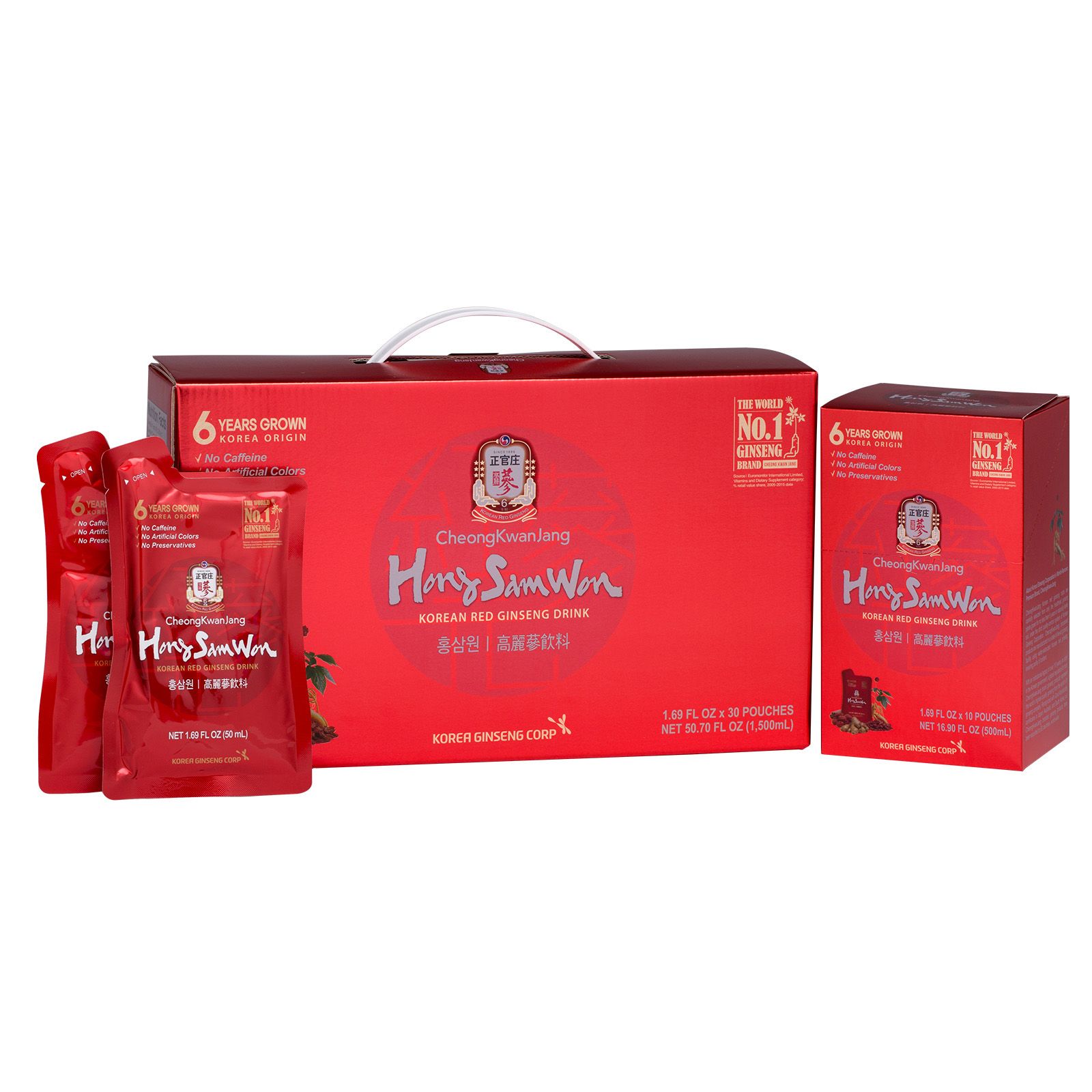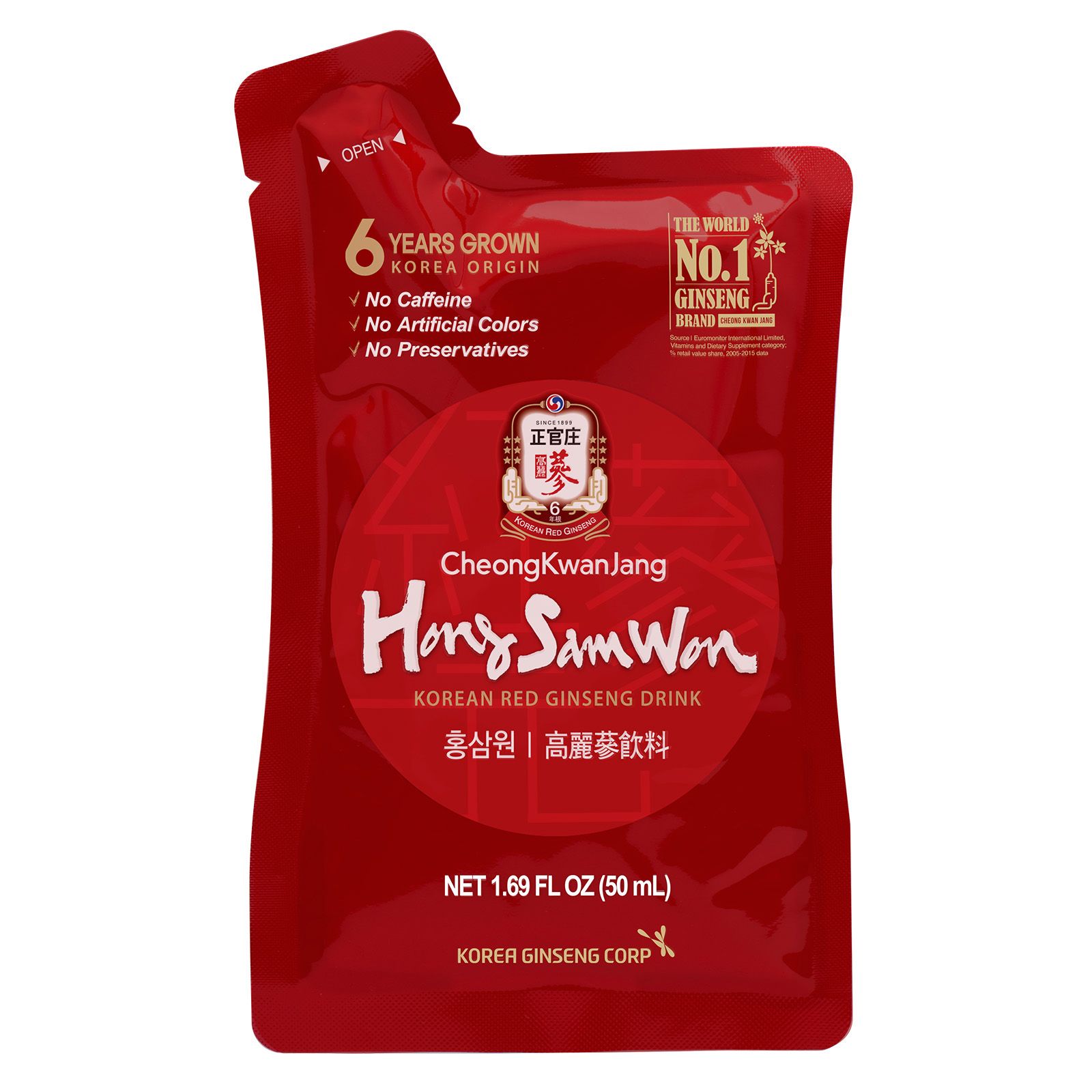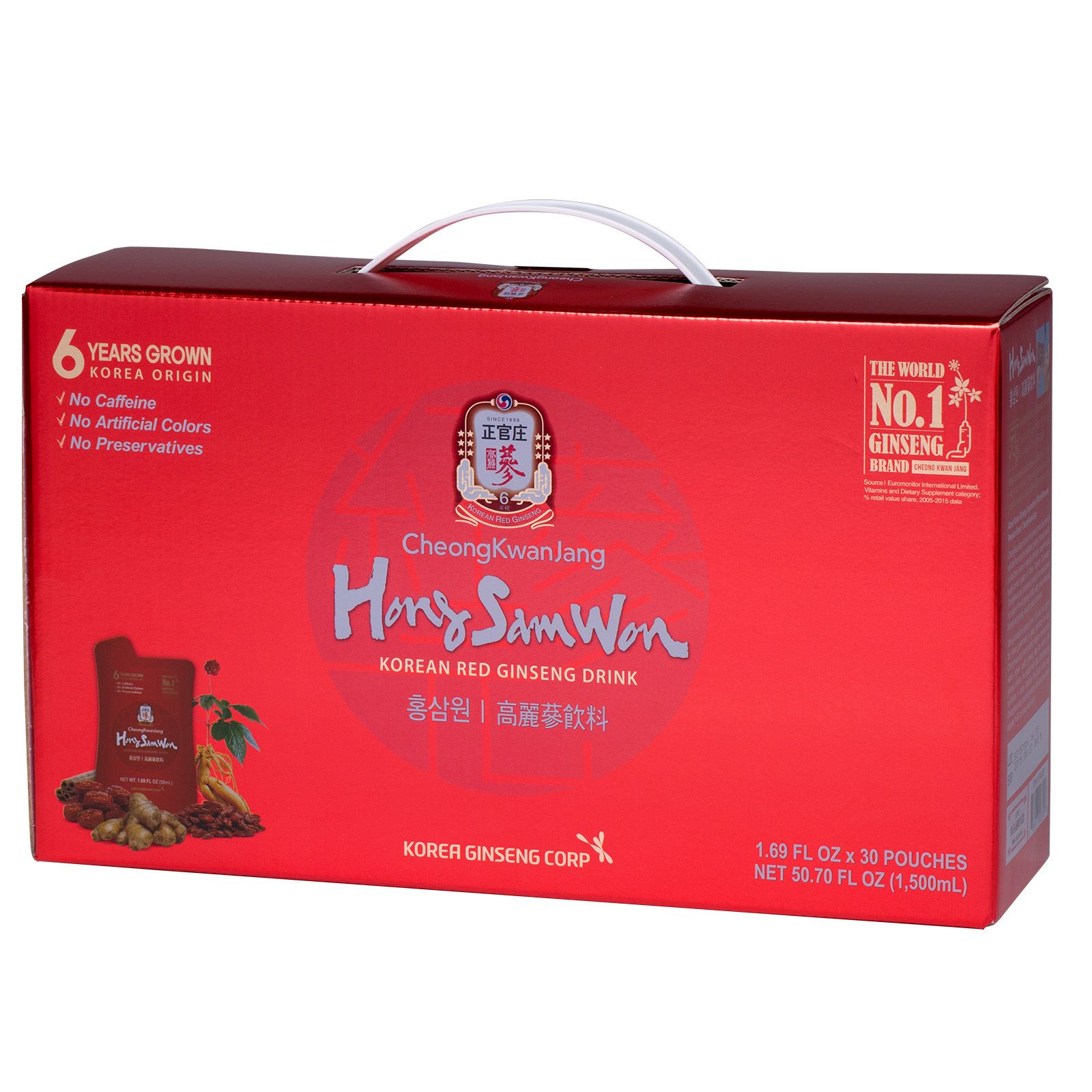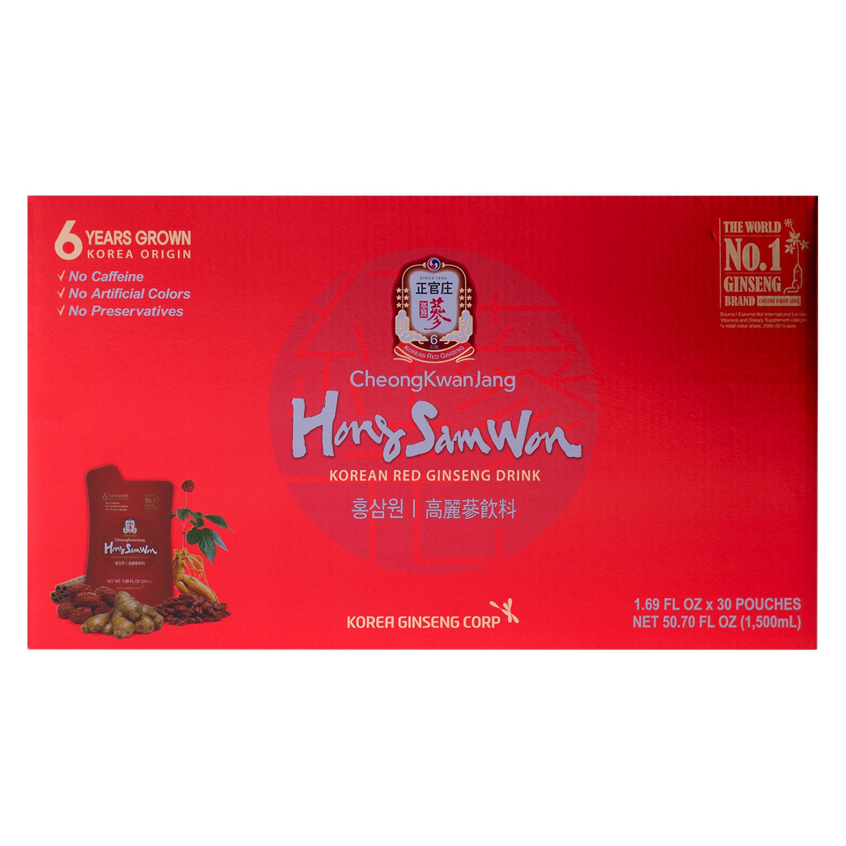 Contains Premium 6 years grown Korean Red Ginseng, contains ginger, cinnamon, goji berries & jujube fruit. Refreshing and delicious, sweetened with natural sweetener for no bitter herb taste. These pouches are made with no high-fructose corn syrup, artificial colors or preservatives. CheongKwanJang is the oldest and number one ginseng brand in the world.