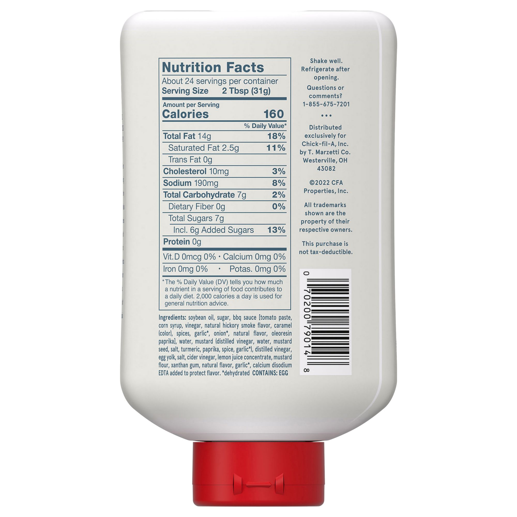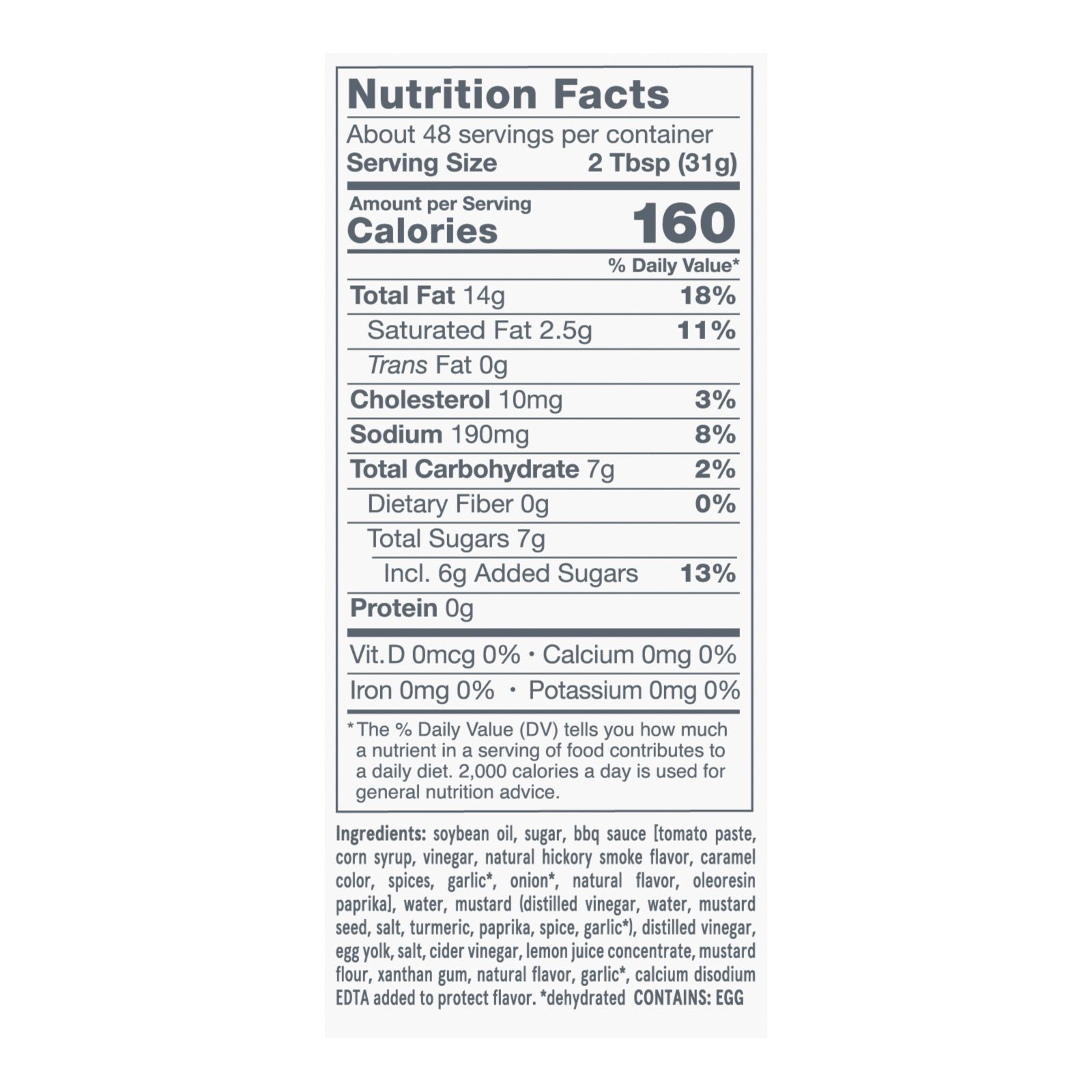 Ingredients: Soybean Oil, Sugar, Bbq Sauce [Tomato Paste, Corn Syrup, Vinegar, Natural Hickory Smoke Flavor, Caramel (Color), Spices, Garlic*, Onion*, Natural Flavor, Oleoresin Paprika], Water, Mustard (Distilled Vinegar, Water, Mustard Seed, Salt, Turmeric, Paprika, Spice, Garlic*), Distilled Vinegar, Egg Yolk, Salt, Cider Vinegar, Lemon Juice Concentrate, Mustard Flour, Xanthan Gum, Natural Flavor, Garlic*, Calcium Disodium Edta Added To Protect Flavor, * Dehydrated.