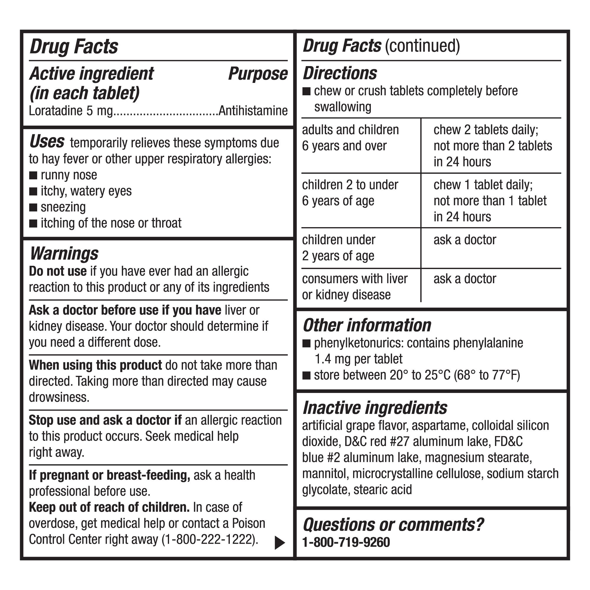 Active Ingredient (in Each Tablet): Loratadine 5mg. Inactive Ingredients: Artificial Grape Flavor, Aspartame, Colloidal Silicon Dioxide, D&C Red #27 Aluminum Lake, FD&C Blue #2 Aluminum Lake, Magnesium Stearate, Mannitol, Microcrystalline Cellulose, Sodium Starch Glycolate, Stearic Acid