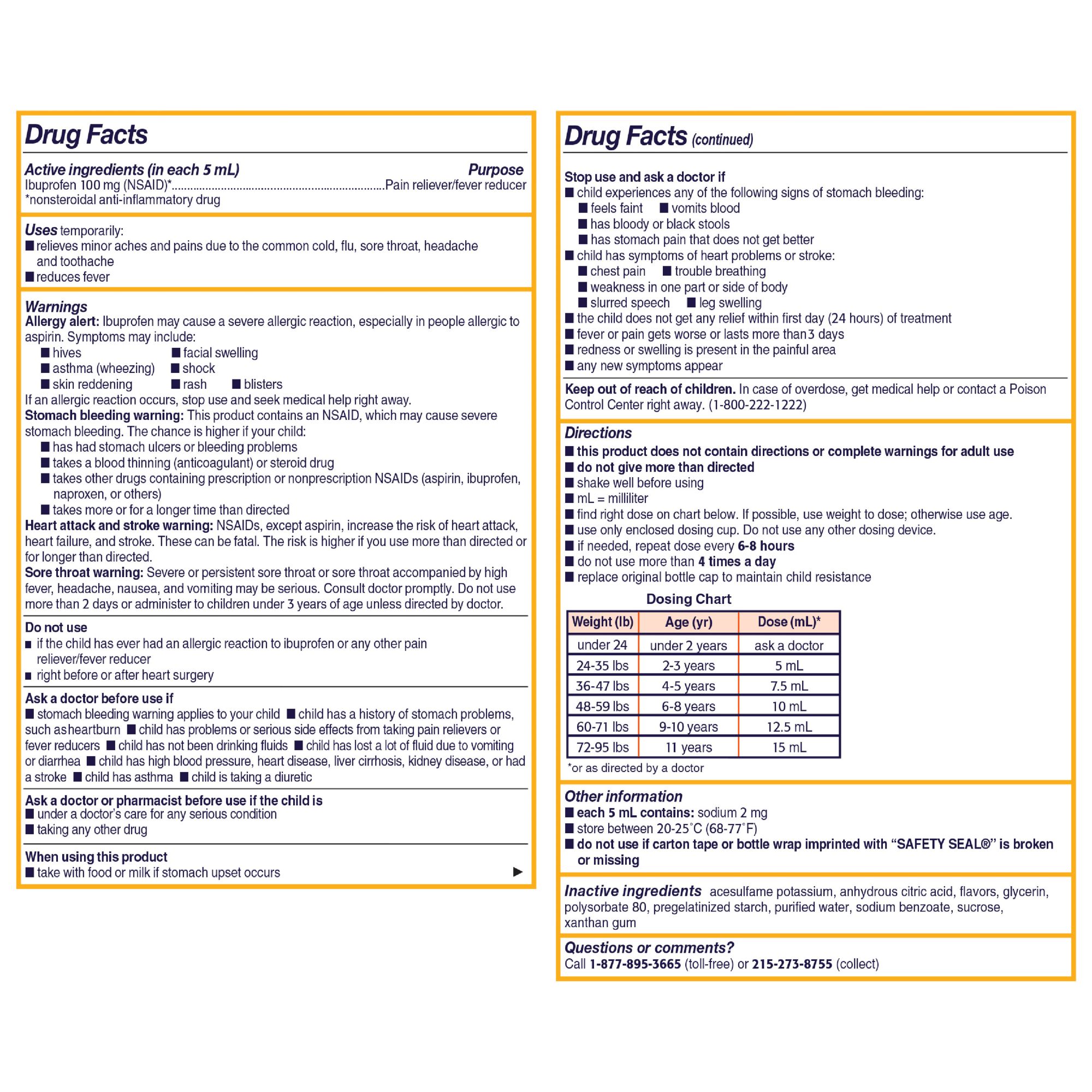 Children's Motrin oral suspension liquid medicine with ibuprofen in a kid-friendly berry flavor Temporarily relieve your child's minor aches & pains due to common cold, flu and sore throat This kid’s oral suspension formula also provides quick temporary relief of headaches & toothaches Formulated with the NSAID ibuprofen, the liquid medicine is both a pain reliever & fever reducer This dye-free liquid medicine comes in a non-staining and a kid-friendly original berry flavor The enclosed dosing cup can make dosing and administering the kid's pain reliever easy Oral medicine is intended for children ages 2-11 years & provides temporary relief up to 8 hours Each 5mL of this oral suspension contains 100mg of ibuprofen, for effective pain relief