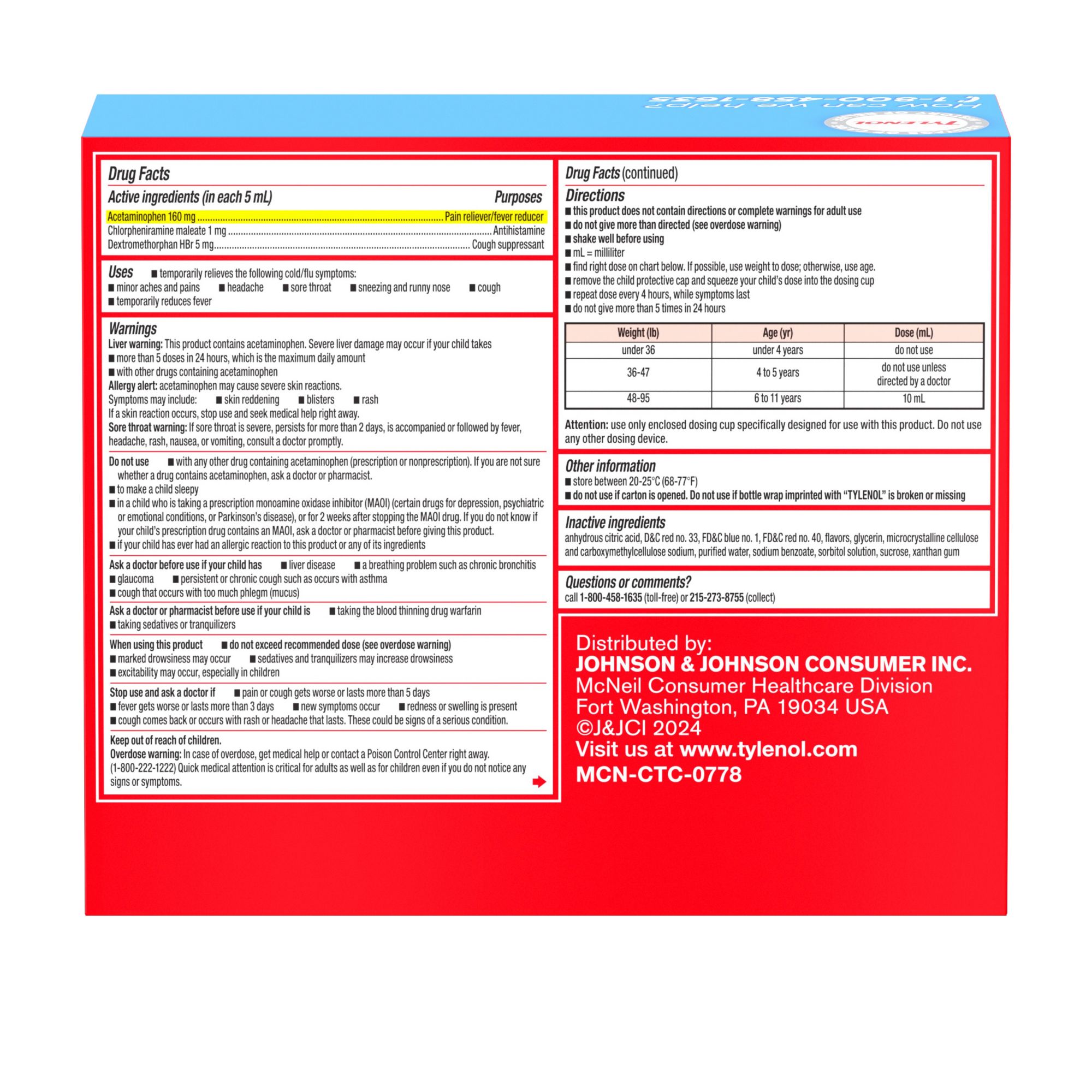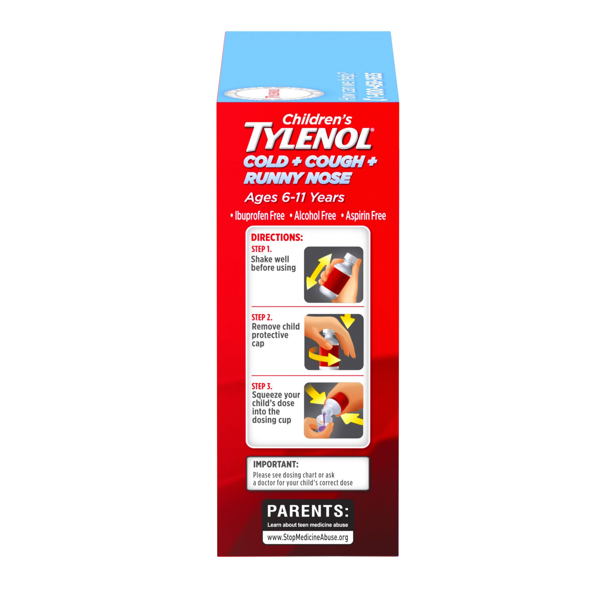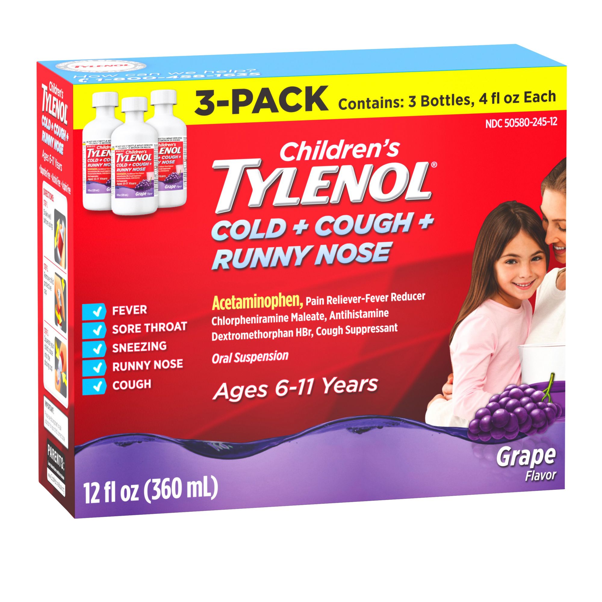 Intended for kids 6 to 11 years of age, Children's Tylenol Cold + Cough + Runny Nose Oral Suspension provides temporary relief from a range of cold and flu symptoms, including minor aches and pains, sore throat, runny nose, sneezing, and cough. The formula of this liquid cold medicine also temporarily reduces fever and starts working fast. Each 5-milliliter dose of this children's medicine contains 160 milligrams of the pain reliever and fever reducer acetaminophen, 1 milligram of the antihistamine chlorpheniramine maleate, and 5 milligrams of the cough suppressant dextromethorphan HBr. This kids' cold, runny nose, and cough syrup also comes in a kid-friendly grape flavor and is ibuprofen-free, alcohol-free, and aspirin-free, so it's gentle on the tummy. From the #1 pediatrician recommended brand for pain & fever relief, Tylenol has been used by parents decade after decade.