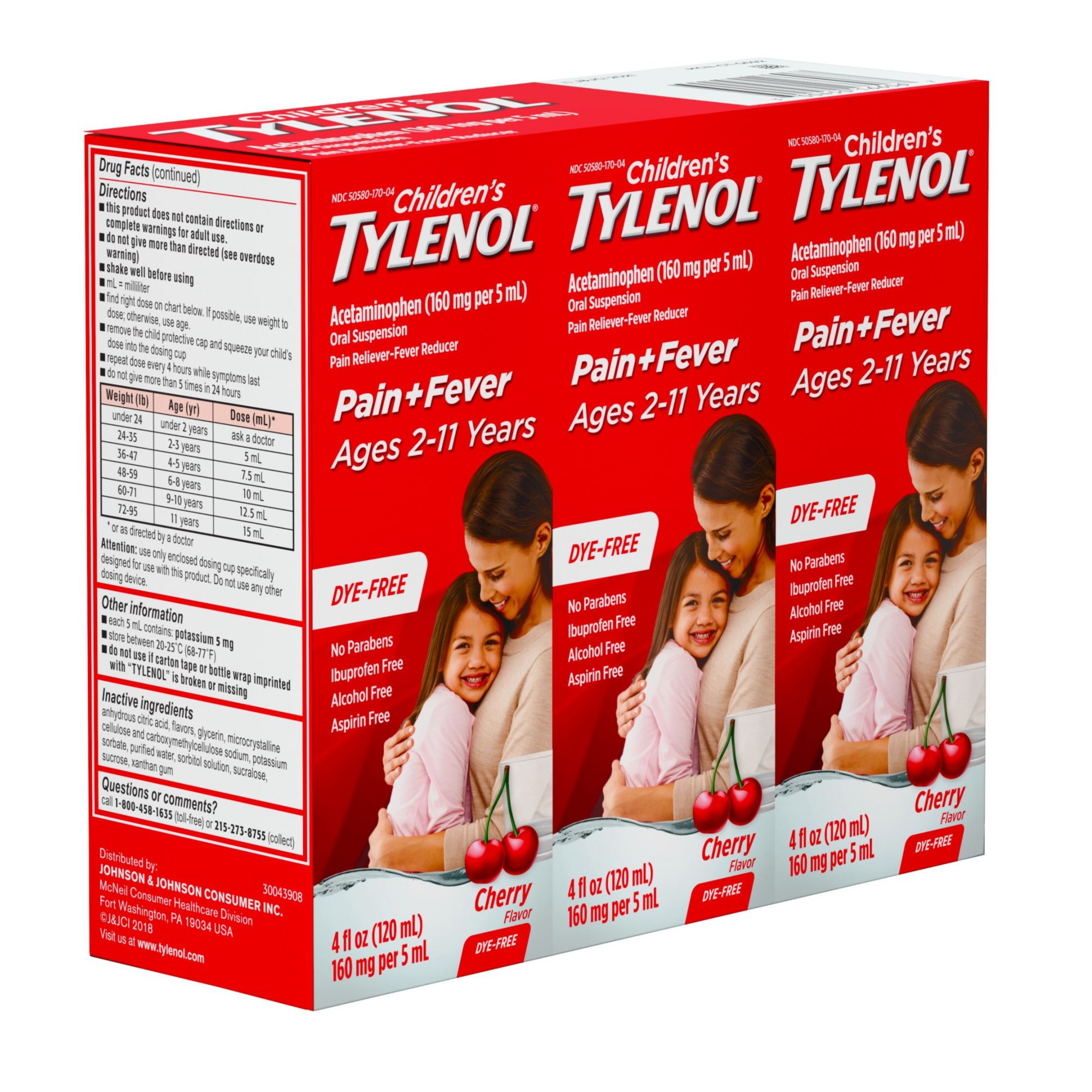 Children's Tylenol Pain + Fever Dye-Free Medicine Cherry Flavor, 3 x 4 fl. oz.