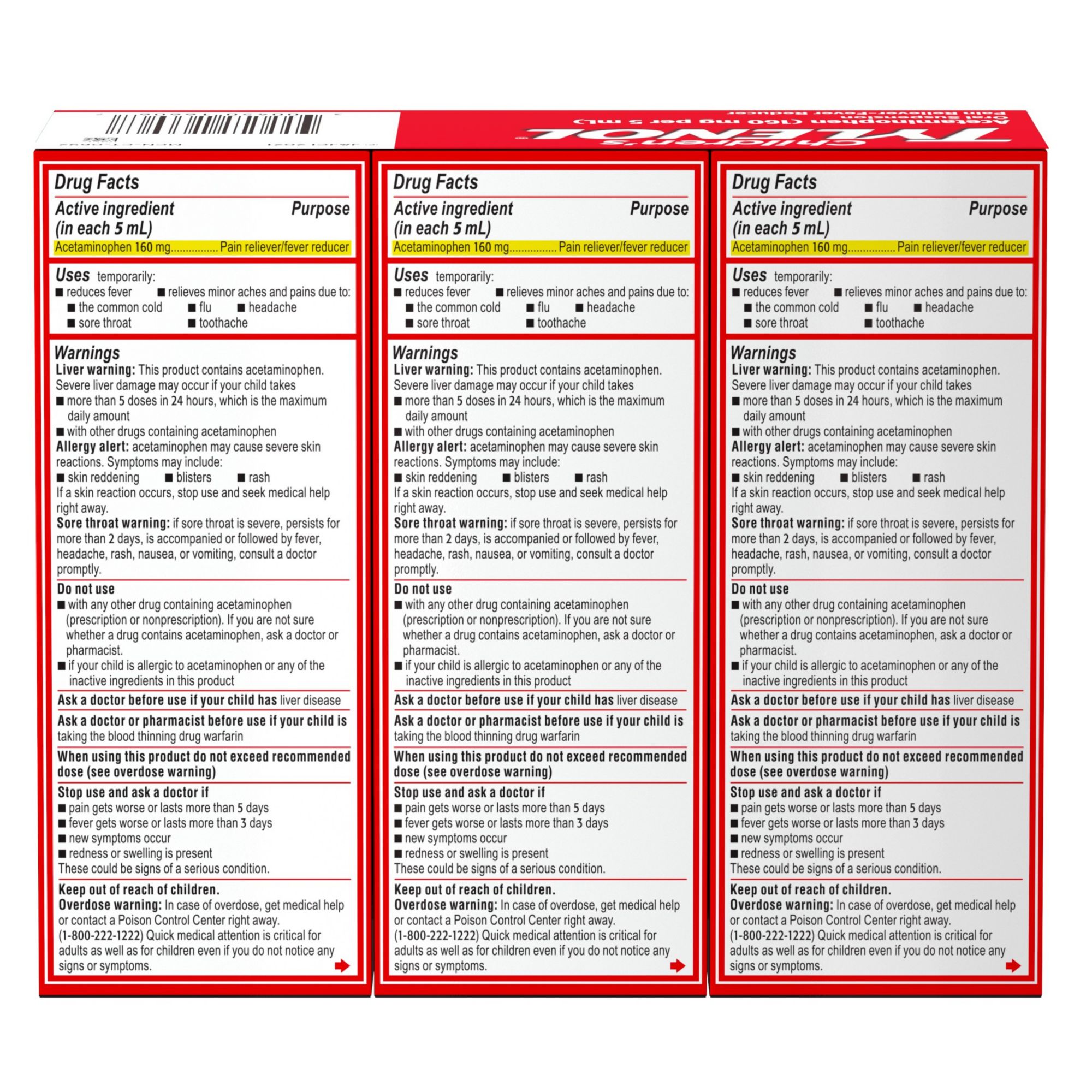 Children's Tylenol liquid oral suspension medicine with acetaminophen for pain and fever relief Helps temporarily relieve cold and flu symptoms, including fever, sore throat and headache The liquid kids' medicine starts working fast to also relieve toothache & temporarily reduce fever Each 5mL dose contains 160mg acetaminophen fever reducer & pain reliever for minor aches & pains The medicine can be used by children 2 to 11 years & comes in a kid-friendly dye-free cherry flavor The effective formula is ibuprofen-, aspirin-, alcohol and dye-free and is gentle on the tummy Tylenol is the #1 pediatrician recommended brand for pain & fever relief Effective children's cold & flu symptom relief from the brand parents have used for over 60 years