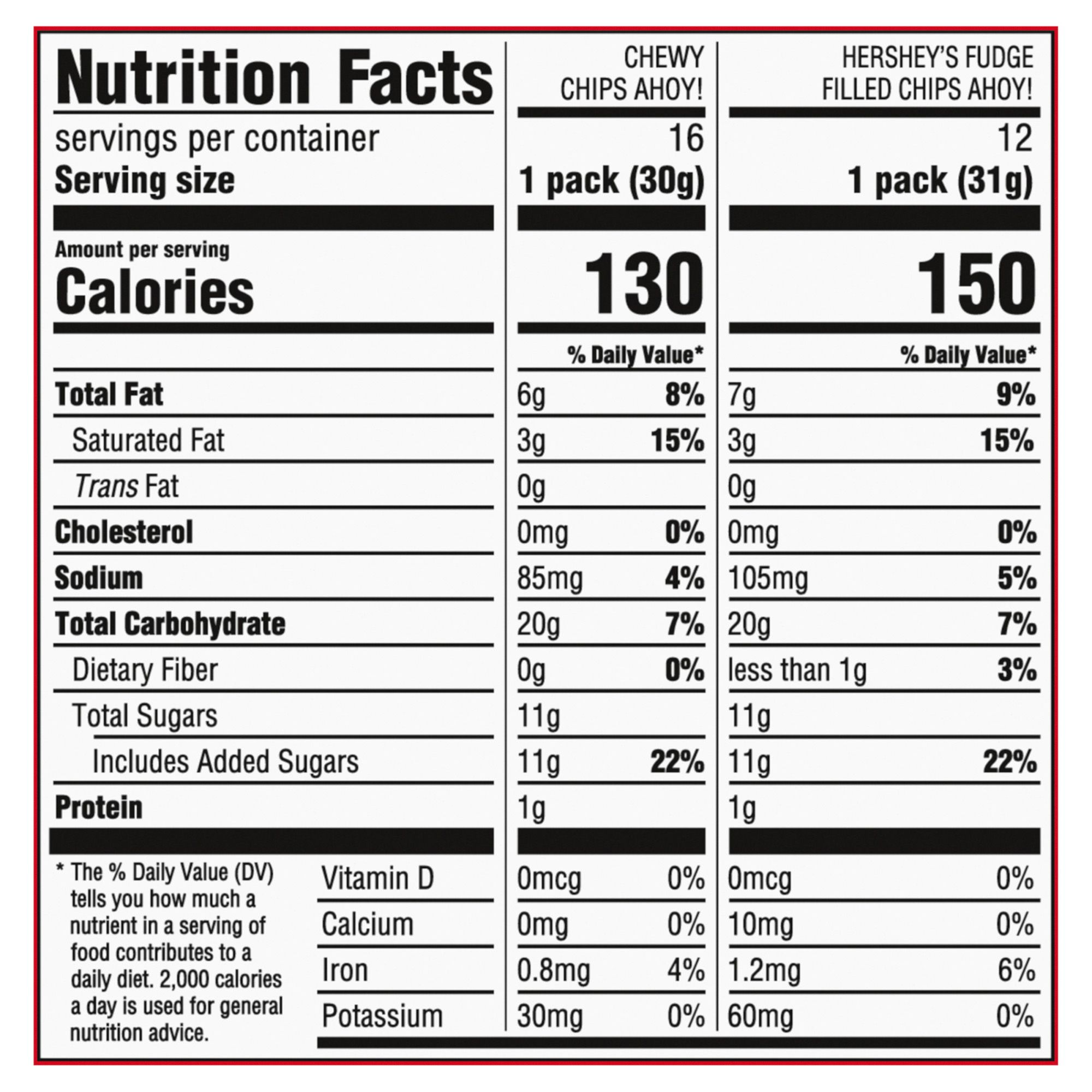 Chips Ahoy Chewy Chocolate Chip Cookies & Chewy Hershey’s Fudge Filled Soft Cookies Variety Pack contains Chewy Chips Ahoy soft cookies in two varieties: classic chocolate chip and chocolate chip with Hershey’s fudge. Chips Ahoy Chewy Cookies are the Chips Ahoy cookies you know and love, but baked to be perfectly soft and chewy. Each package includes 16 snack packs of the original fan favorite Chips Ahoy Chewy Chocolate Chip Cookies and 12 snack packs of Chips Ahoy Chewy Hershey’s Fudge Filled Soft Cookies. Chewy Chips Ahoy cookies have a classic flavor - perfect for when you want delicious and crispy chocolate chip cookies. Grab the Hershey’s fudge-filled variety to fulfill your craving for delicious, chocolate-sweet treats. Enjoy the comforting taste of these classic cookies that are sure to become a household favorite. Make lunches at school or work more exciting by including Chips Ahoy cookie bags as a sweet treat. Grab a pack of these chewy cookies as birthday cookies or party favors to prep for a party or gathering. For an after-dinner treat, simply open a bag of these chewy cookies and enjoy them with a cold glass of milk or as an ice cream topper. These cookie packs are also great for selling at concession stands during sporting events or performances. You can even gift them on the holidays as stocking stuffers and Easter basket fillers, or a satisfying alternative to Halloween candy. Regardless of the occasion, these bulk cookies are a simple, convenient and crowd-pleasing treat. Each box contains 28 packs of two cookies each. The packs are individually wrapped for easy portability and to maintain freshness and flavor.