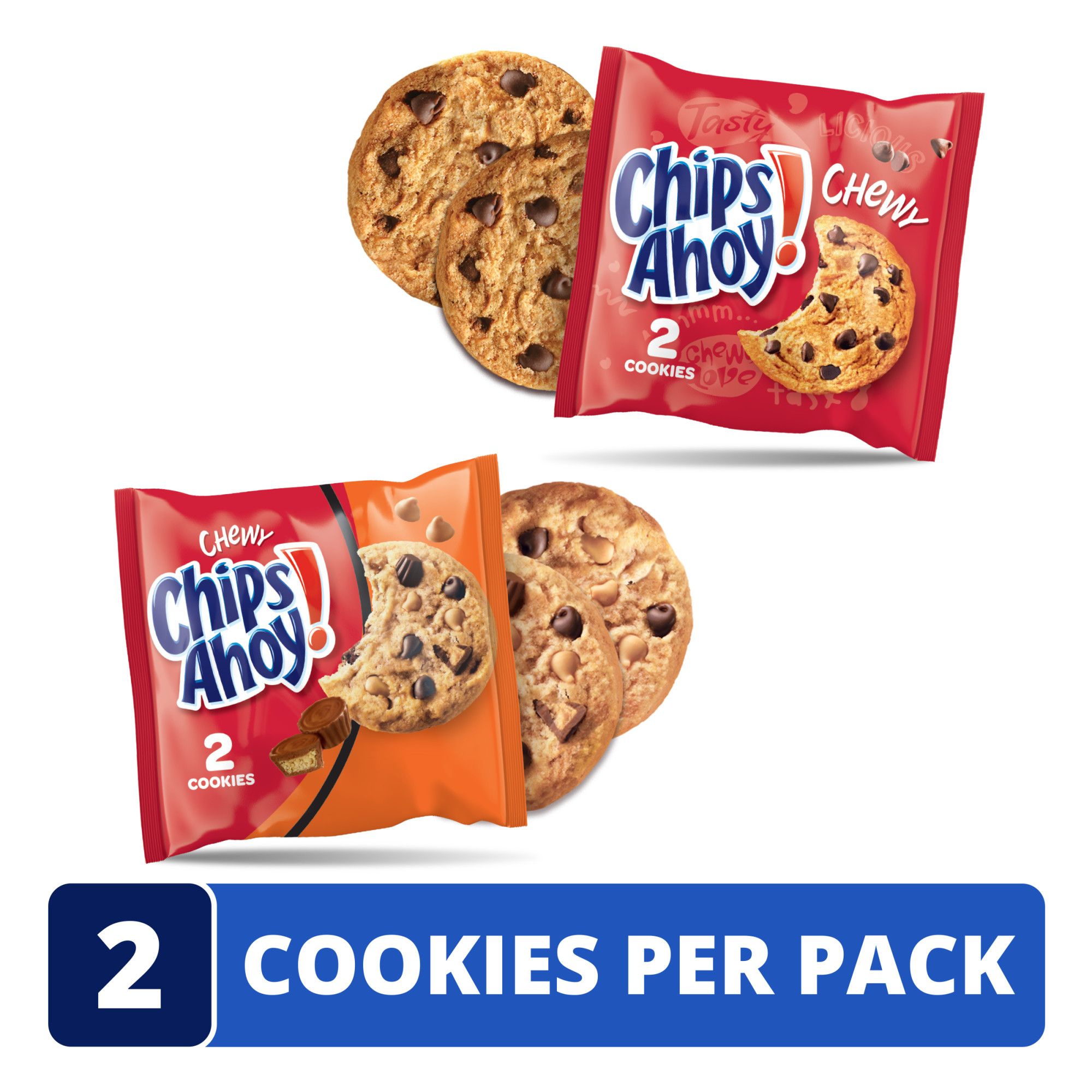 This Chips Ahoy Chewy Cookies Variety Pack contains Chewy Chips Ahoy soft cookies in two varieties: classic chocolate chip and chocolate chip with Reese's peanut butter cups. Chips Ahoy Chewy Cookies are the Chips Ahoy cookies you know and love, but baked to be perfectly soft and chewy. Each package includes 16 snack packs of Chips Ahoy Chewy Chocolate Chip Cookies and 12 snack packs of Chips Ahoy Chewy Chocolate Chip cookies with Reese's Peanut Butter Cup. Chewy Chips Ahoy cookies have a classic flavor - perfect for when you want delicious and crispy chocolate chip cookies. Grab the Reese's peanut butter cup variety to fulfill your craving for peanut butter chocolate sweet treats. Enjoy the comforting taste of these classic cookies that are sure to become a household favorite. Make lunches at school or work more exciting by including Chips Ahoy cookie bags as a sweet treat. Grab a pack of these soft baked chewy cookies as birthday cookies or party favors to prep for a party or gathering. For an after-dinner treat, simply open a bag of these chewy cookies and enjoy them with a cold glass of milk or as an ice cream topper. These cookie packs are also great for selling at concession stands during sporting events or performances. You can even gift them on the holidays as stocking stuffers and Easter basket fillers, or a satisfying alternative to Halloween candy. Regardless of the occasion, these bulk cookies are a simple, convenient and crowd-pleasing treat. Each box contains 28 packs of two cookies each. The packs are individually wrapped for easy portability and to maintain freshness and flavor.