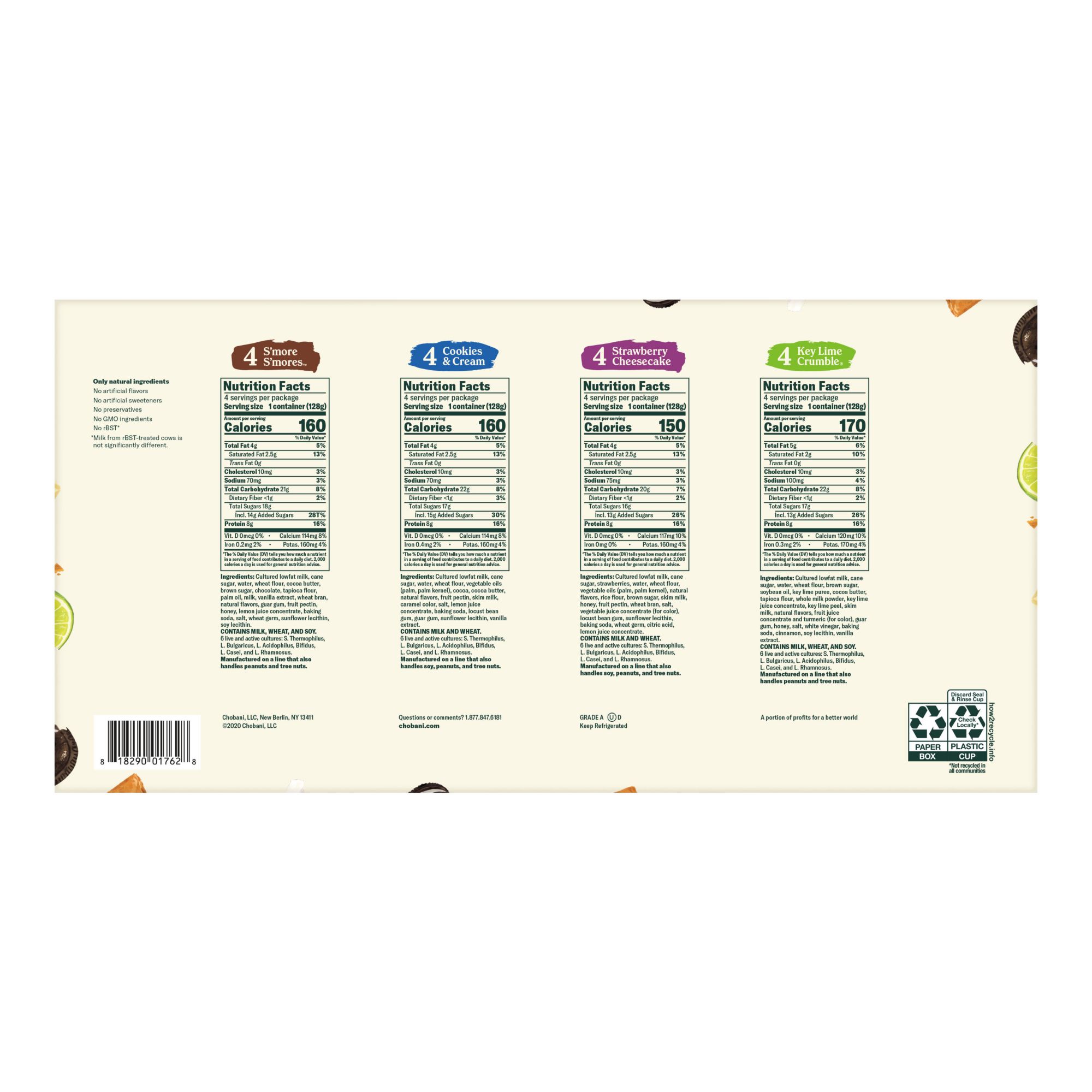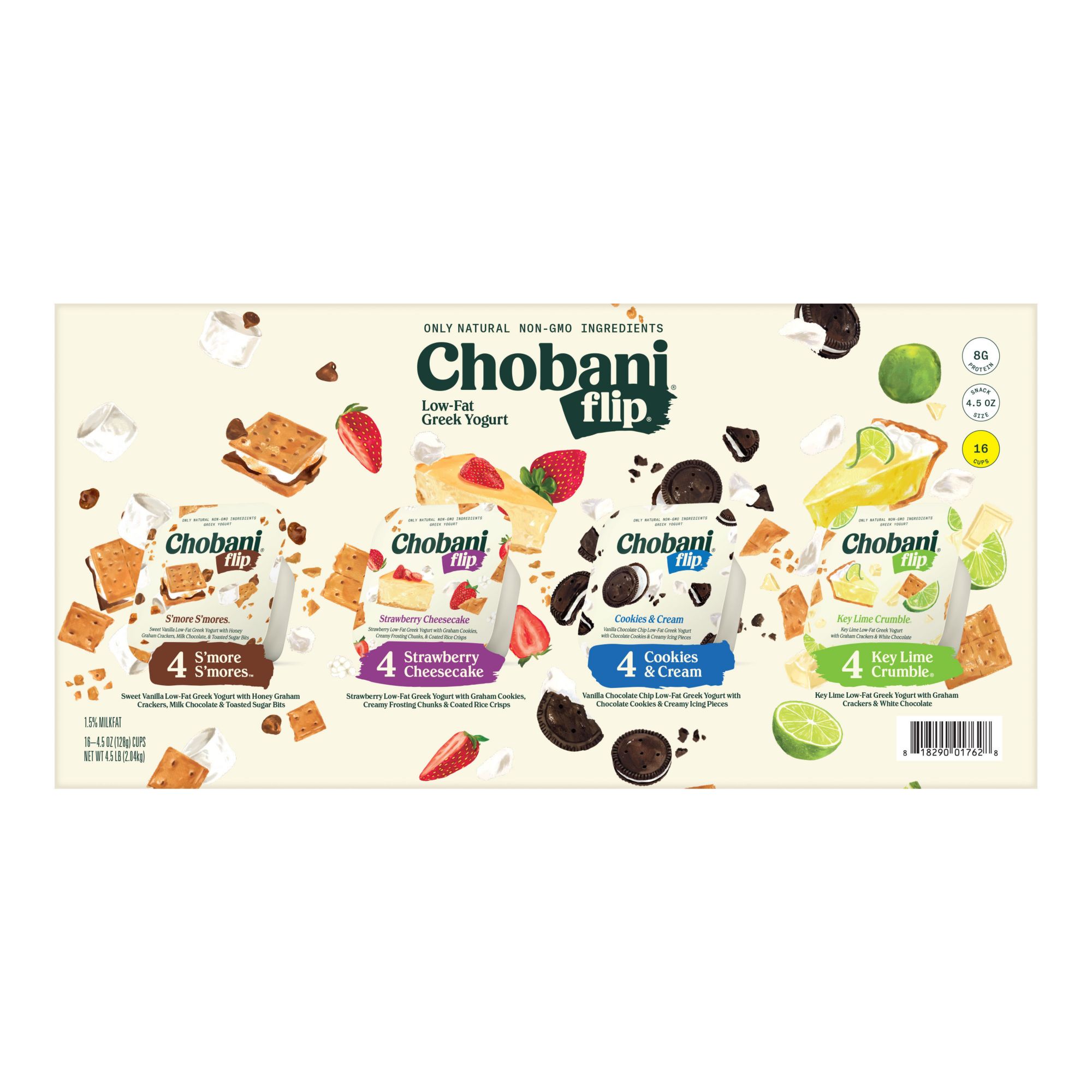 Chobani Flip Greek Yogurt is a delicious Greek Yogurt snack made with only natural mix-ins. It's the perfectly portioned, anytime treat made with zero artificial ingredients. Contains four Chobani Flip favorites. S'Mores, Cookies & Cream, Strawberry Cheesecvake and Key Lime Crumble. Something for everyone.