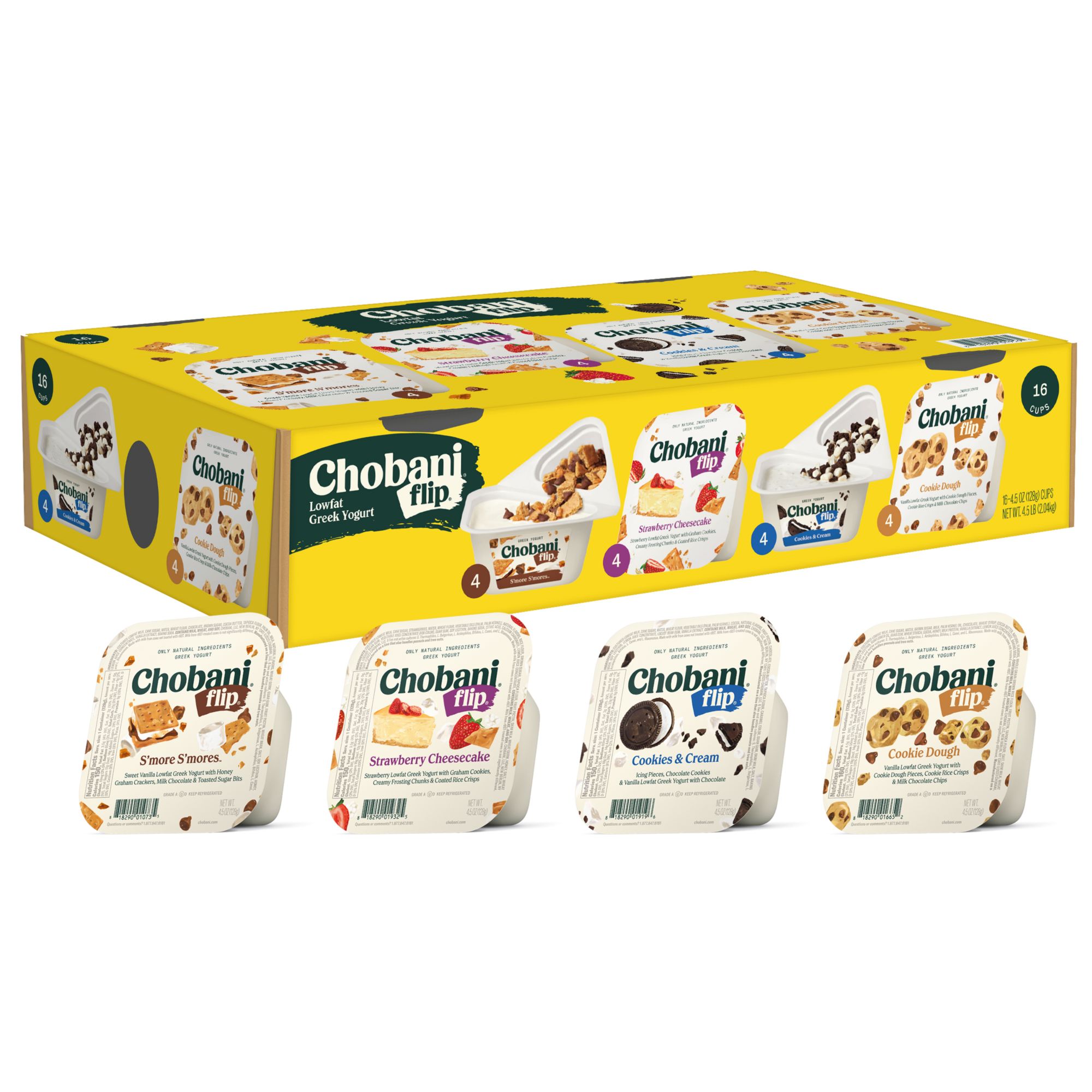 Chobani Flip Greek Yogurt is a protein packed Greek Yogurt anytime snack with delicious, all-natural mix-ins. Fun and flavorful, Chobani Flip Greek Yogurt is a good source of protein, making it a great choice for breakfast or an anytime snack the whole family will love. It's the perfectly portioned, anytime treat made with zero artificial ingredients. The Club pack contains four great Chobani Flip favorites. S'Mores with Vanilla Greek Yogurt meets honey graham crackers, toasted bits, and milk chocolate. Cookies & Cream with vanilla Greek Yogurt chock full of chocolate cookies and creamy icing pieces. Strawberry Cheesecake made with real strawberry Greek Yogurt and tasty bits of graham cookies, frosting chunks, and coated rice crisps. Cookie Dough made with vanilla Greek Yogurt with real cookie dough pieces, cookies rice crisps and mini chocolate chips. This pack has something for everyone. These yogurts contain live and active cultures, including six probiotics, with non-GMO ingredients. Chobani is a food maker with a mission of making high-quality and nutritious food accessible to more people, while elevating communities and making the world a healthier place.