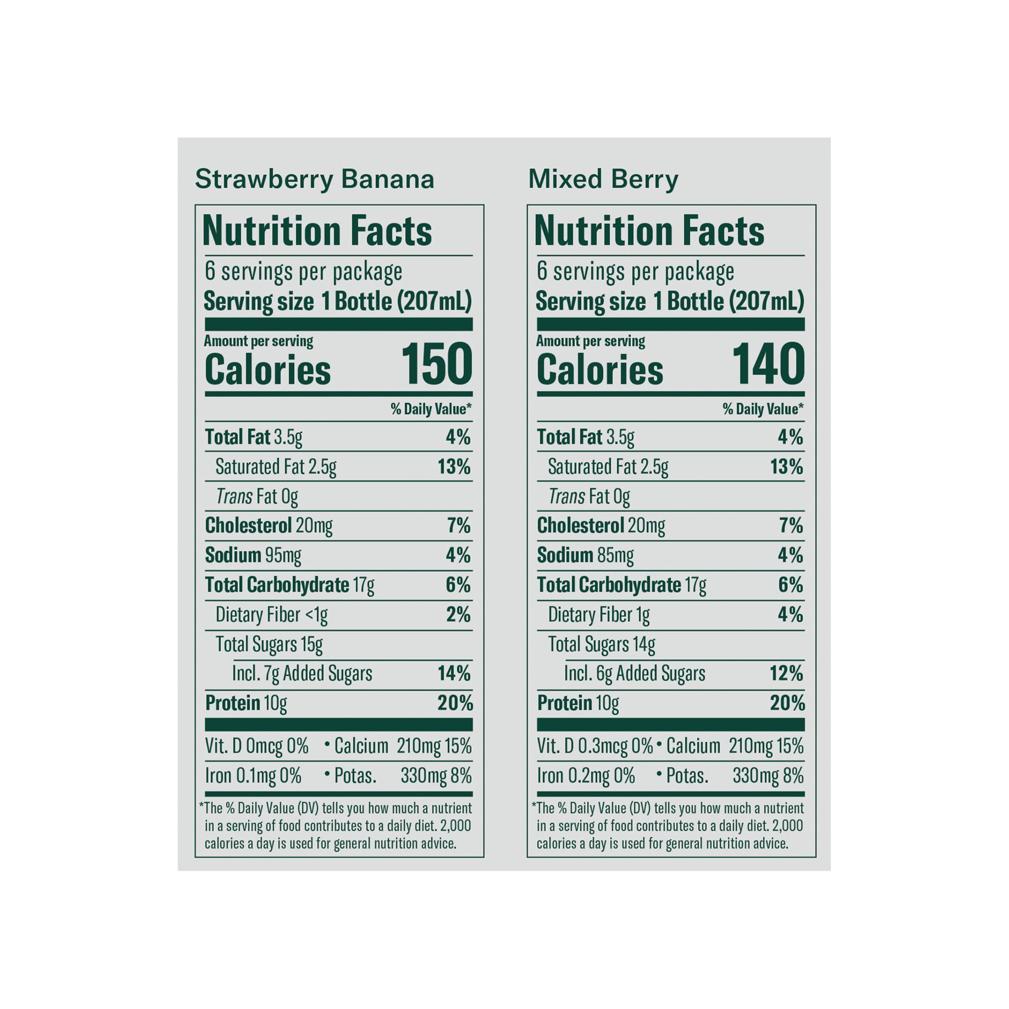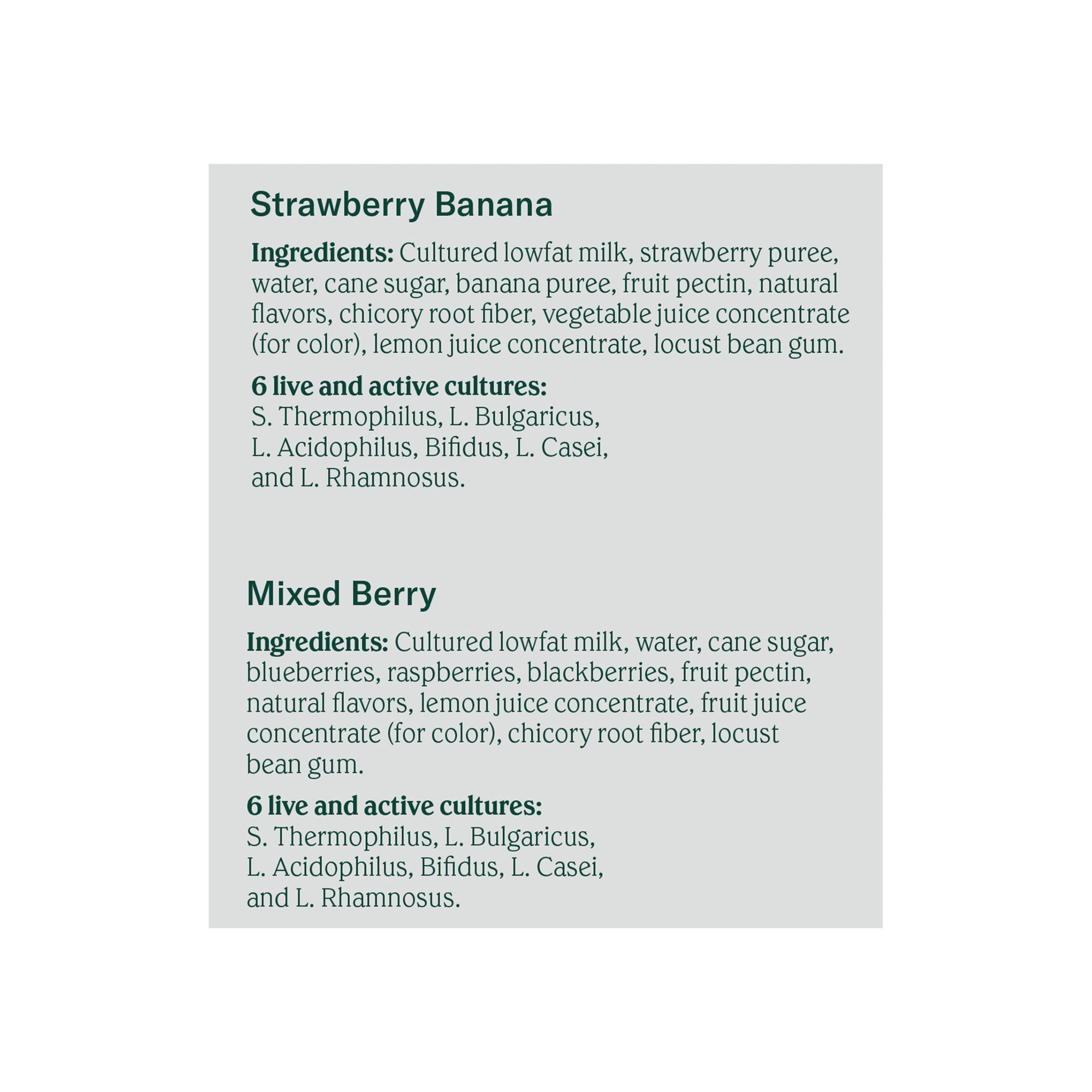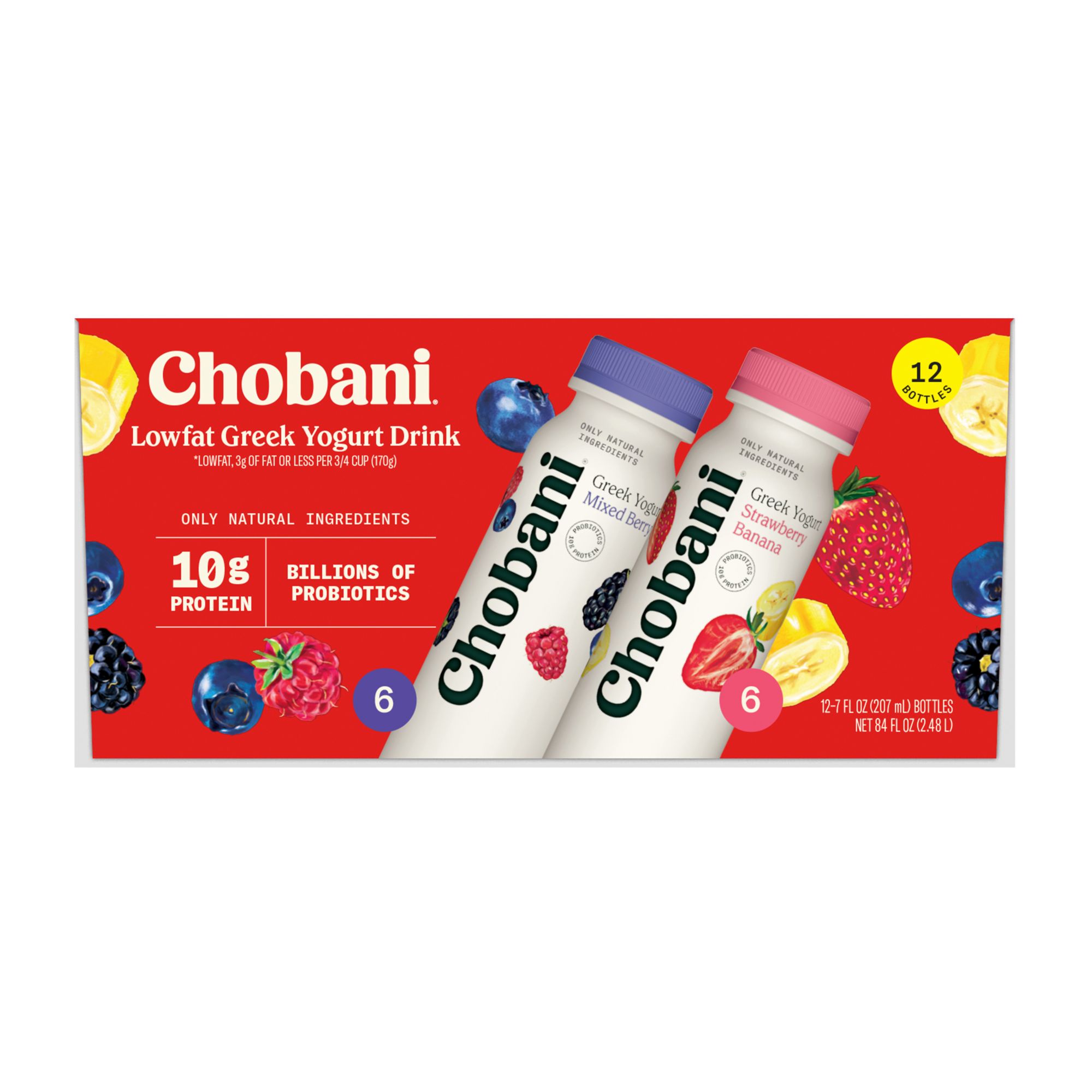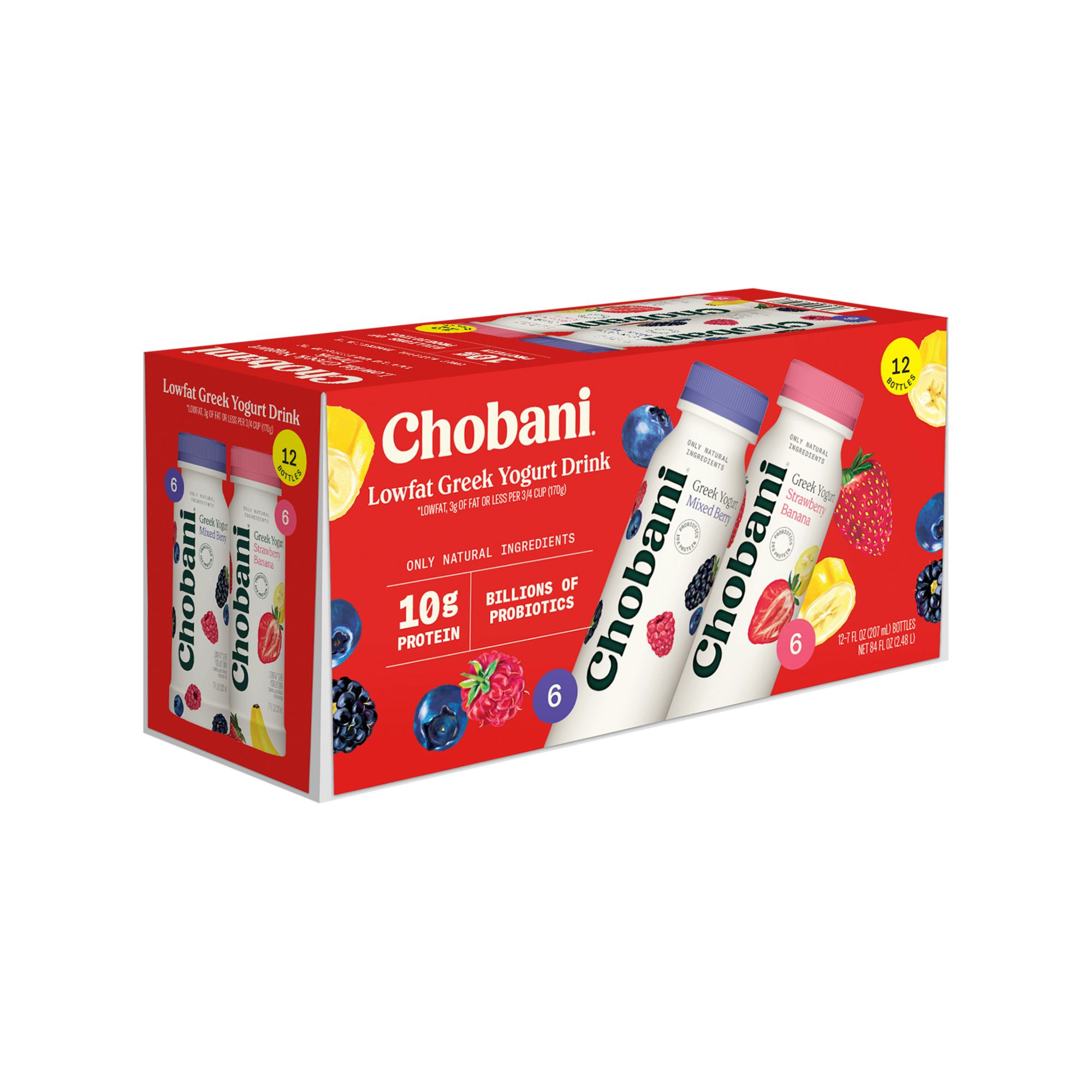 Features six strawberry banana and six mixed berry drinks Certified kosher and made with no GMO ingredients 1/3 less sugar and 14g of protein per serving Includes 12 Chobani low-fat Greek yogurt drink