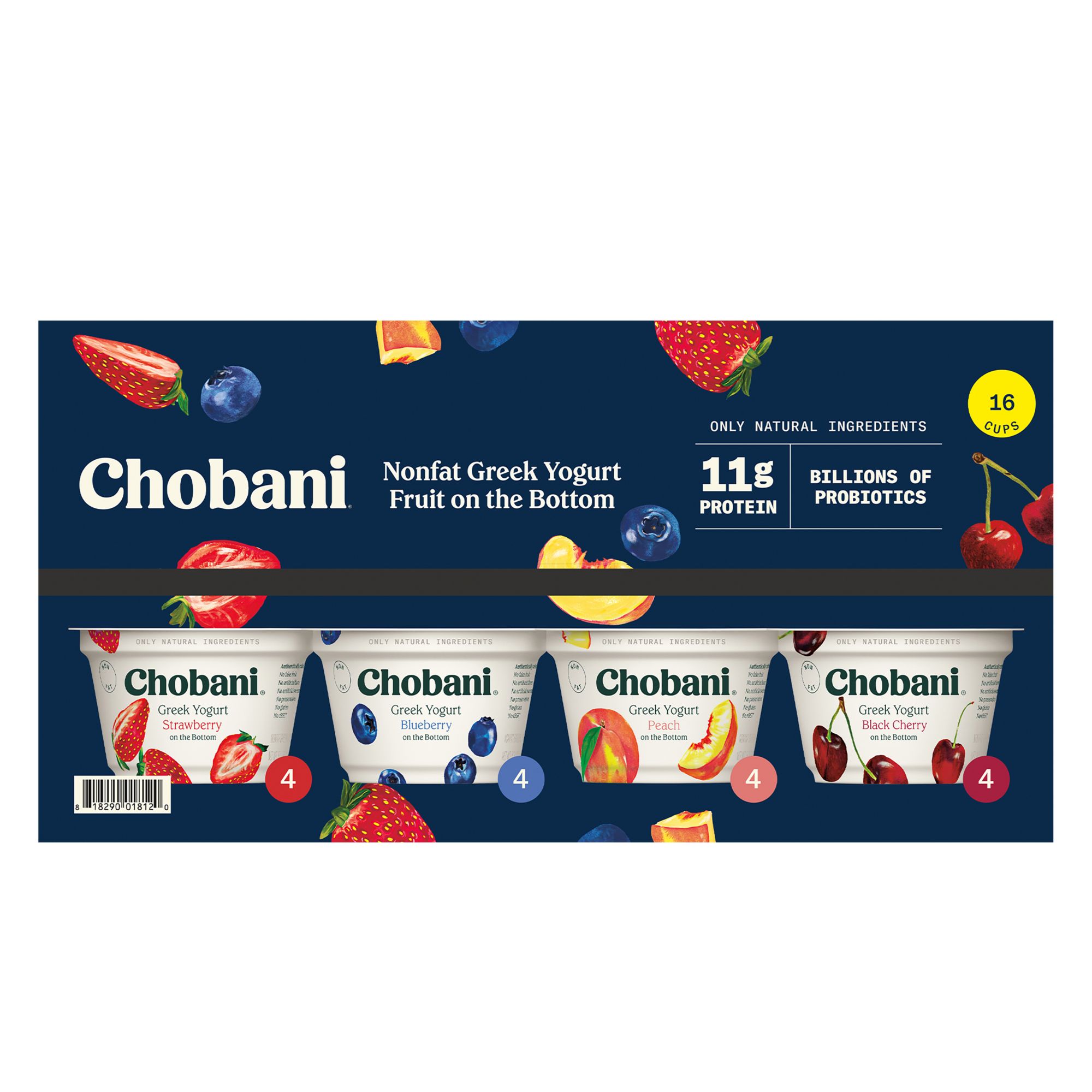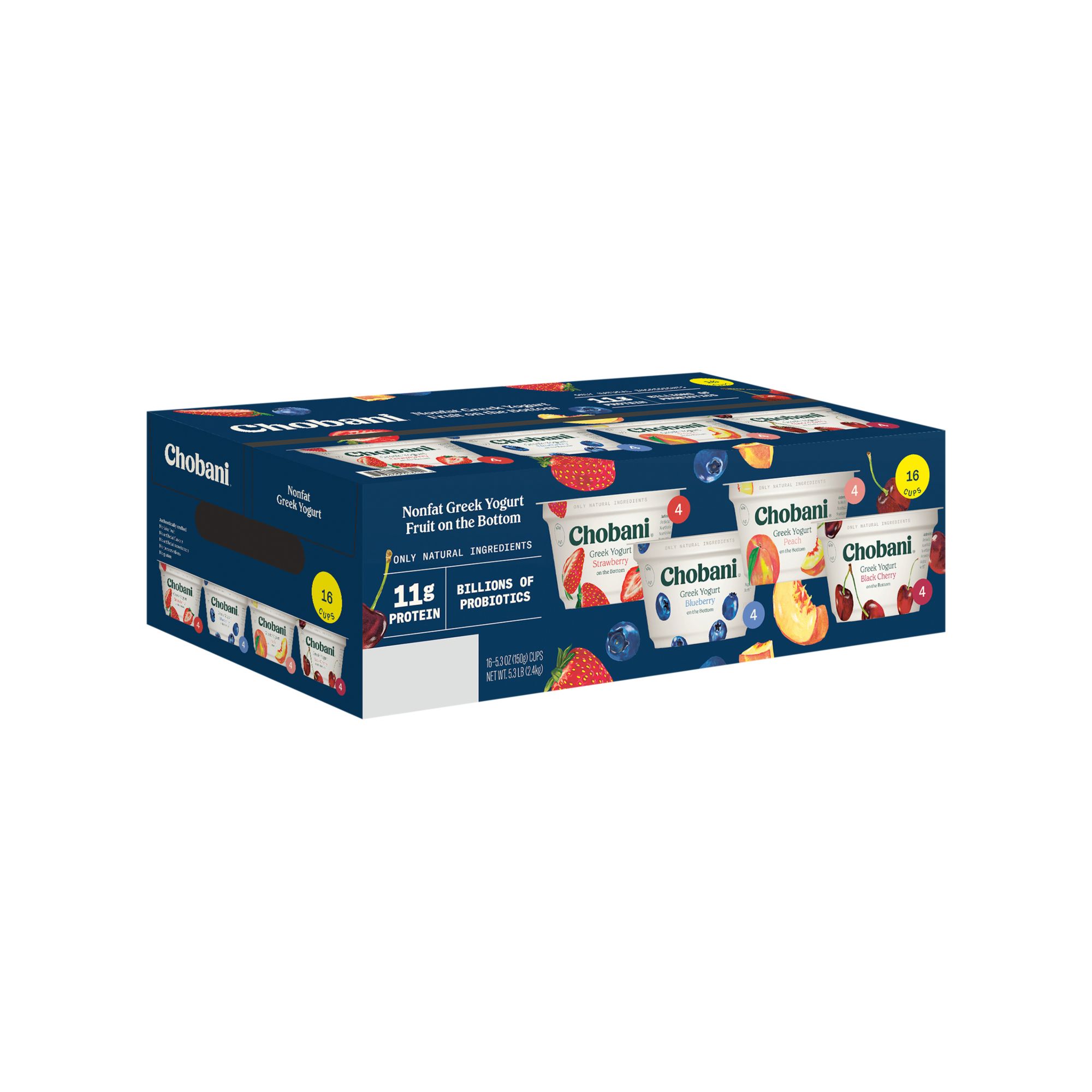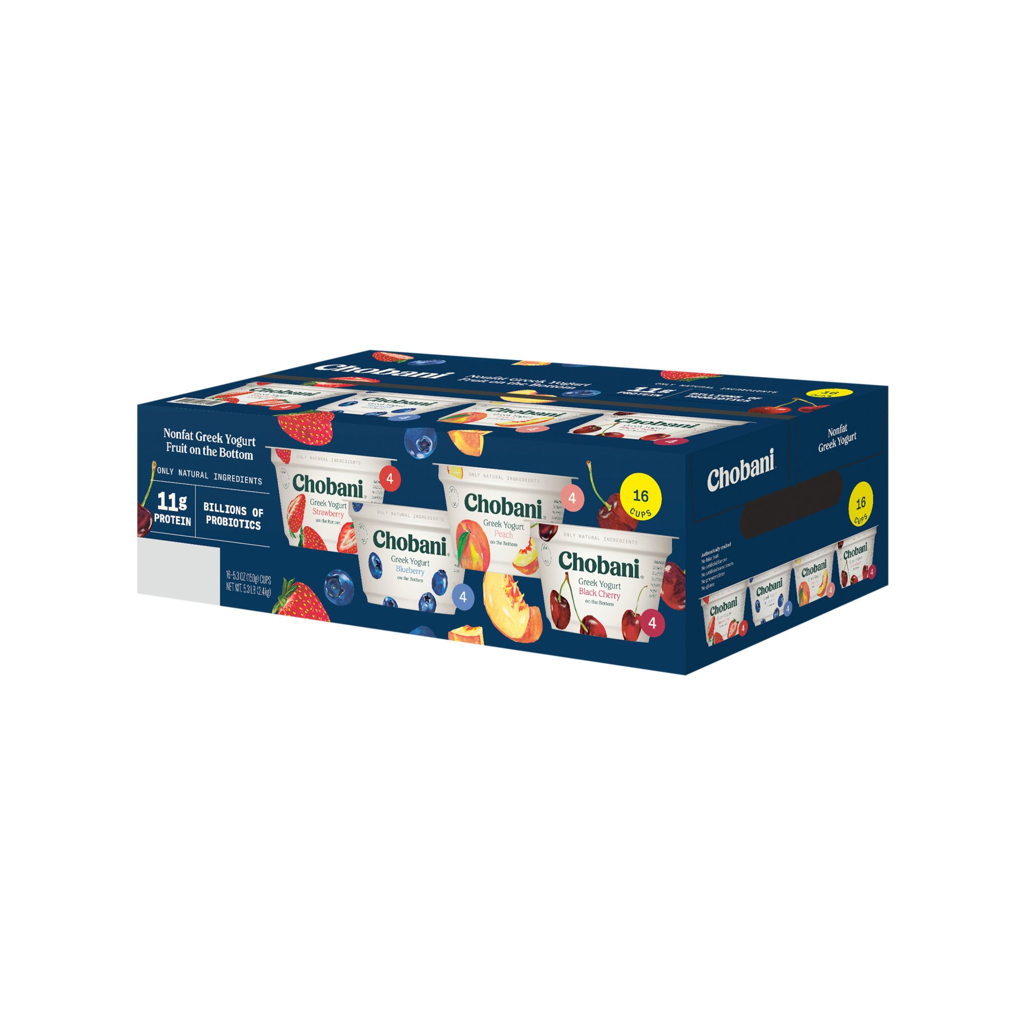 Contains 16 Delicious 5.3oz Chobani Greek Yogurt cups 4 Blueberry, 4 Strawberry, 4 Peach, 4 Black Cherry