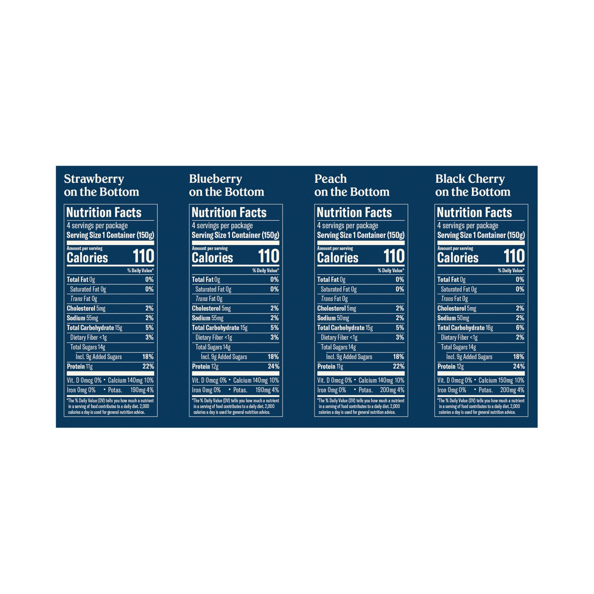 Ingredients: Strawberry on the Bottom: Cultured nonfat milk, strawberries, cane sugar, water, fruit pectin, natural flavors, guar gum, locust bean gum, fruit and vegetable juice concentrate (for color), lemon juice concentrate. 6 live and active cultures: S. Thermophilus, L. Bulgaricus, L. Acidophilus, Bifidus, L. Casei, and L. Rhamnosus. Blueberry on the Bottom: Cultured nonfat milk, blueberries, cane sugar, water fruit pectin, natural flavors, guar gum, locust bean gum, lemon juice concentrate. 6 live and active cultures: S. Thermophilus, L. Bulgaricus, L. Acidophilus, Bifudus, L. Casei, and L. Rhamnosus. Peach on the Bottom: Cultured nonfat milk, peaches, cane sugar, water, fruit pectin, natural flavors, guar gum, lemon juice concentrate, locust bean gum. 6 live and active cultures: S. Thermophilus, L. Bulgaricus, L. Acidophilus, Bifudus, L. Casei, and L. Rhamnosus. Black Cherry on the Bottom: Cultured nonfat milk, black cherries, cane sugar, water, fruit pectin, cherry juice concentrate, natural flavors, locust bean gum, guar gum, lemon juice concentrate. 6 live and active cultures: S. Thermophilus, L. Bulgaricus, L. Acidophilus, Bifudus, L. Casei, and L. Rhamnosus.