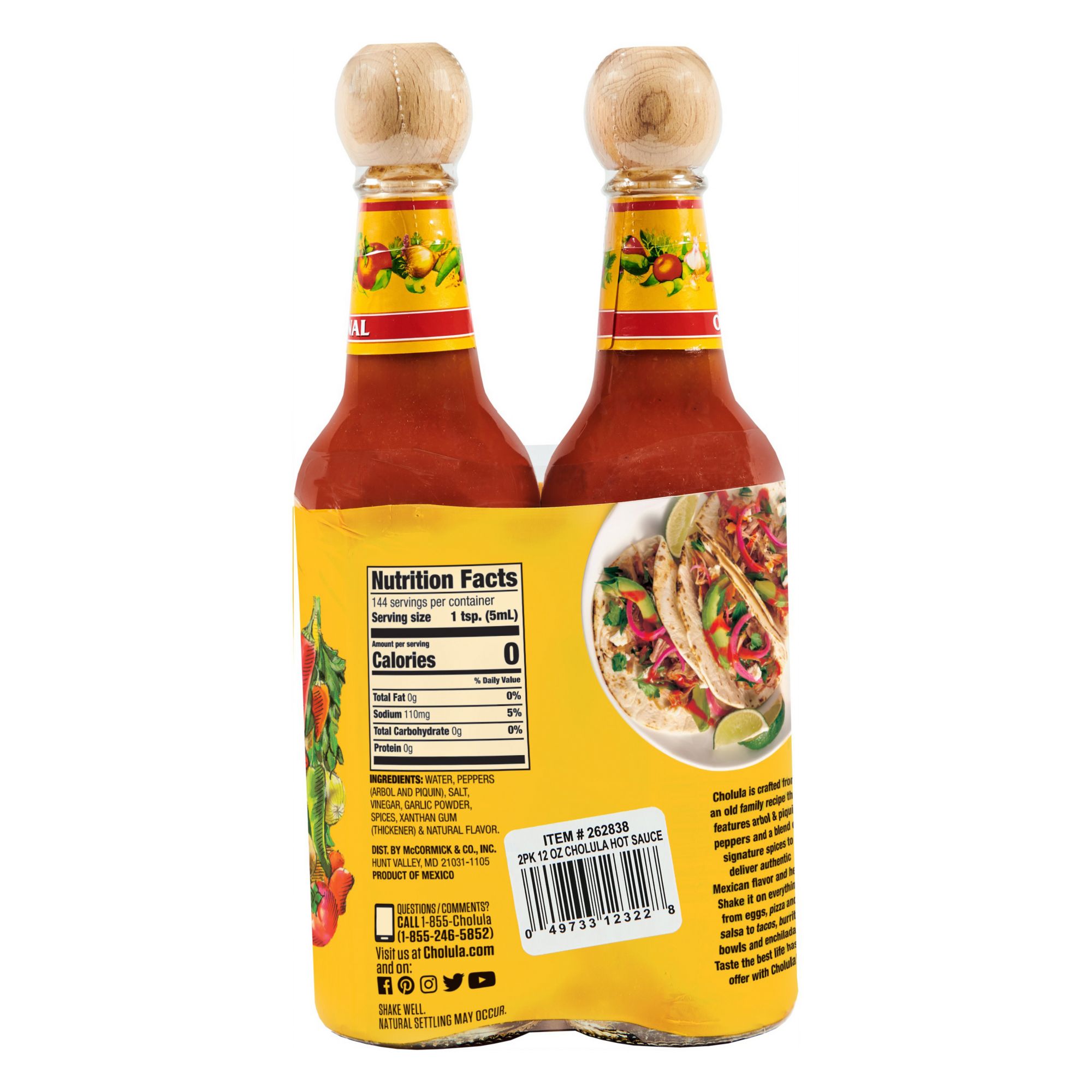 This is where it all started. Cholula Original Hot Sauce is crafted from a generations-old family recipe that features arbol and piquin peppers and a blend of regional spices to deliver authentic Mexican flavor and heat. Taste the best life has to offer with Cholula Original Hot Sauce. With the 2 pk. of 12 oz. bottles, the options are endless for this versatile medium-heat sauce. Shake it on everything from eggs and rice and beans to beverages and even pizza. Cholula loves it on both traditional Mexican enchiladas and tamales as well as new favorites like burrito bowls and fish tacos. From the distinctive wooden cap to the original recipe hot sauce inside, every bottle of Cholula is a celebration of great food, flavor and Cholula's Mexican roots.