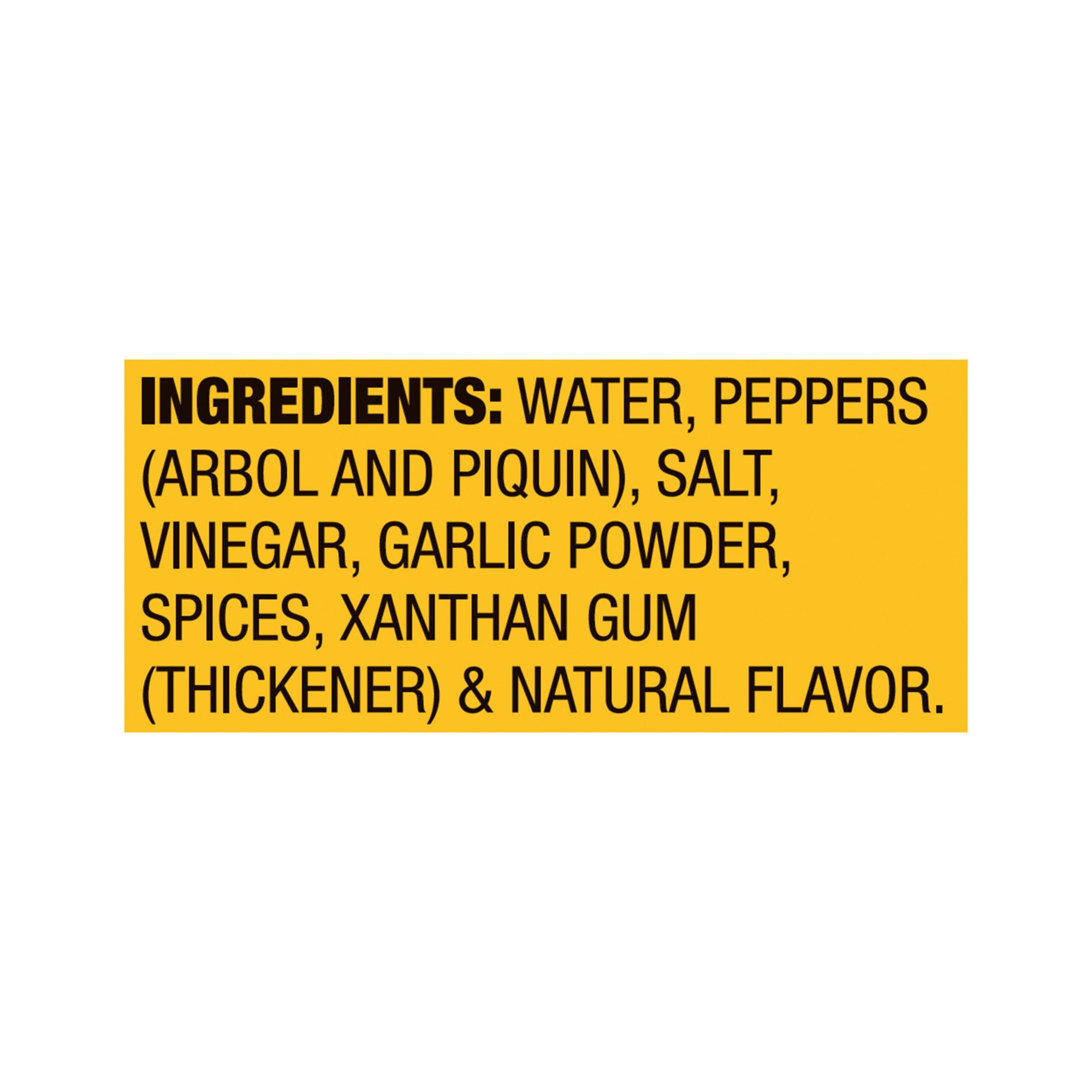 Water, Peppers (Arbol and Piquin), Salt, Vinegar, Garlic Powder, Spices and Xanthan Gum