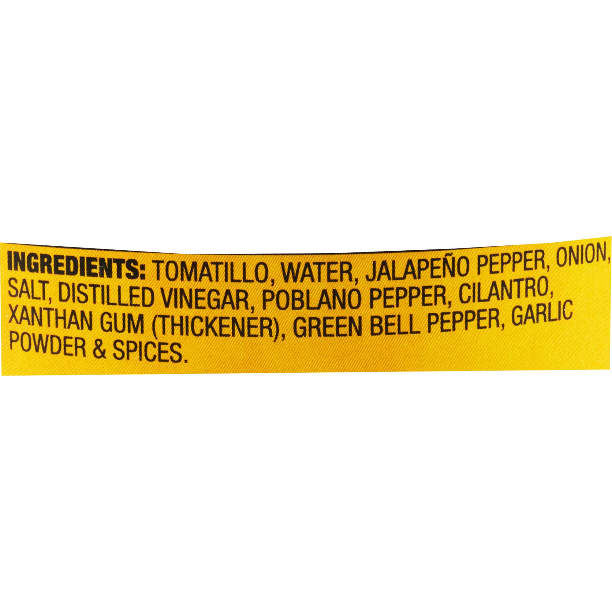 Ingredients: Tomatillo, Jalapeno Pepper, Onion, Water, Distilled Vinegar, Salt, Poblano Pepper, Dehydrated Cilantro, Xantham Gum (Thickener), Green Bell Pepper, Garlic Powder & Spices.