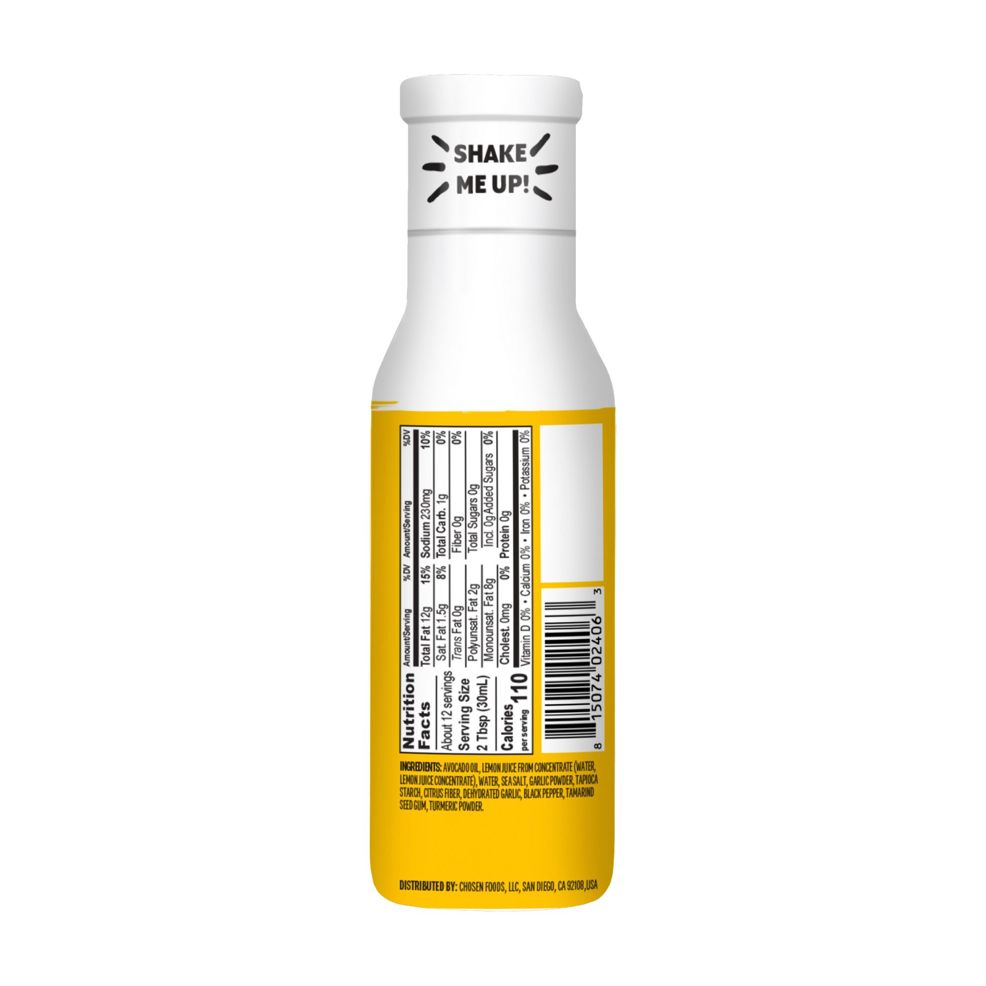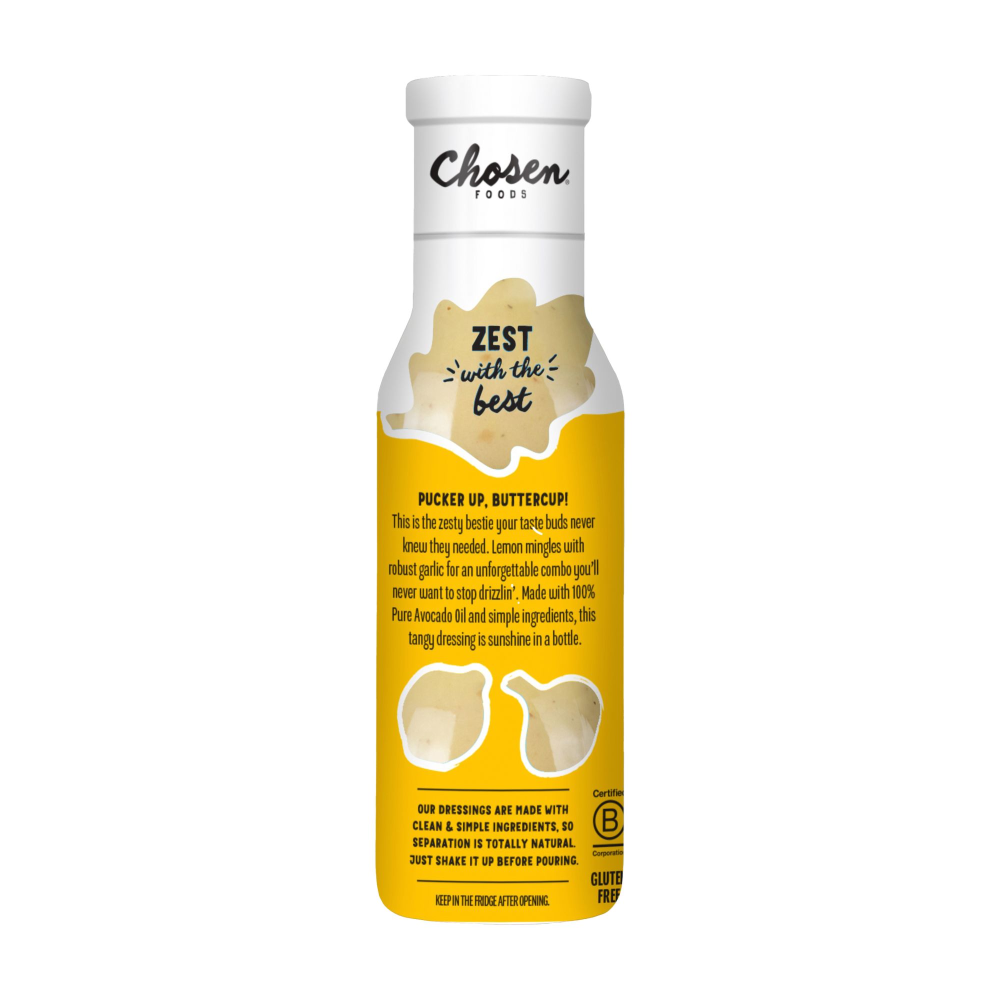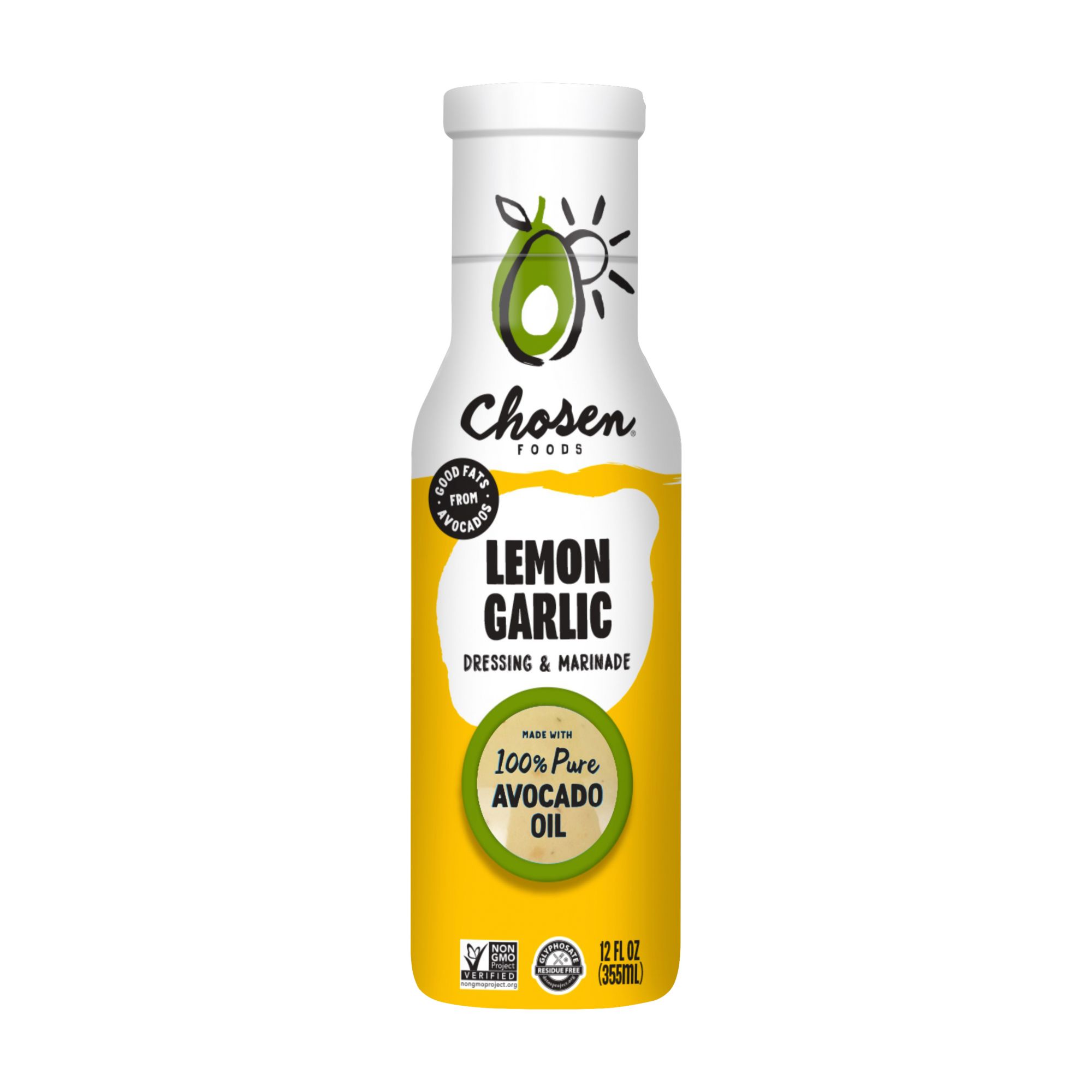 Chosen Foods Lemon Garlic Dressing 12 oz. Made with 100% pure Avocado Oil. Keto Friendly. Non-GMO. Certified Gluten Free. Good Fats from Avocados. Excellent on salads, veggies, fish, and meats. Perfect for marinating and dipping.