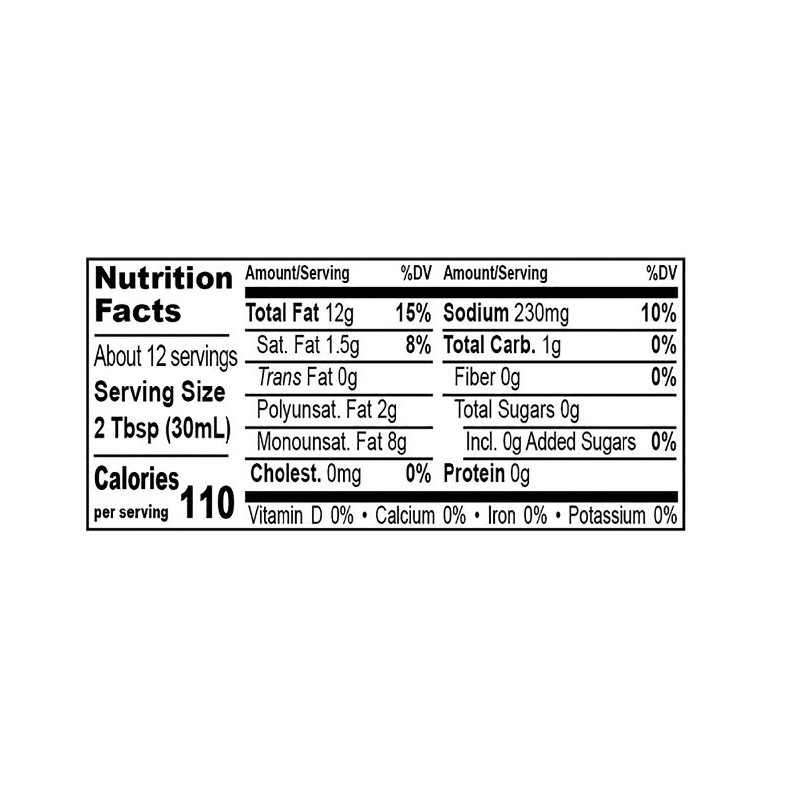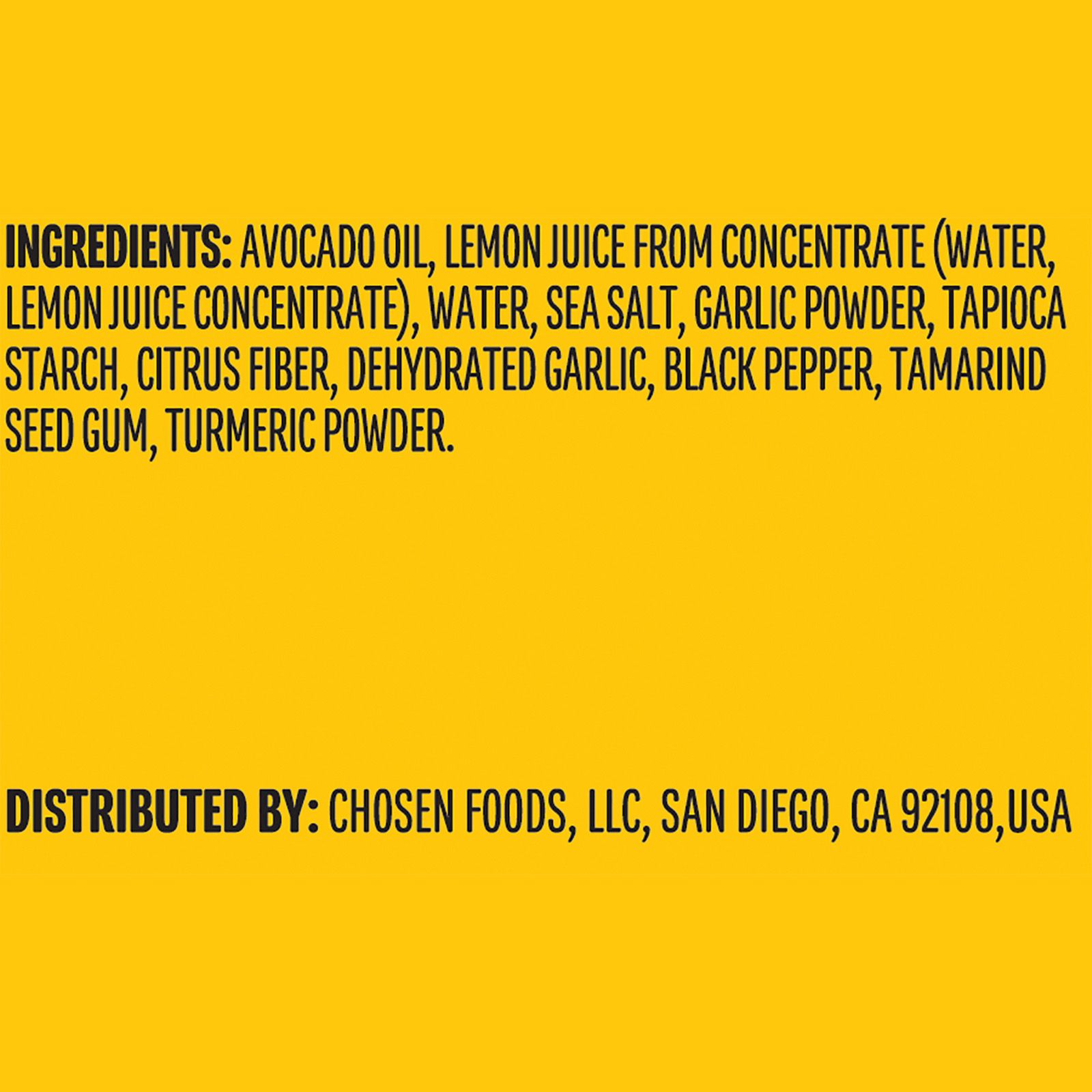 Ingredients: Avocado Oil, Lemon Juice from Concentrate (Lemon Juice Concentrate, Water), Filtered Water, Sera Salt, Garlic Powder, Dehydrated Garlic, Black Pepper, Xanthan Gum, Tumeric.