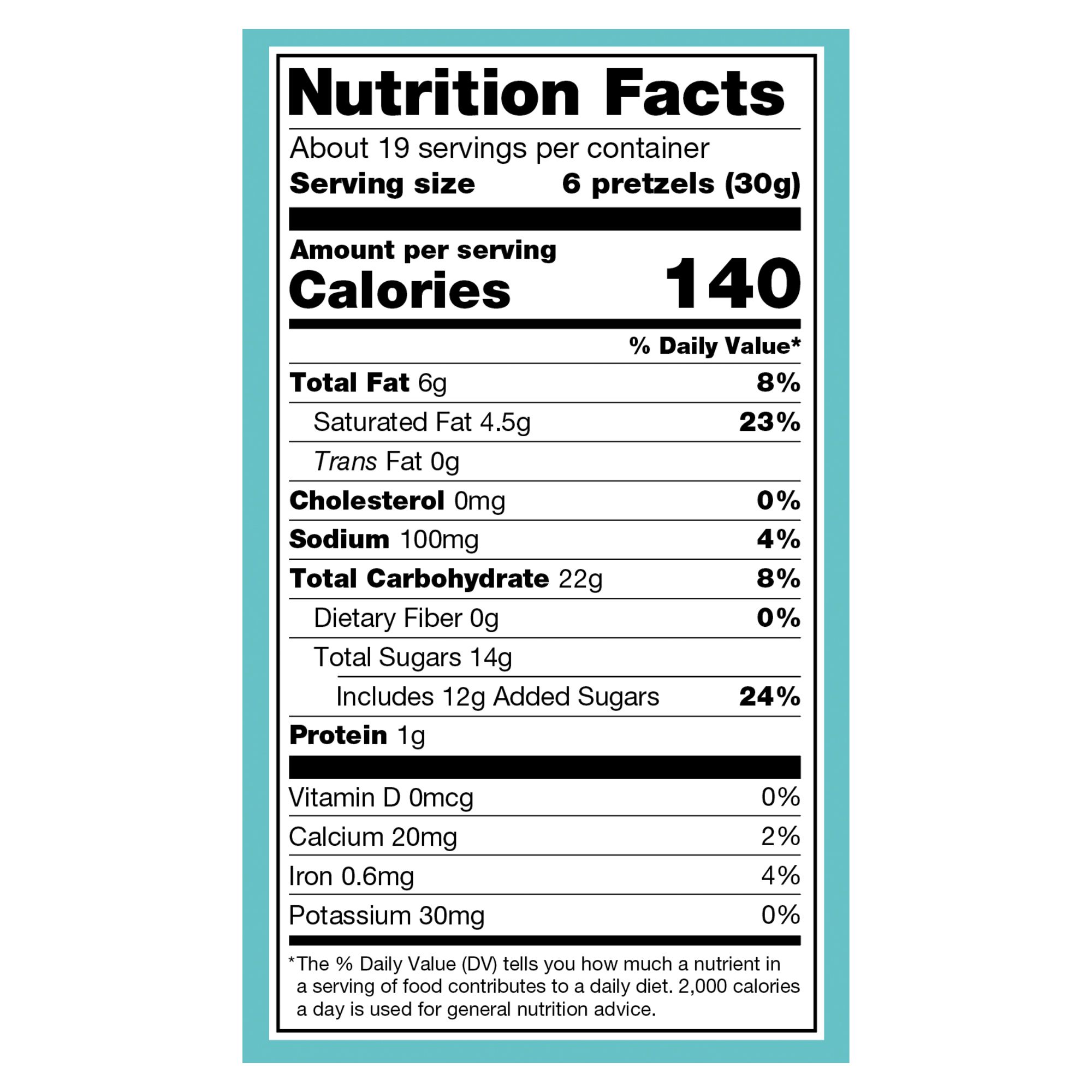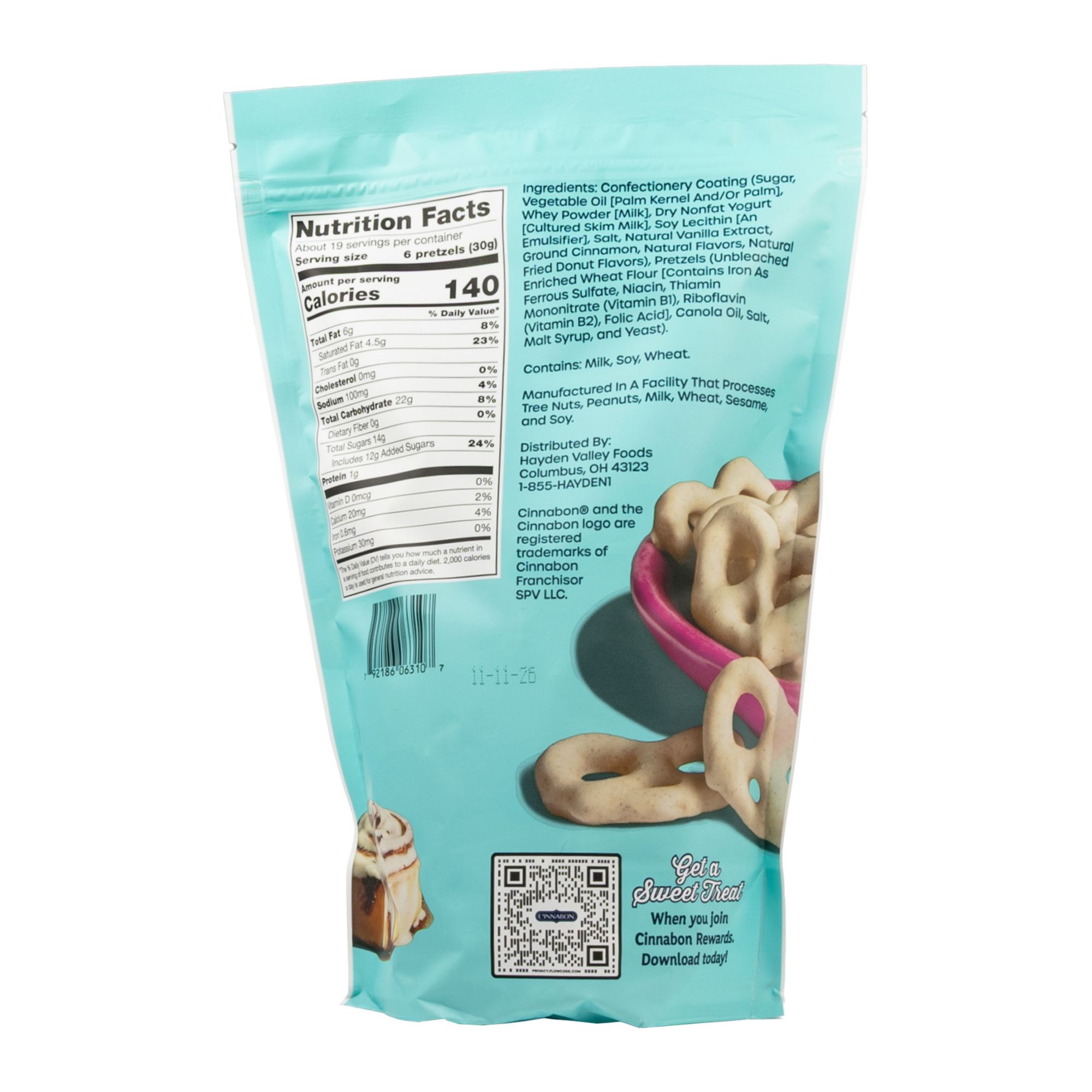 Ingredients: Cinnamon Roll Frosted Yogurt Flavored Coatng (Yogurt Flavored Confectonery Coatng ([Sugar, Vegetable Oil (Palm Kernel and/or Palm), Whey Powder (Milk), Dry Nonfat Yogurt (Cultured Skim Milk), Soy Lecithin (an Emulsifer), Salt, Natural Vanilla Extract]), Ground Cinnamon, Natural Flavors, Natural Fried Donut Flavors), Pretzels [Unbleached Enriched Wheat Flour (Contains Niacin, Iron as Ferrous Sulfate, Thiamin Mononitrate [Vitamin B1], Ribofavin [Vitamin B2], Folic Acid), Canola Oil, Salt, Malt Syrup, and Yeast].