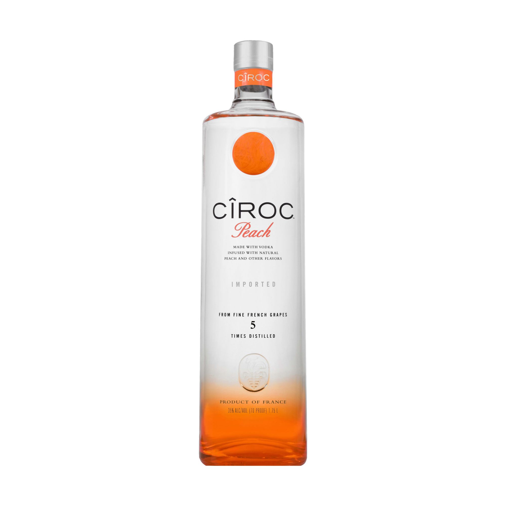 Ciroc Peach is a rich tasting spirit made with vodka distilled five times from fine French grapes, finished in a tailor-made copper pot still in Southern France. This spirit is masterfully infused with a distinctive blend of peach and other natural flavors, resulting in a taste experience that is lusciously different and elegantly smooth. Perfect for a Peach Bellini cocktail. Ciroc was named One of the World's Best-Selling Vodkas at the 2020 Drinks International awards. Includes one 70 proof 1.75 L bottle of Ciroc Peach. Please drink responsibly.
