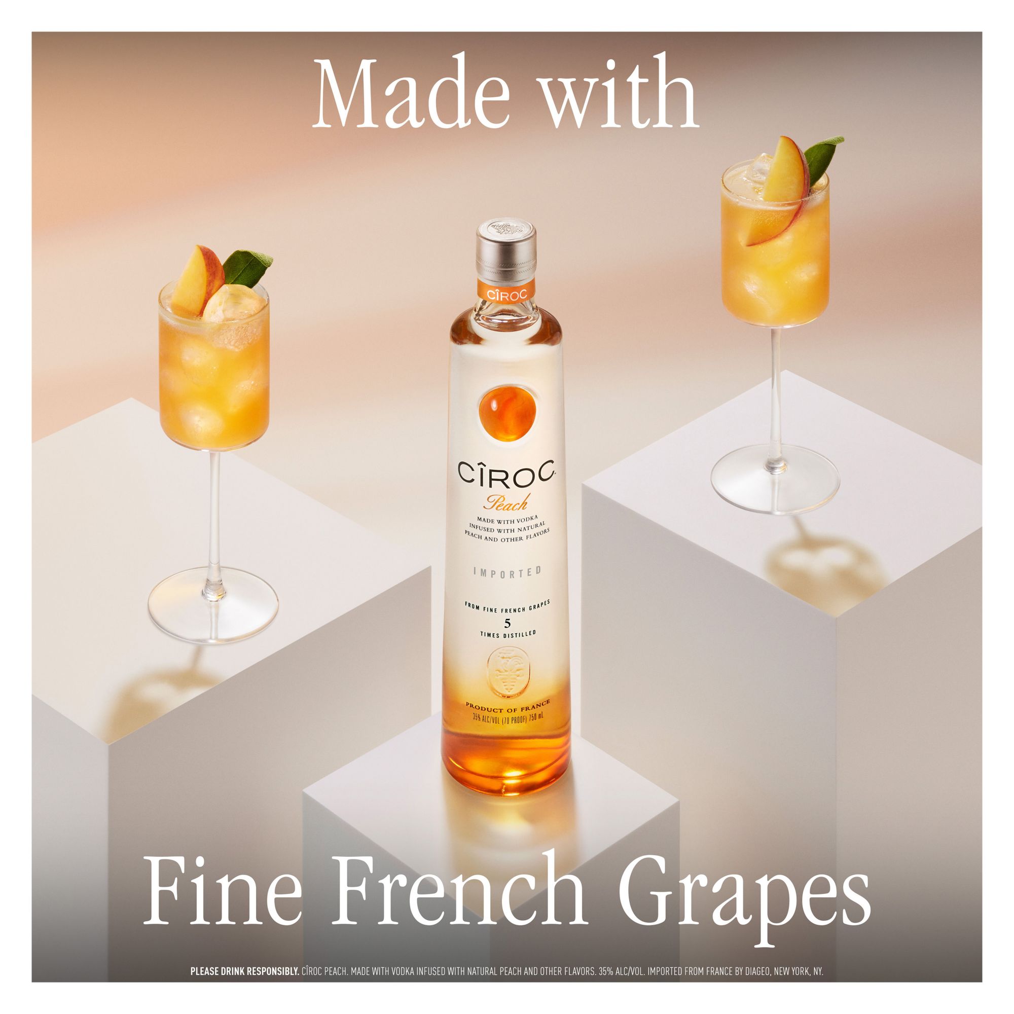 Ciroc Peach is a rich tasting spirit made with vodka distilled five times from fine French grapes, finished in a tailor-made copper pot still in Southern France. This spirit is masterfully infused with a distinctive blend of peach and other natural flavors, resulting in a taste experience that is lusciously different and elegantly smooth. Perfect for a Peach Bellini cocktail. Ciroc was named One of the World’s Best-Selling Vodkas at the 2020 Drinks International awards. Includes one 70 proof 1.75 L bottle of Ciroc Peach. Please drink responsibly.