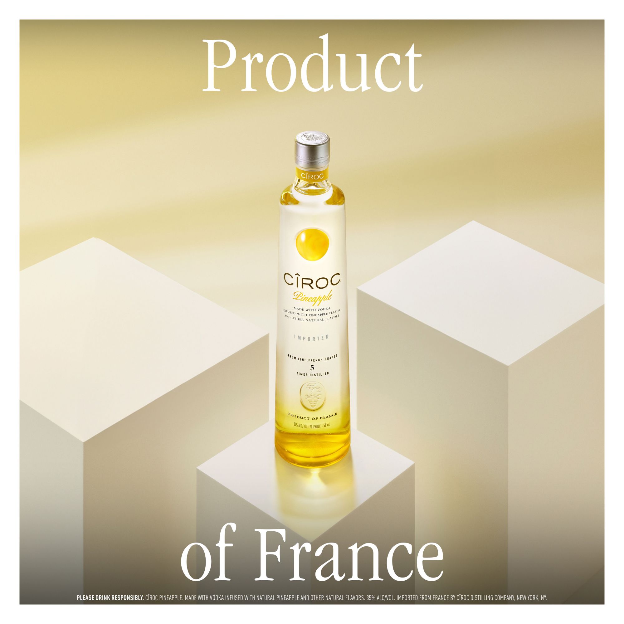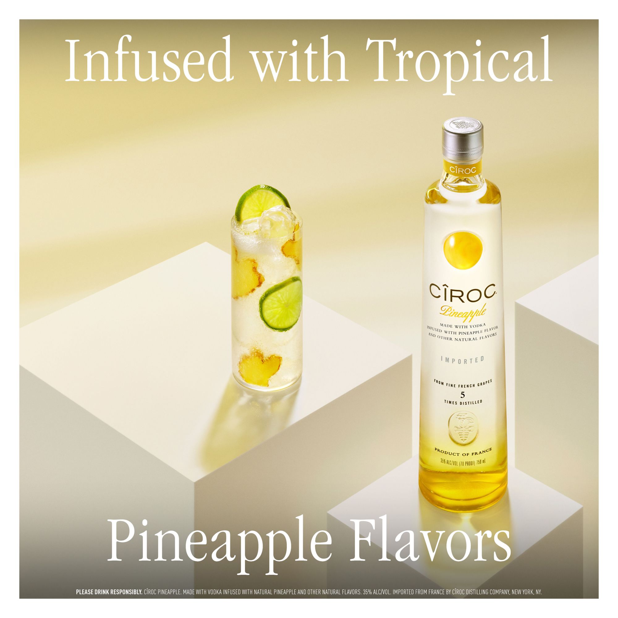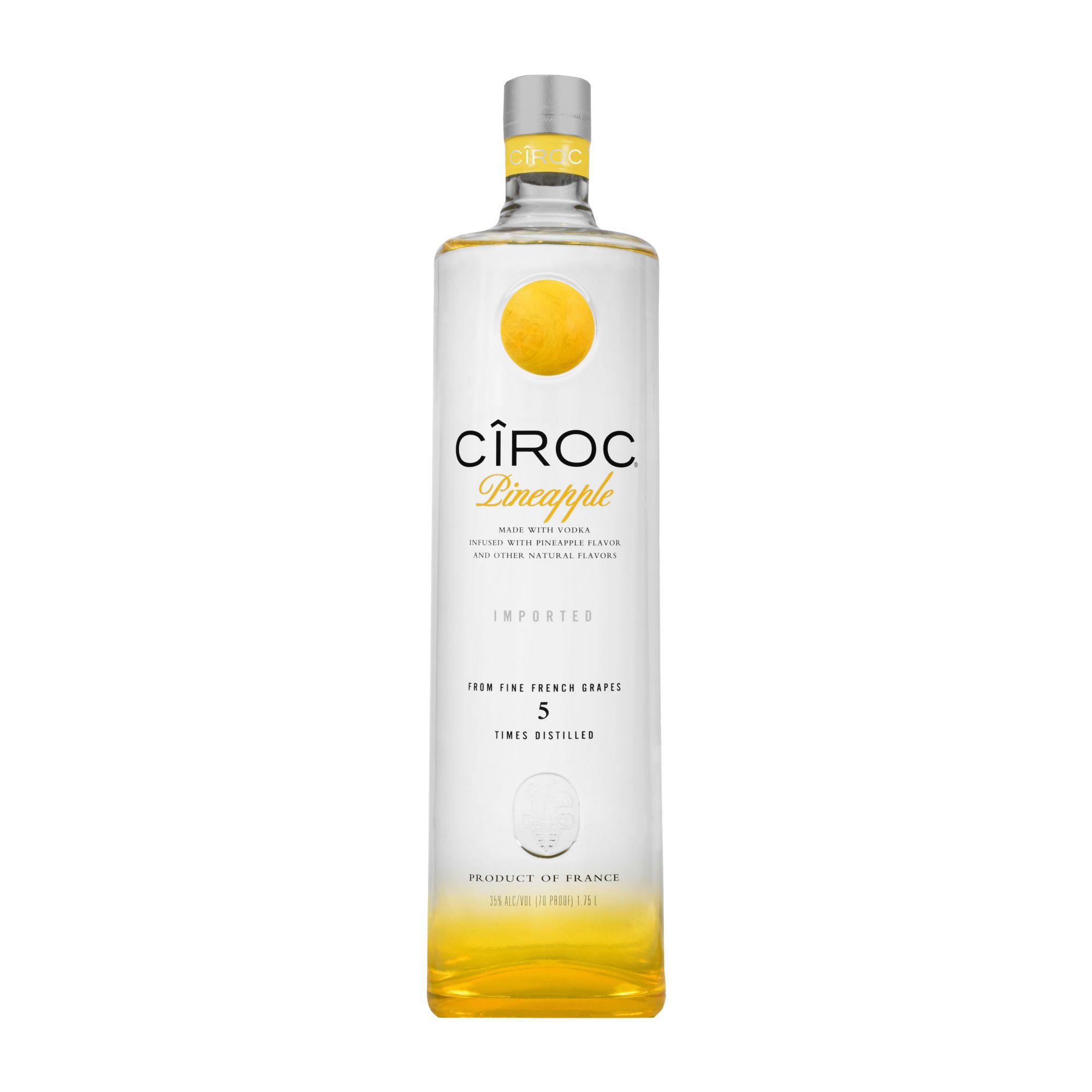 Ciroc Pineapple is a rich tasting spirit made with vodka distilled five times from fine French grapes, finished in a tailor-made copper pot still in Southern France. This spirit is masterfully infused with a distinctive blend of pineapple and other natural flavors, resulting in a taste experience that is lusciously different and elegantly smooth. Perfect for any vodka soda. Includes one 70 proof 1.75 L bottle of Ciroc Pineapple. Please drink responsibly.