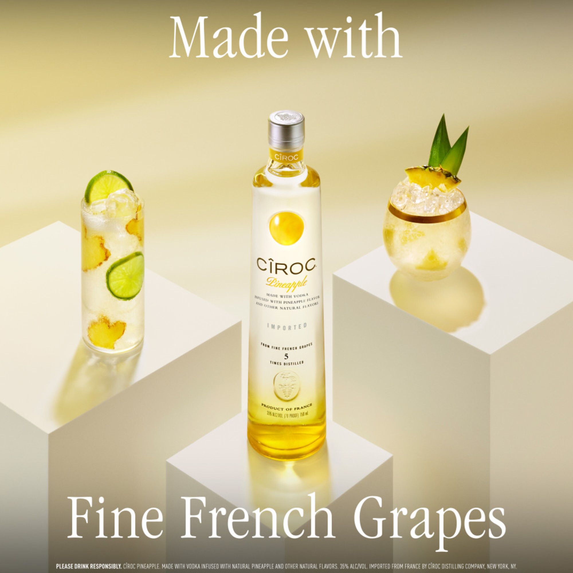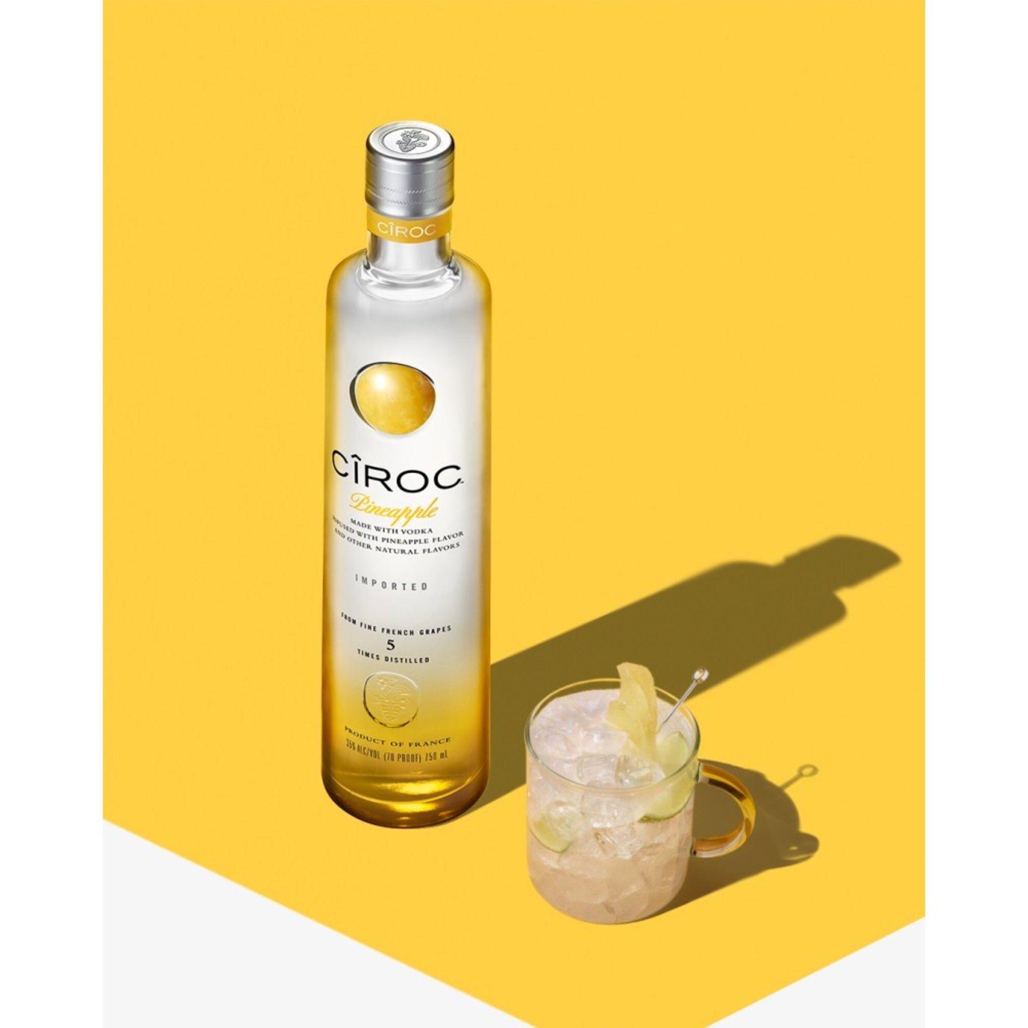 Ciroc Pineapple is a rich tasting spirit made with vodka distilled five times from fine French grapes, finished in a tailor-made copper pot still in Southern France. This spirit is masterfully infused with a distinctive blend of pineapple and other natural flavors, resulting in a taste experience that is lusciously different and elegantly smooth. Perfect for any vodka soda. Includes one 70 proof 750 mL bottle of Ciroc Pineapple. Please drink responsibly.
