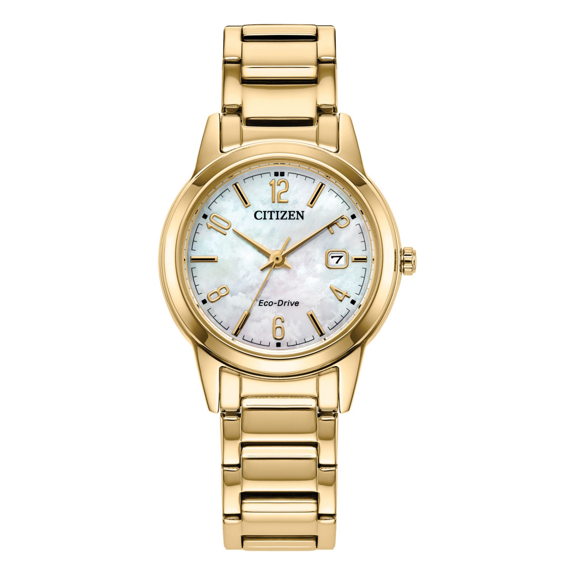 This timepiece from Citizen's Classic collection has a clean, modern style that can easily transition from business to leisure without missing a beat. Featuring a 29mm gold-tone stainless steel case and mineral crystal, Mother-of-Pearl dial with radially positioned numerals and subtle date window fastened to a Gold-tone stainless steel bracelet with push-button fold-over clasp and 30 meter water resistance. Sustainably powered by any light with proprietary Eco-Drive technology that never needs a battery.