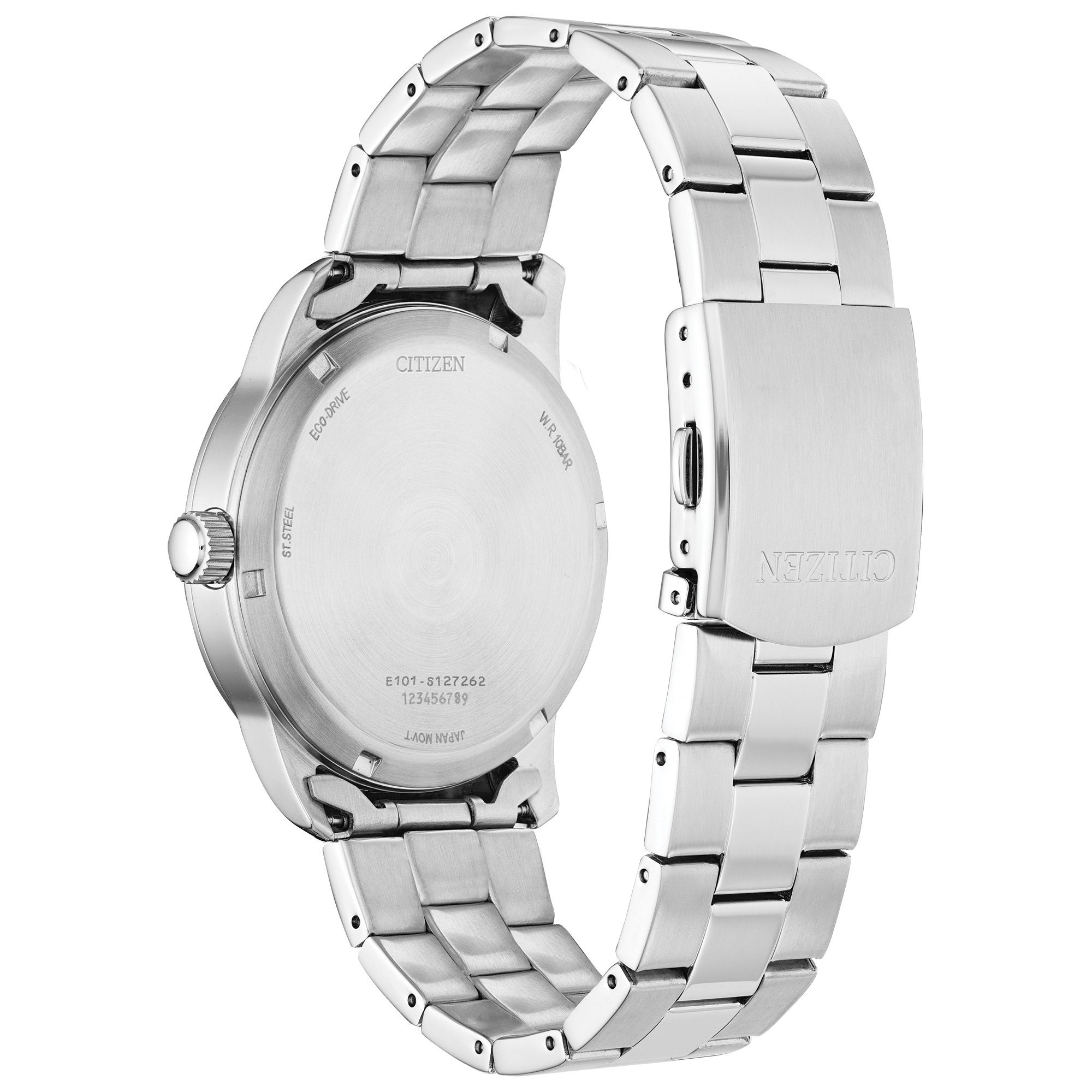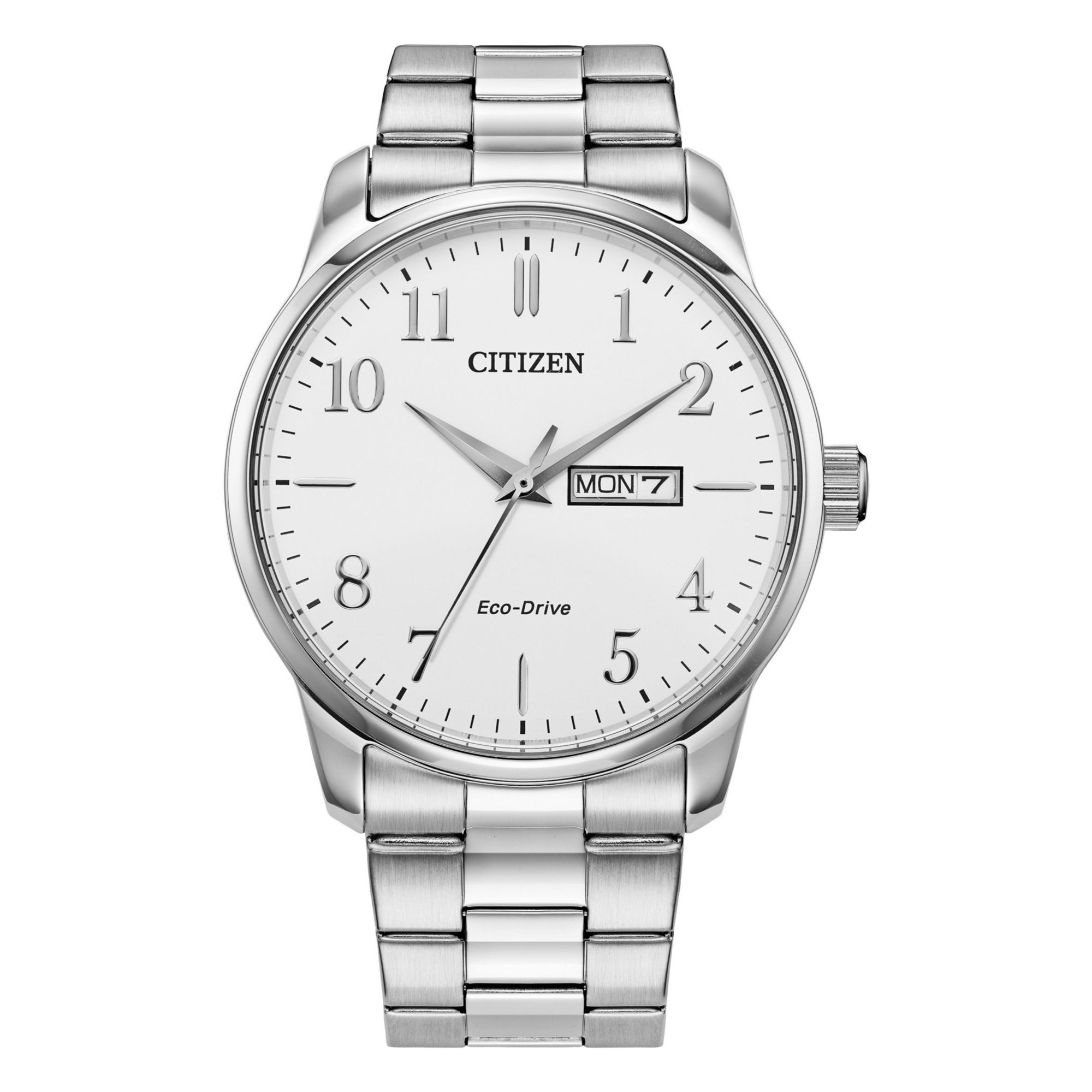 The Citizen's Men's Eco Drive watch features three-hand, day/date, silver-tone stainless-steel case. It also has a mineral glass crystal, stainless-steel screw down caseback (room for engraving) with silver tone stainless-steel crown. There is a push button fold over clasp with white tone dial, silver tone hour, minute and second hands.