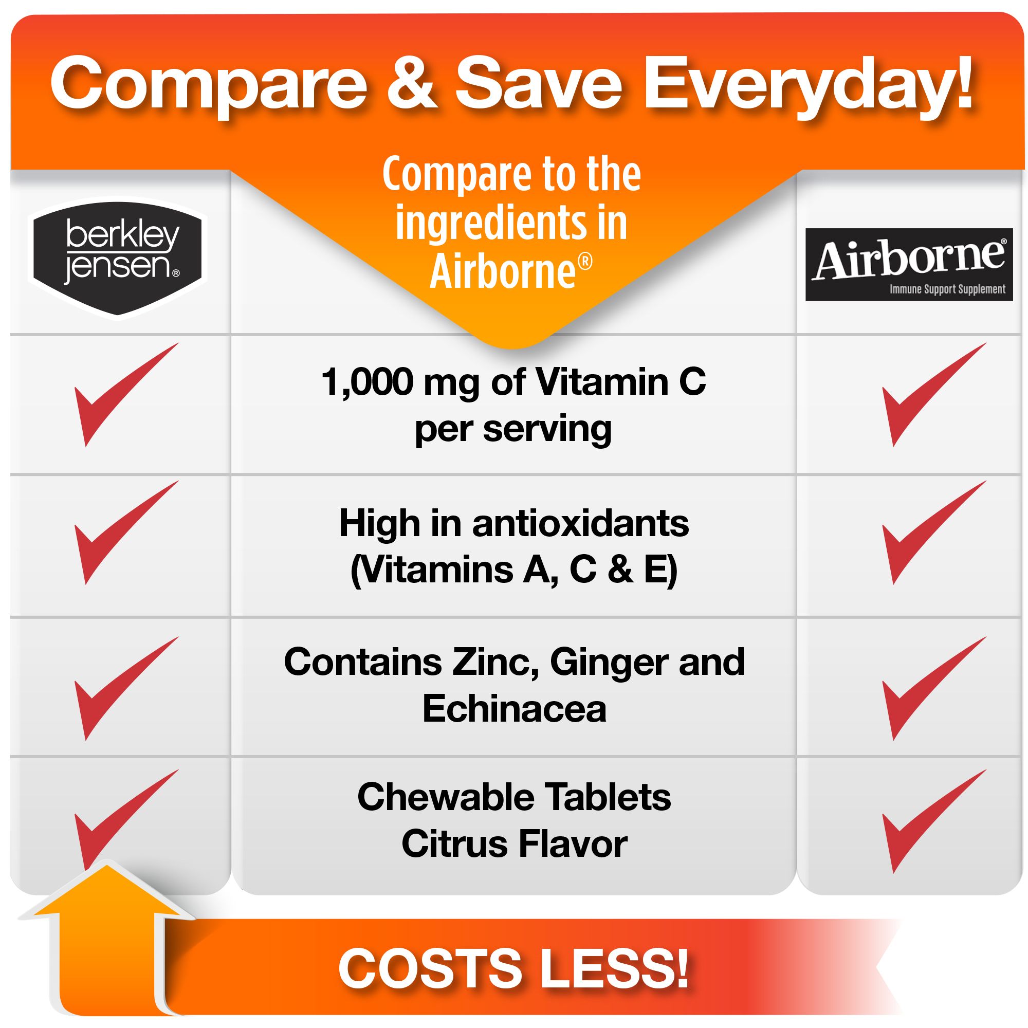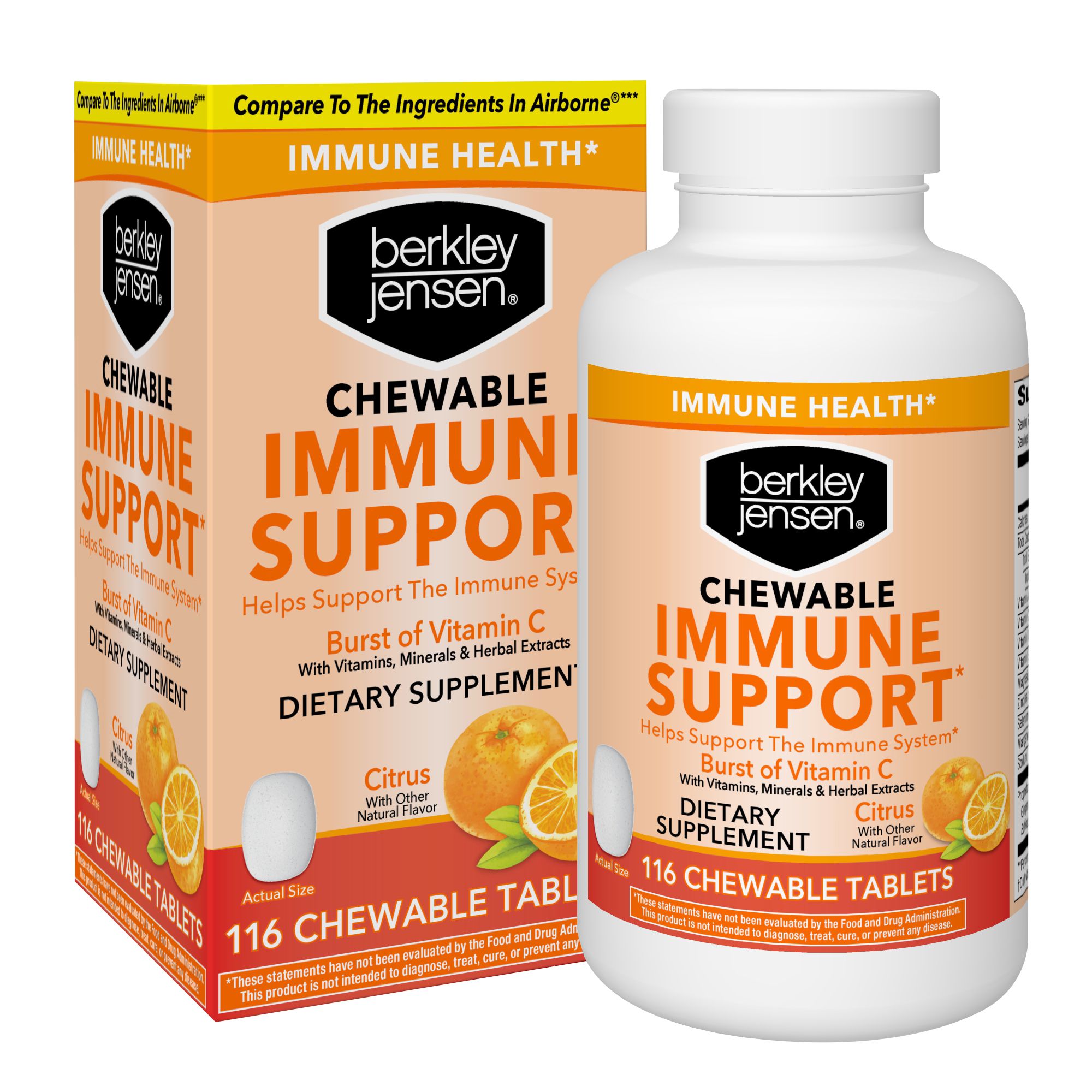 A custom blend of 10 vitamins, minerals, and herbs, including 1,000mg of vitamin C per serving Vitamin D: Immune support chewable tablets are an excellent source of the body-essential sunshine vitamin, vitamin D Dietary supplement: Help support your immune system every day One serving of four tablets provides an excellent source of vitamin C Four chewable tablets provide a powerful serving of vitamin c, vitamin d, zinc, selenium, antioxidants, ginger, echinacea, and more compare to the ingredients in airborne chewable tablets Convenient: Chewable tablets offer a convenient way to support immune system health Perfect for those on the go with a busy schedule They can be taken without food or water Citrus: The tasty immune support tablets are citrus flavored with other natural flavors Includes citrus immune support chewable tablets