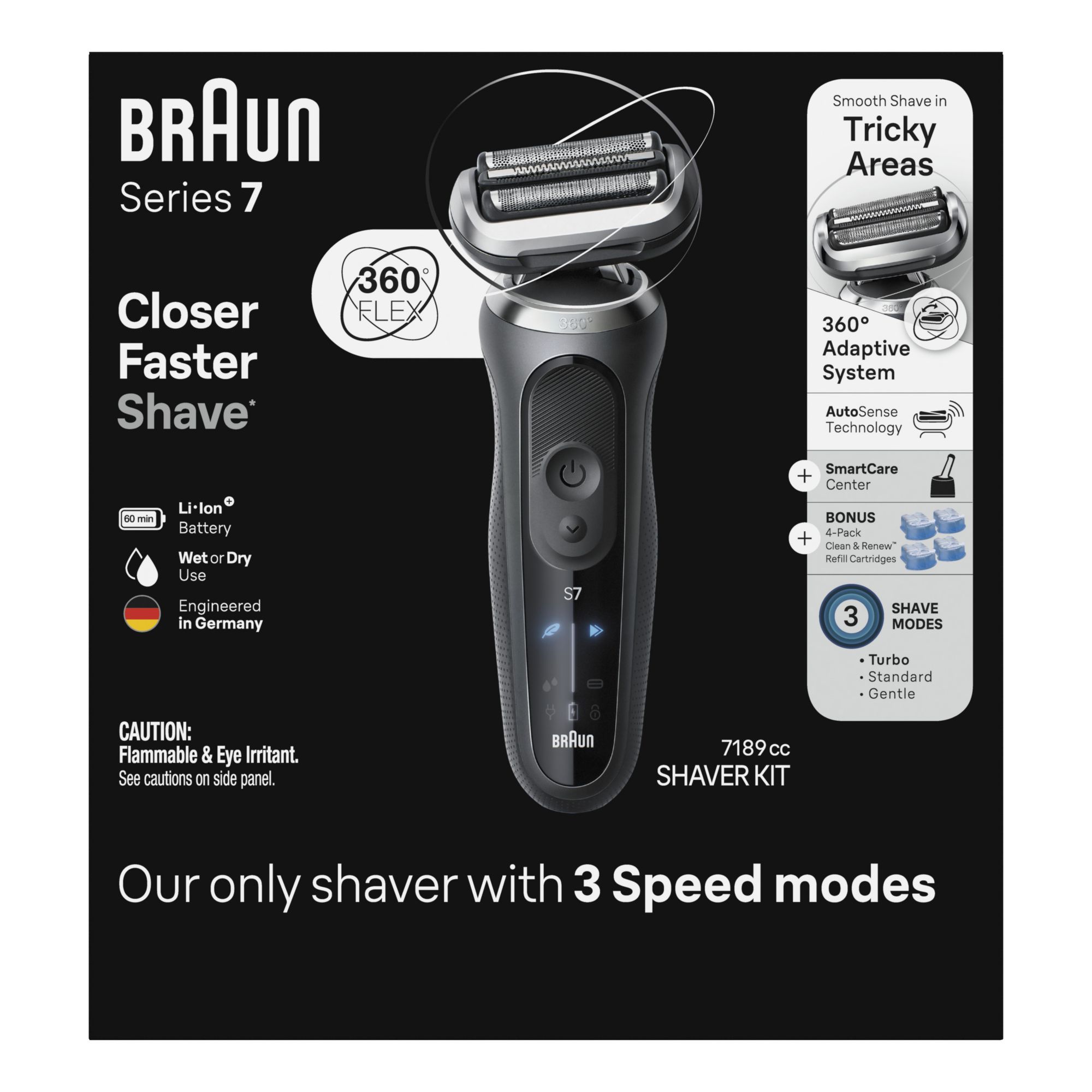 Braun Series 7 7189cc electric shaver for men delivers a close shave, faster* thanks to the floating 360 degree adaptive system: flex head and 3 flexible blades that adapt to your unique facial contours for an extremely close shave, even in tricky areas, while also protecting your skin. To easily customize your shave, select turbo mode for an extra fast shave, gentle mode for a gentle shave on sensitive skin, or standard mode for a balanced shave. Made to adapt to your shaving needs, this electric shaver features AutoSense technology that adjusts power to your beard density and is 100% waterproof, so perfect for wet and dry use. It also has a 60-minute long-lasting Li-ion battery runtime and a quick 5-minute recharge. The men's shaver's durable design is engineered in Germany for guaranteed quality and built to last. Easily upgrade your shaver with different one-click attachments for all your grooming needs. Includes a Clean and Charge SmartCare center for a shaver-like new, every day, along with 4 Clean and Renew refill cartridges. The SmartCare center helps clean, hygienically, charge, and lubricate in one go. *vs previous Braun Series 7 shaver. Box includes: 1x Series 7 electric shaver, 1x SmartCare Center, 1x travel pouch, and 5x Clean and Renew refill cartridges.
