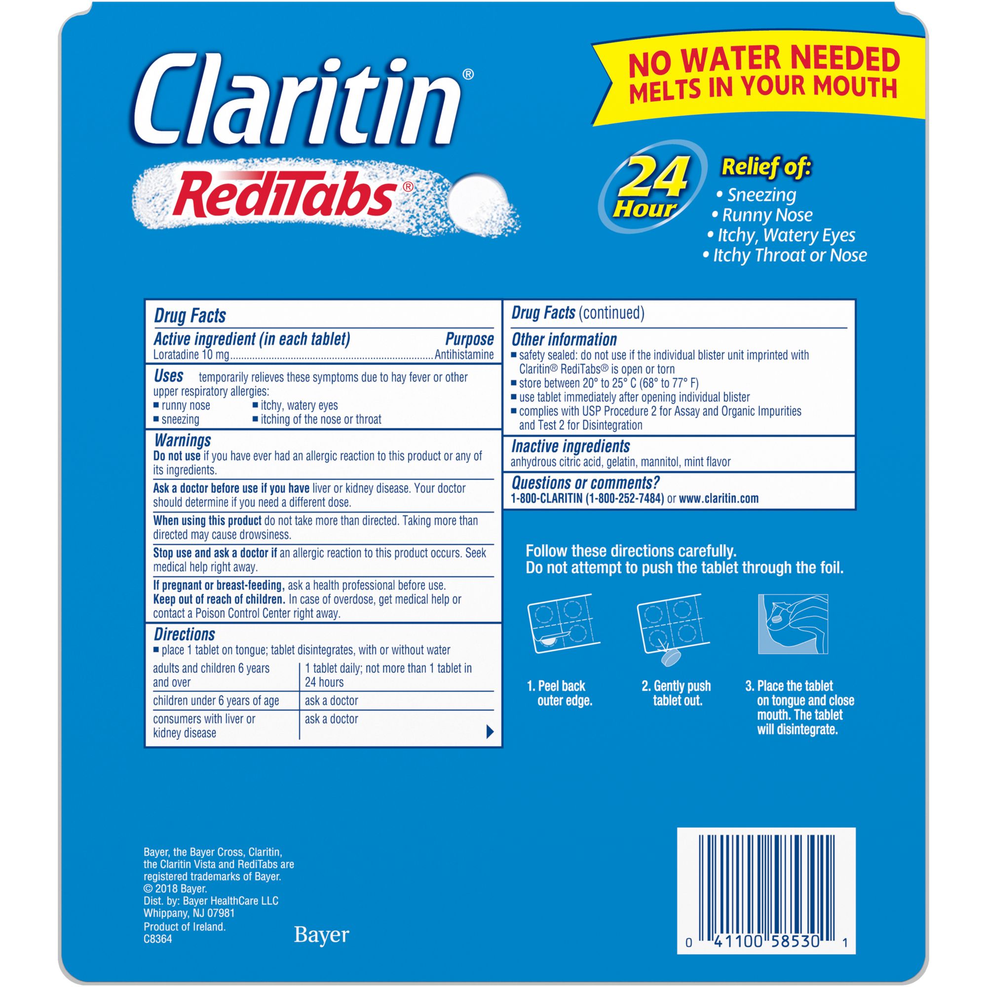 Claritin RediTabs provide powerful, 24 hour, non-drowsy relief of your worst indoor and outdoor allergy symptoms, including sneezing, runny nose, itchy/watery eyes, itchy throat/nose. Claritin provides relief of symptoms that can be triggered by over 200 different allergens. Claritin is an antihistamine, so it hinders the cascade triggered by allergens. Easy-to-take, orally dissolvable tablet, melts in mouth and requires no water. These tablets are made for adults and children ages 6+.